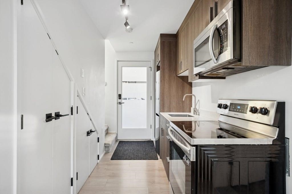 This 586sf, 2 levels, 2 bedrooms, 1 bathroom laneway house has plenty of sunshine with open southern exposure. The foyer, kitchen and living room has light fir laminate floors. The kitchen has one row of veneer cabinets, engineered stone countertops, ceiling track lights, stainless steel appliances and a rectangular under-mount steel sink. Under the staircase are two storage spaces and the laundry set. The living room has a huge window and ceiling track lights. The 2nd bedroom on this floor also has a large...