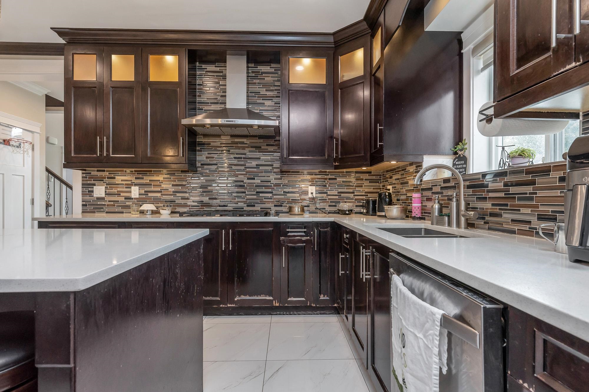 This custom two-story corner lot home features six bedrooms and five bathrooms. The main floor includes a living room with a vaulted ceiling and gas fireplace, a dining room, a family room, and a chef's kitchen. Upstairs are four spacious bedrooms and three bathrooms. The property also includes a separate two-bedroom basement suite with in-suite laundry. Exterior highlights are an oversized garage and a private, fenced yard.