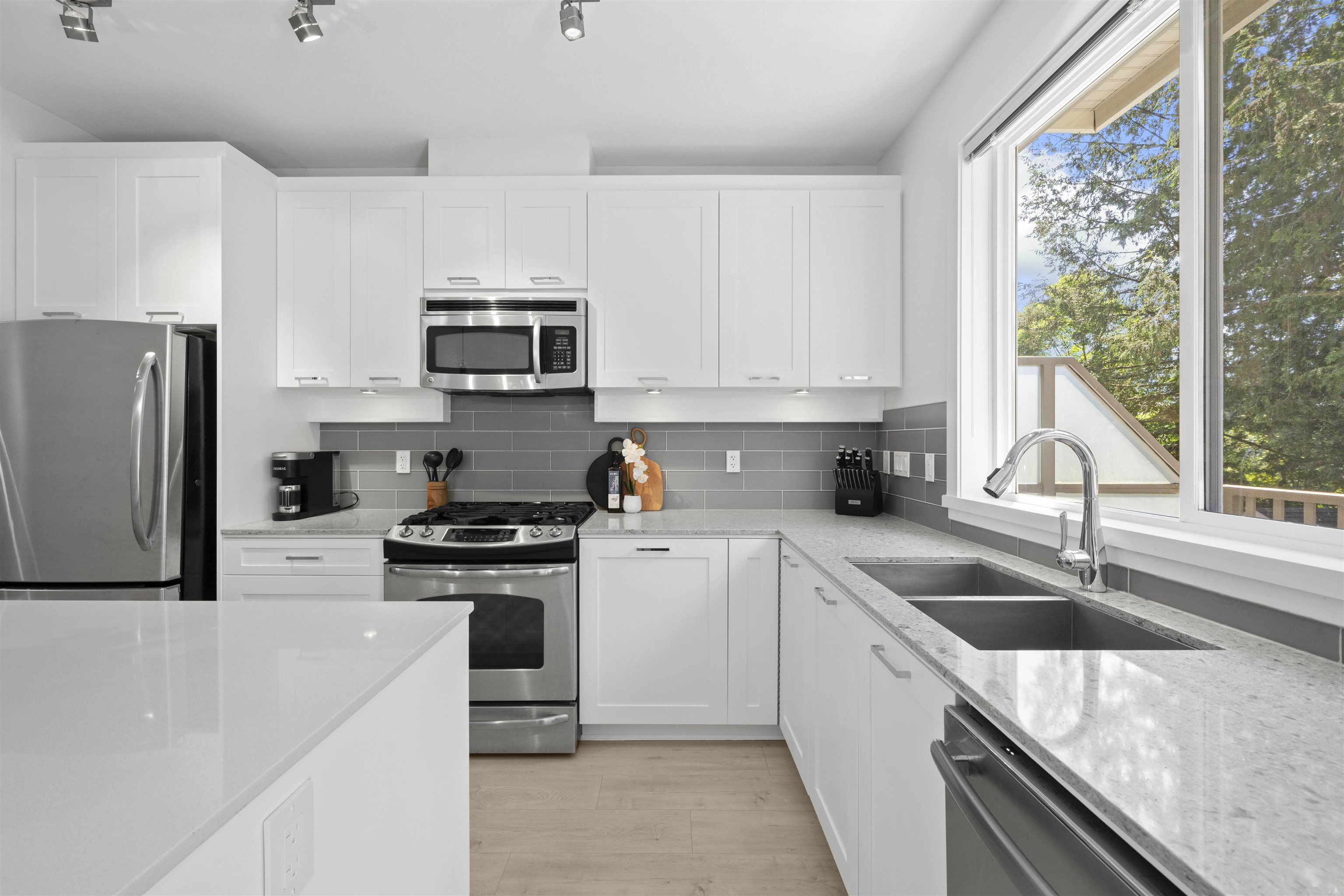 Fabulous Burke Mountain Opportunity! Located on a quiet, tree-lined street just steps to Galloway Park. This bright and updated home features an open-concept floor plan, a modern kitchen with quartz countertops, new laminate flooring throughout, fresh designer paint, and a spacious island perfect for entertaining. Enjoy west-facing exposure from the deck off the kitchen - ideal for outdoor dining and BBQs. The generous double tandem garage accommodates two vehicles with additional space for storage, a works...