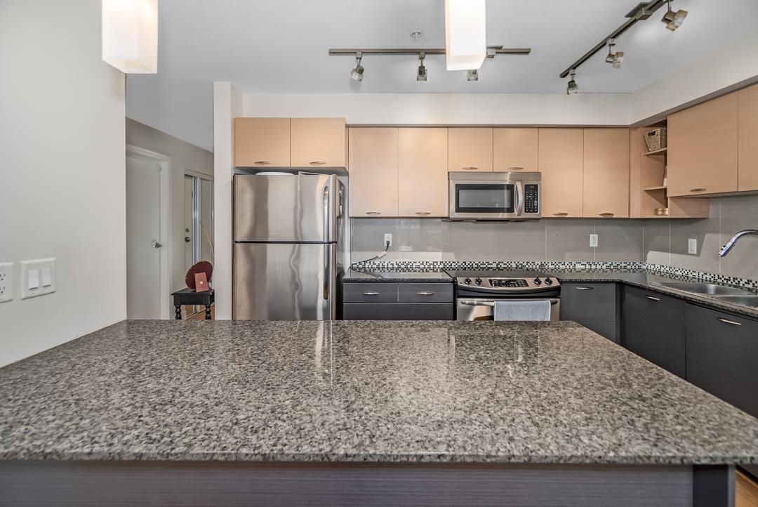 One of the largest and best layouts in the Latitude complex! This rare 2 bedroom + DEN home features a massive chef-inspired kitchen with an abundance of counter space, elegant granite countertops, rich designer cabinetry, and stainless steel appliances—perfect for those who love to cook and entertain. The open-concept dining and living area offers plenty of room to gather, highlighted by an electric fireplace and large windows for natural light. The primary bedroom boasts a walk-in closet and a luxurious e...