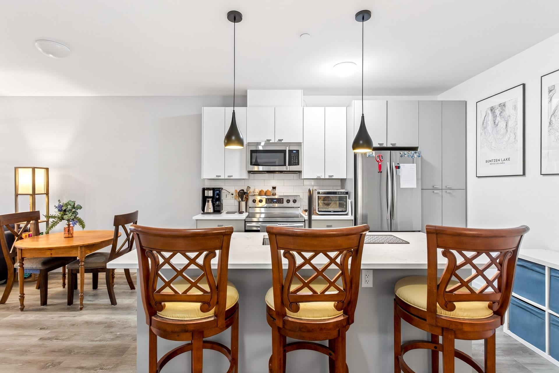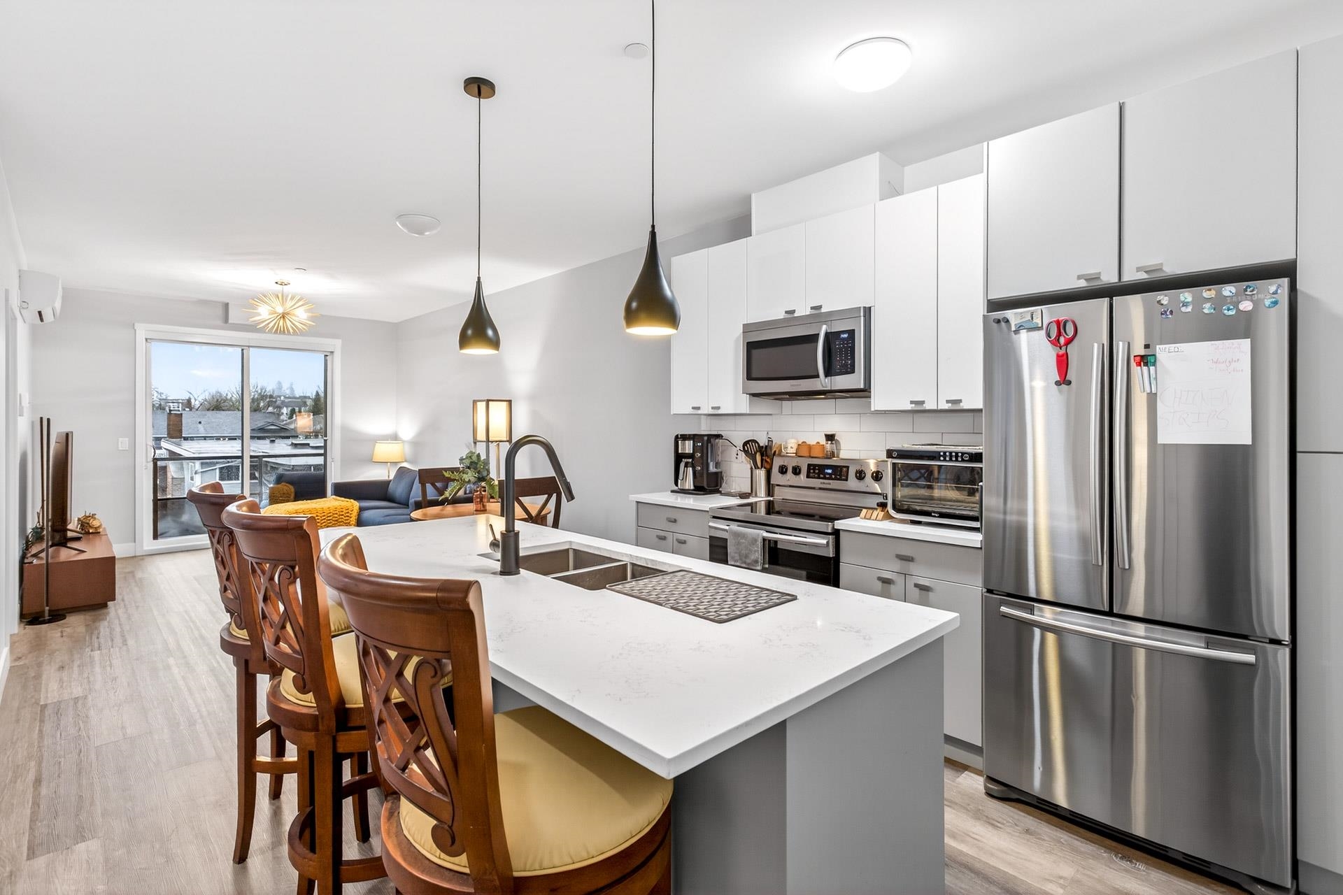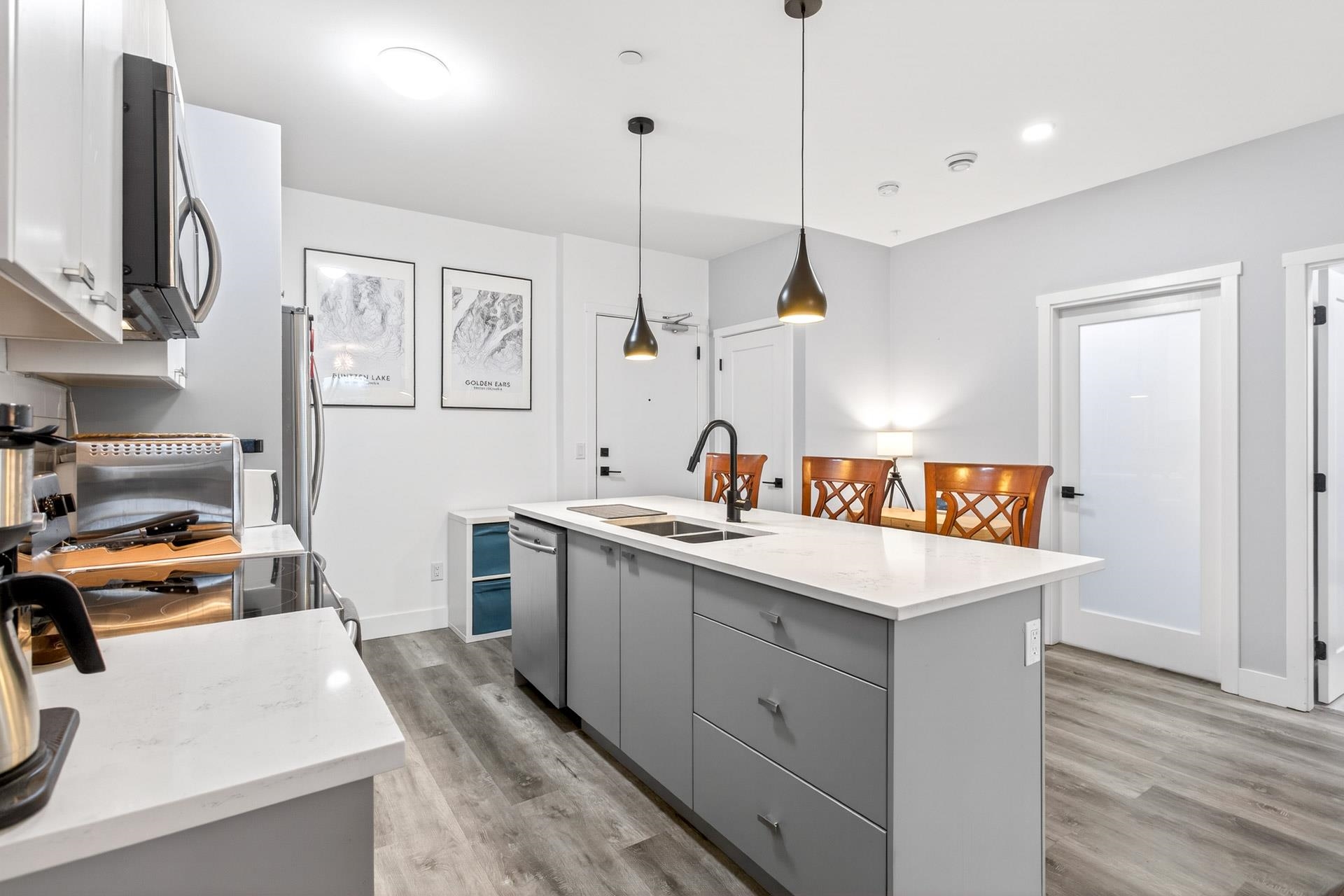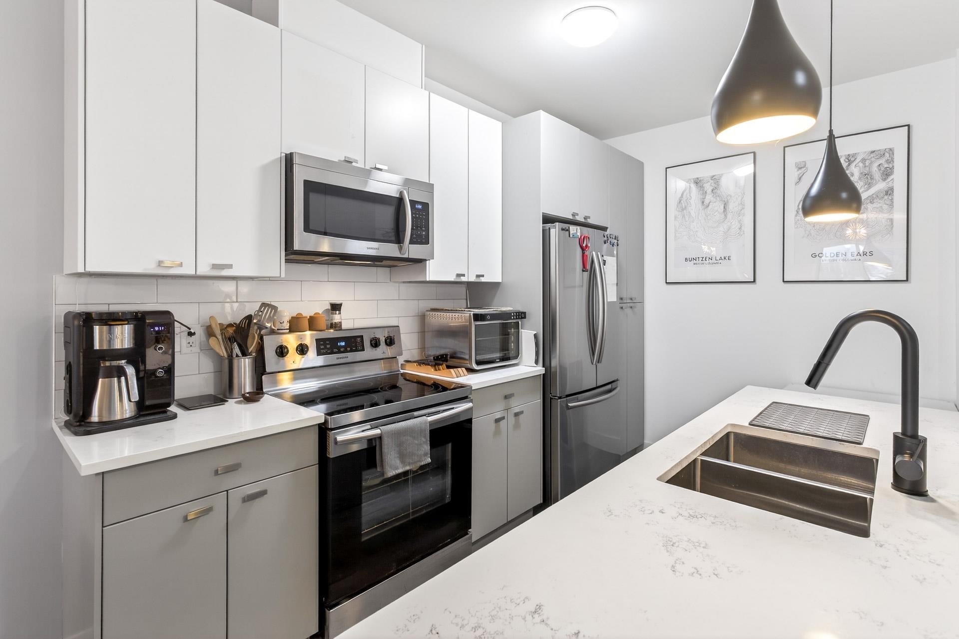 Welcome to this modern 1-bedroom + oversized den, 2-bath home in an ideal Maple Ridge location, minutes from shops, restaurants, transit and everyday essentials. A 5-year-young, fully rainscreened building, this home offers peace of mind and contemporary comfort. Vinyl flooring flows throughout, while the open kitchen features stainless steel appliances, white quartz countertops, and stylish two-tone white and grey cabinetry. Enjoy year-round comfort with an individually controlled heat pump and air conditi...