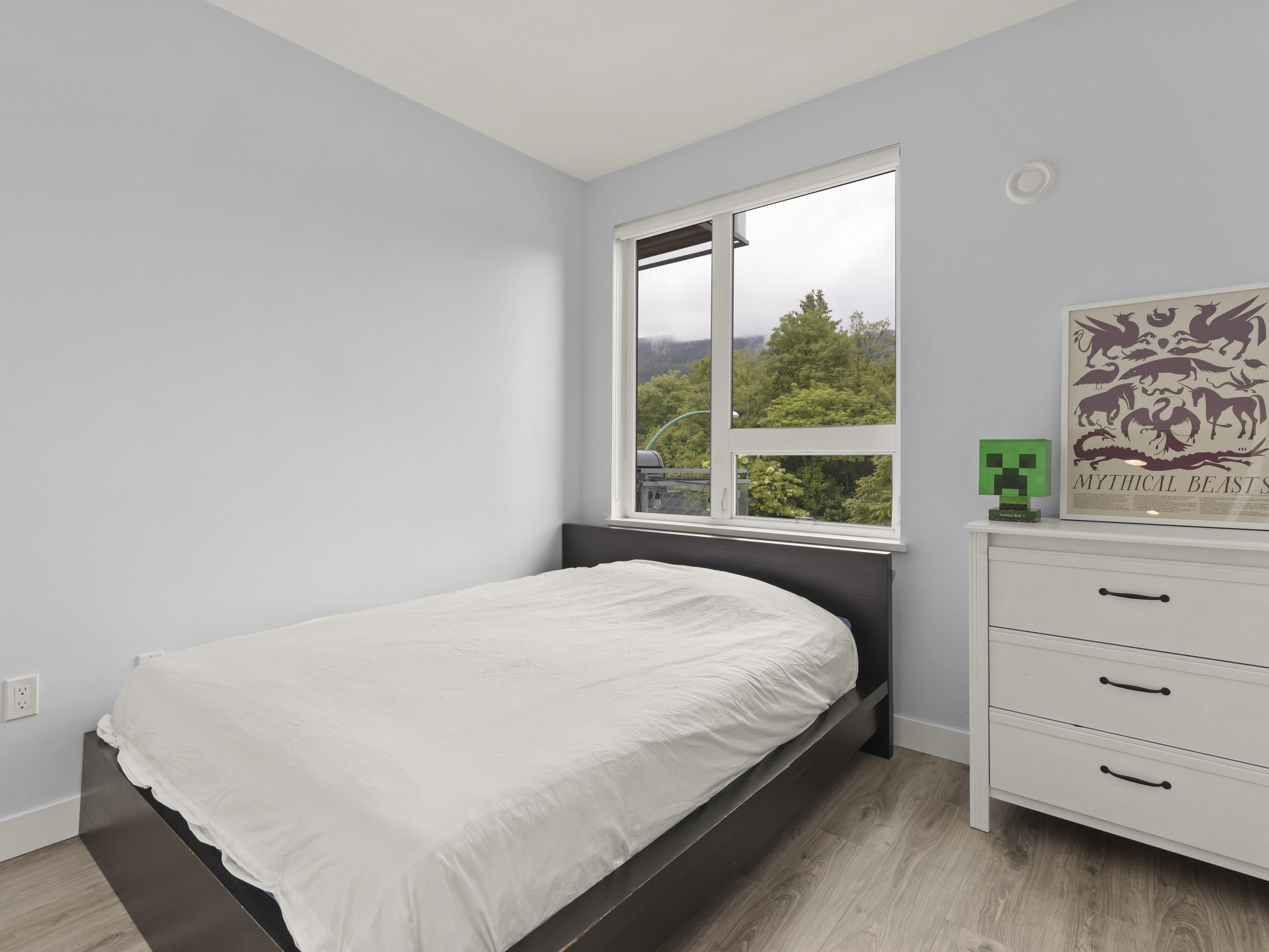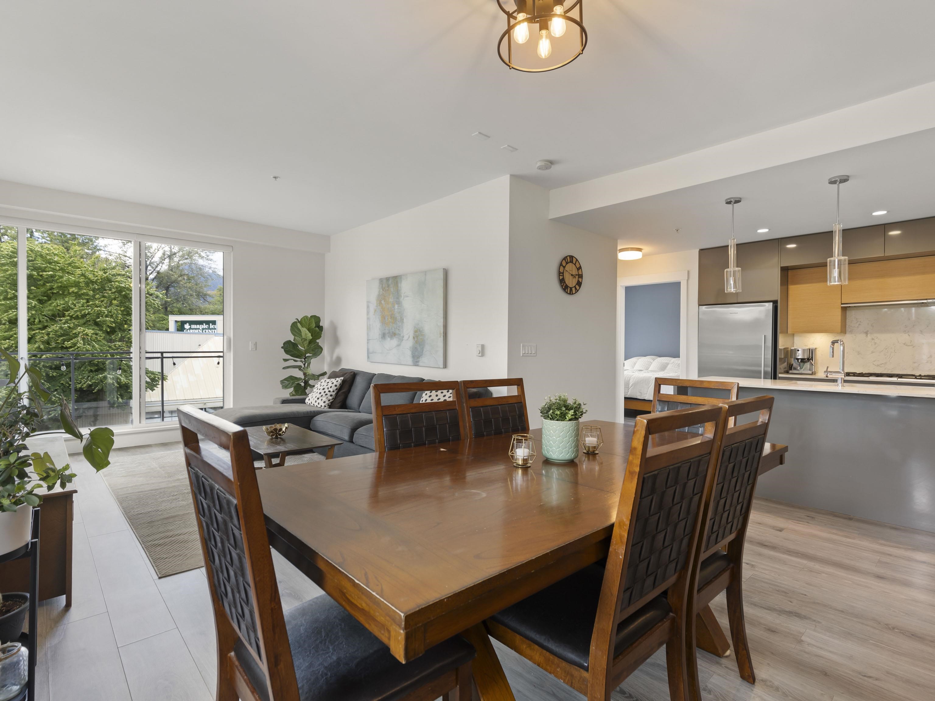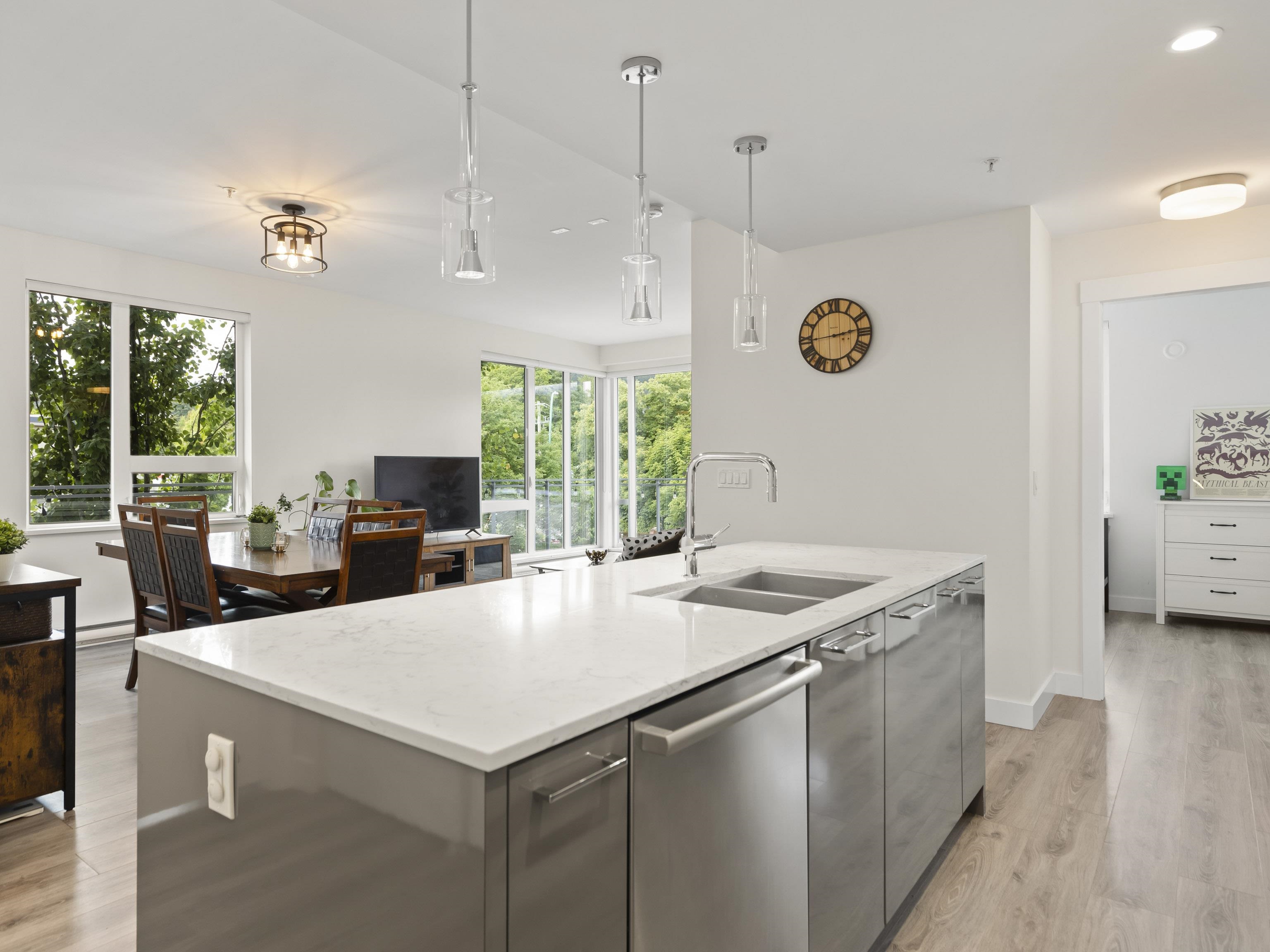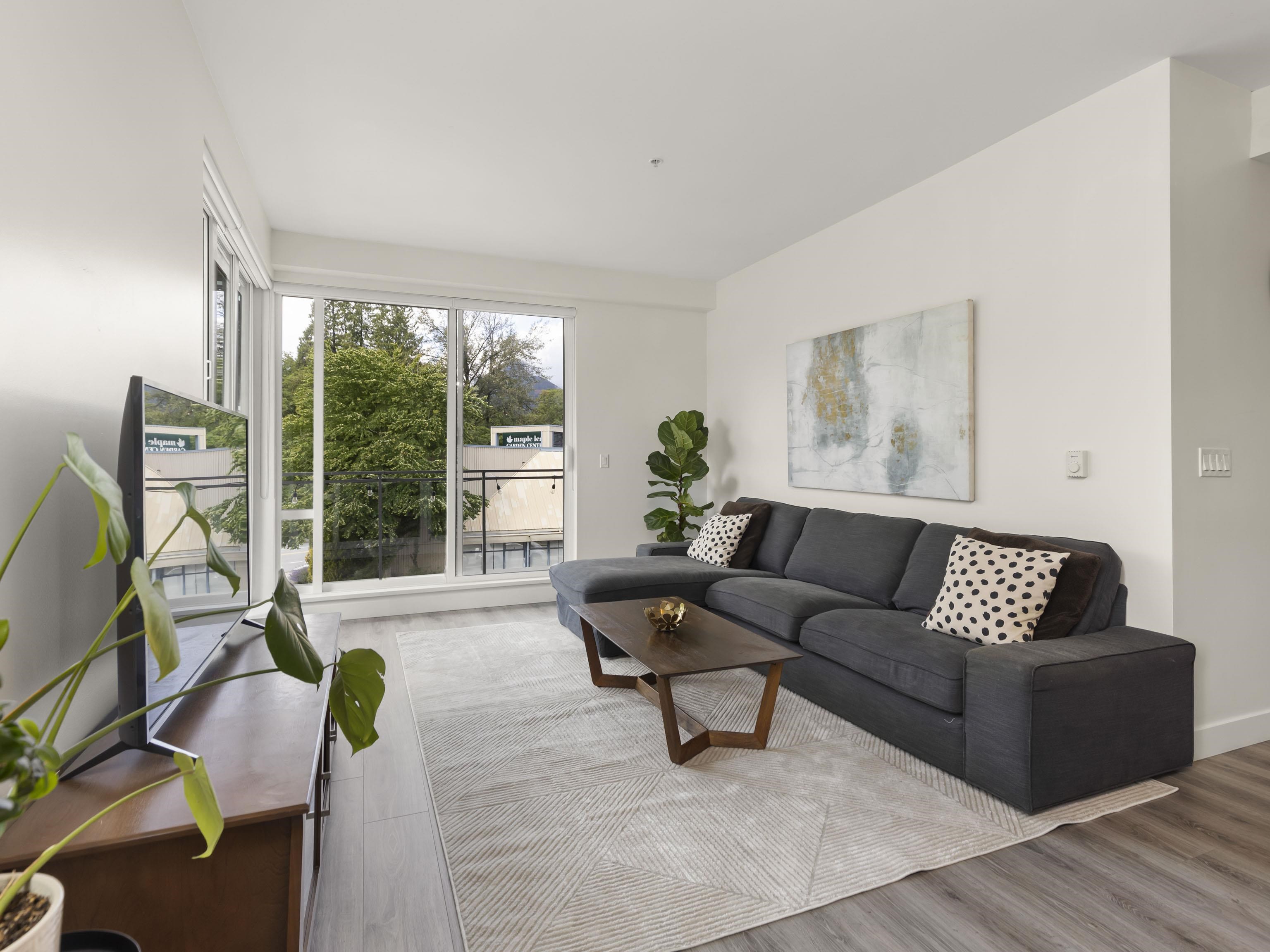 Walter's Place is the place to be in Lynn Valley! Floor to ceiling windows makes this 3 bed + 2 bath corner unit bright & welcoming. Fantastic layout- with a great flow from the foyer to the modern kitchen, lots of space for big family dinners in the dining room, & enjoy mountain views from your living room. 2 outdoor spaces- a balcony runs the length of the living space and then a private balcony off the main bedroom. Insuite Laundry, good closet space, incl walk through closet to ensuite. Well run & worry...