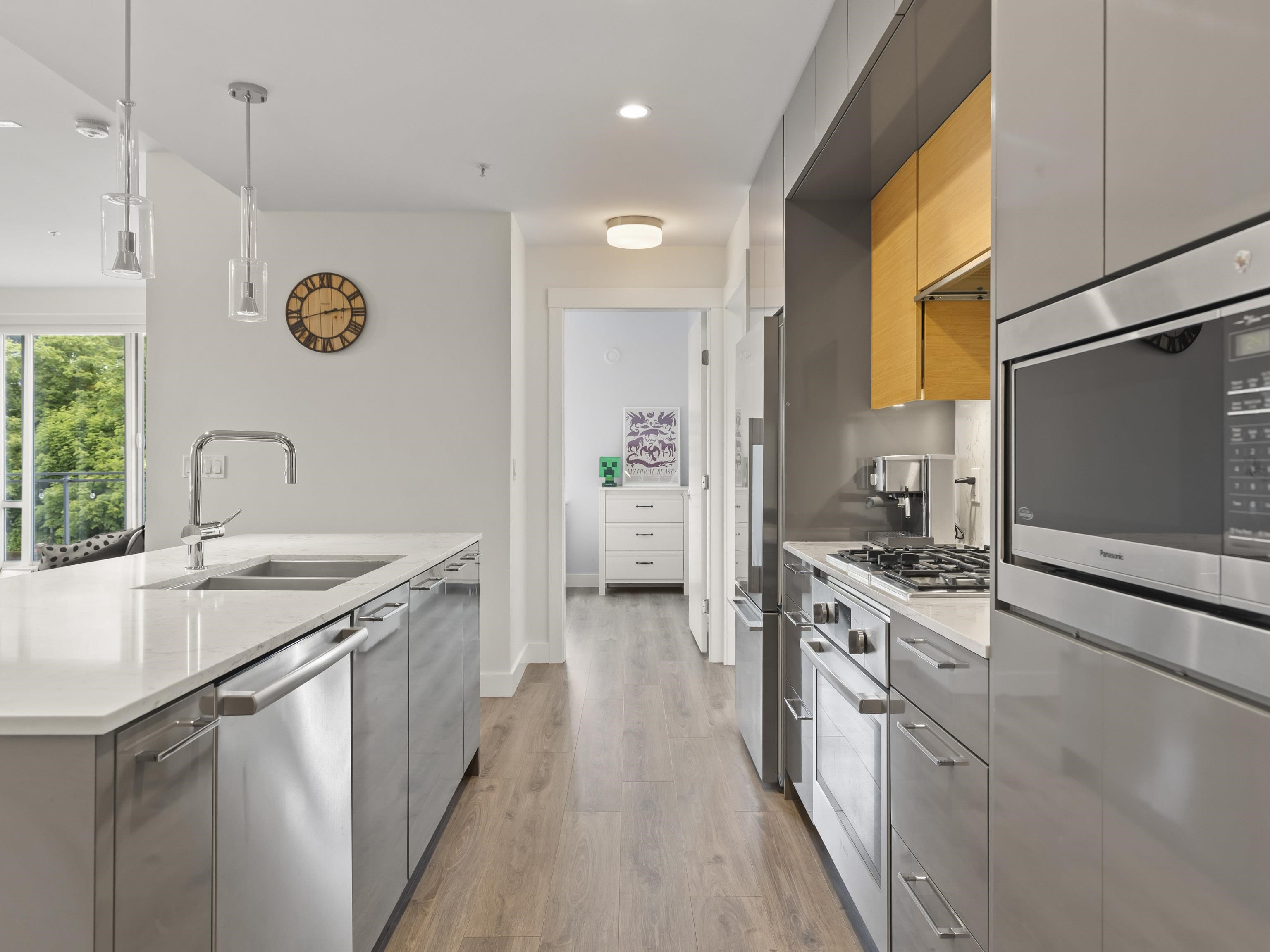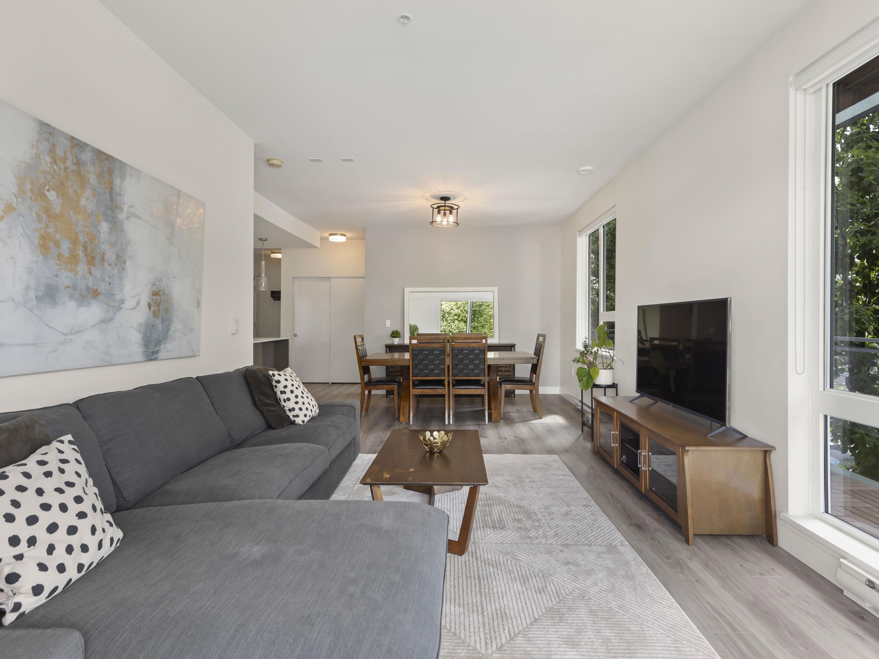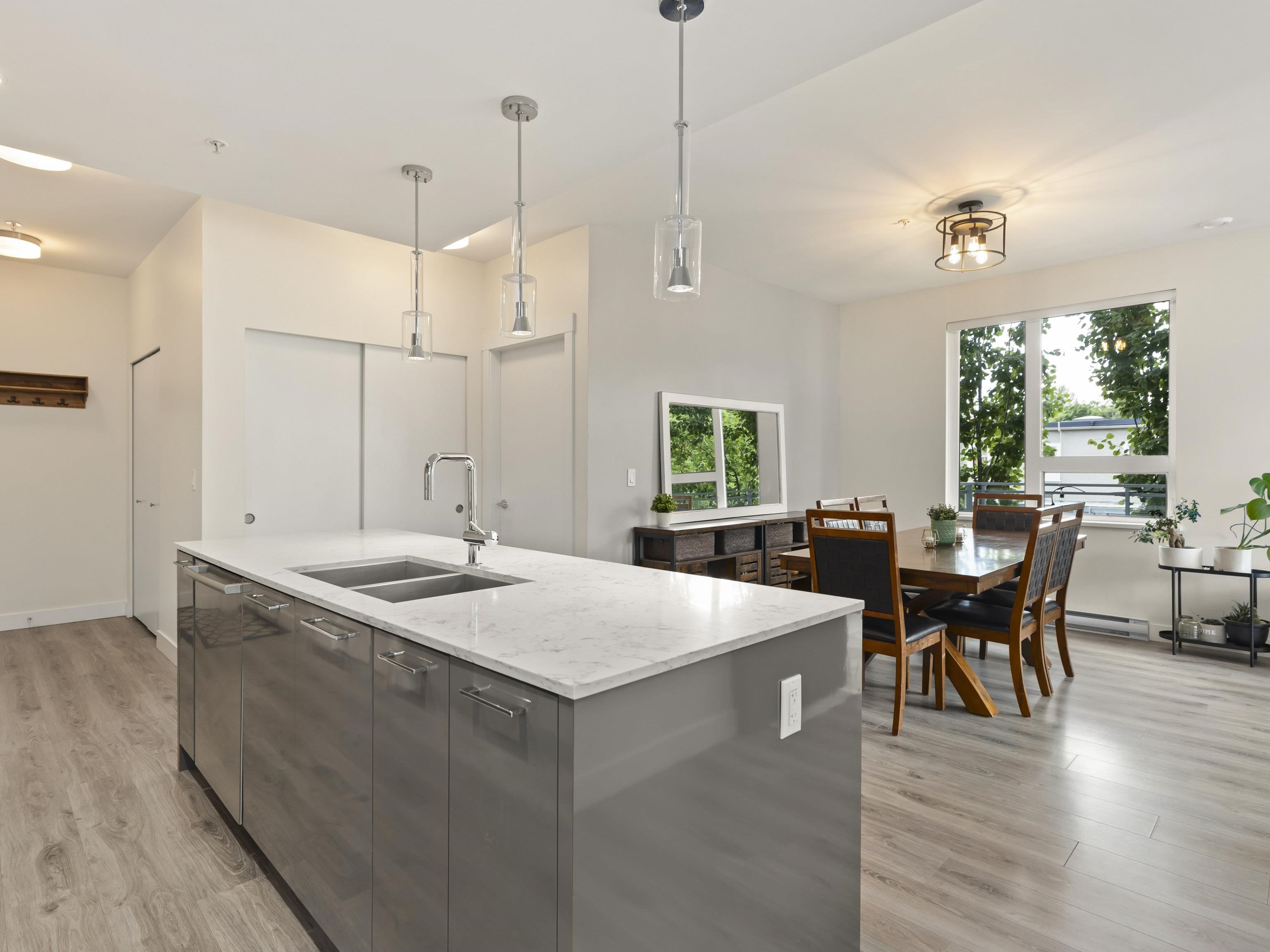 Walter's Place is the place to be in Lynn Valley! Floor to ceiling windows makes this 3 bed + 2 bath corner unit bright & welcoming. Fantastic layout- with a great flow from the foyer to the modern kitchen, lots of space for big family dinners in the dining room, & enjoy mountain views from your living room. 2 outdoor spaces- a balcony runs the length of the living space and then a private balcony off the main bedroom. Insuite Laundry, good closet space, incl walk through closet to ensuite. Well run & worry...