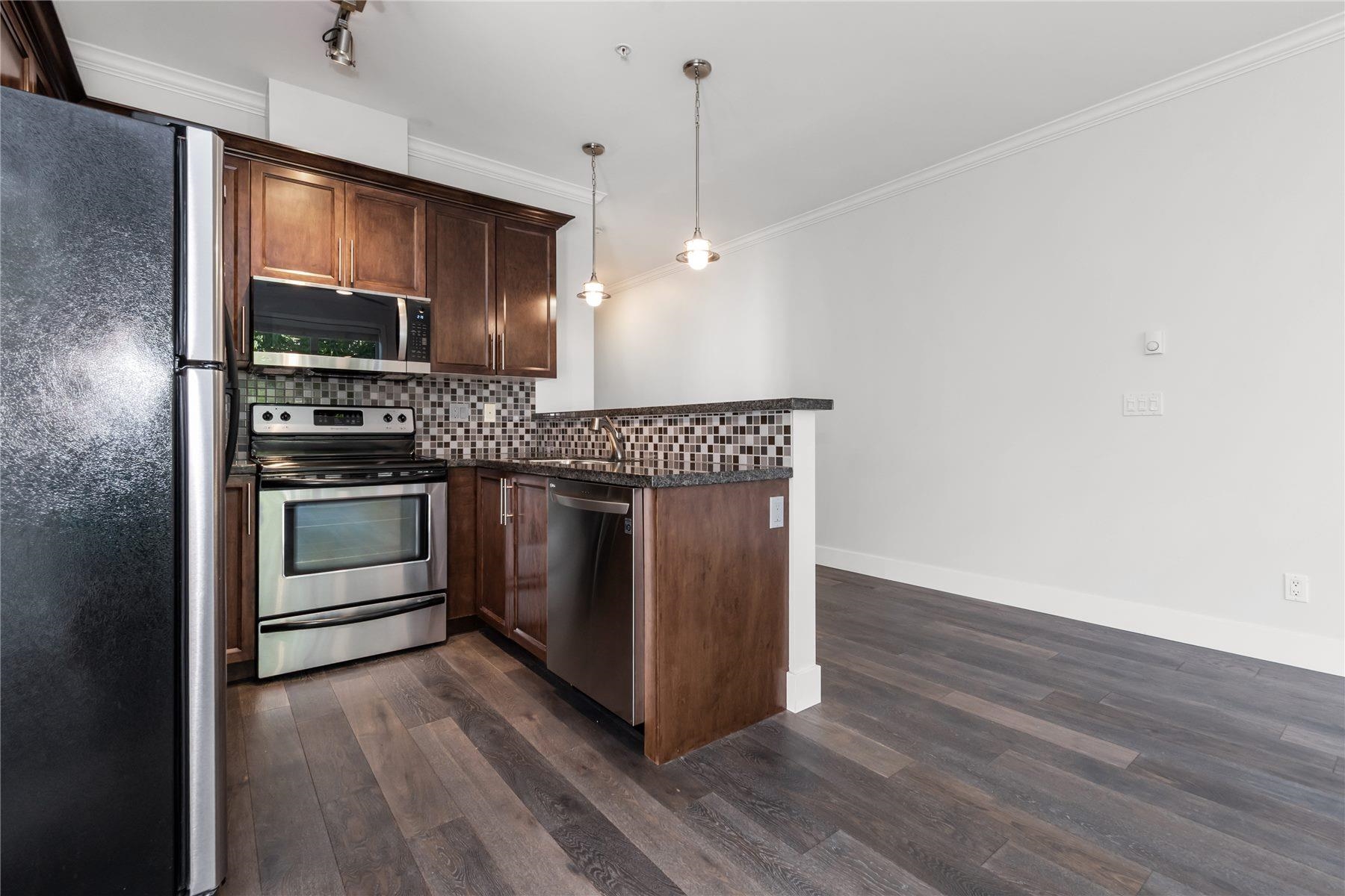 PARK PLACE! Stunning 1 bedroom PLUS den CORNER UNIT condo! South facing, large windows flood the home with natural light. Beautifully maintained home with 9' ceilings, crown moulding, granite countertops, maple cabinets, ss appliances and in-suite storage space! 2025 freshly painted walls throughout. 2018 new Hot Water Tank, High Efficiency Washer & Dryer, Dishwasher, High-End Eng. Hardwood Flooring and baseboards throughout the main living area, new Faucets and Heated Tile Flooring in the Bathroom. No age...