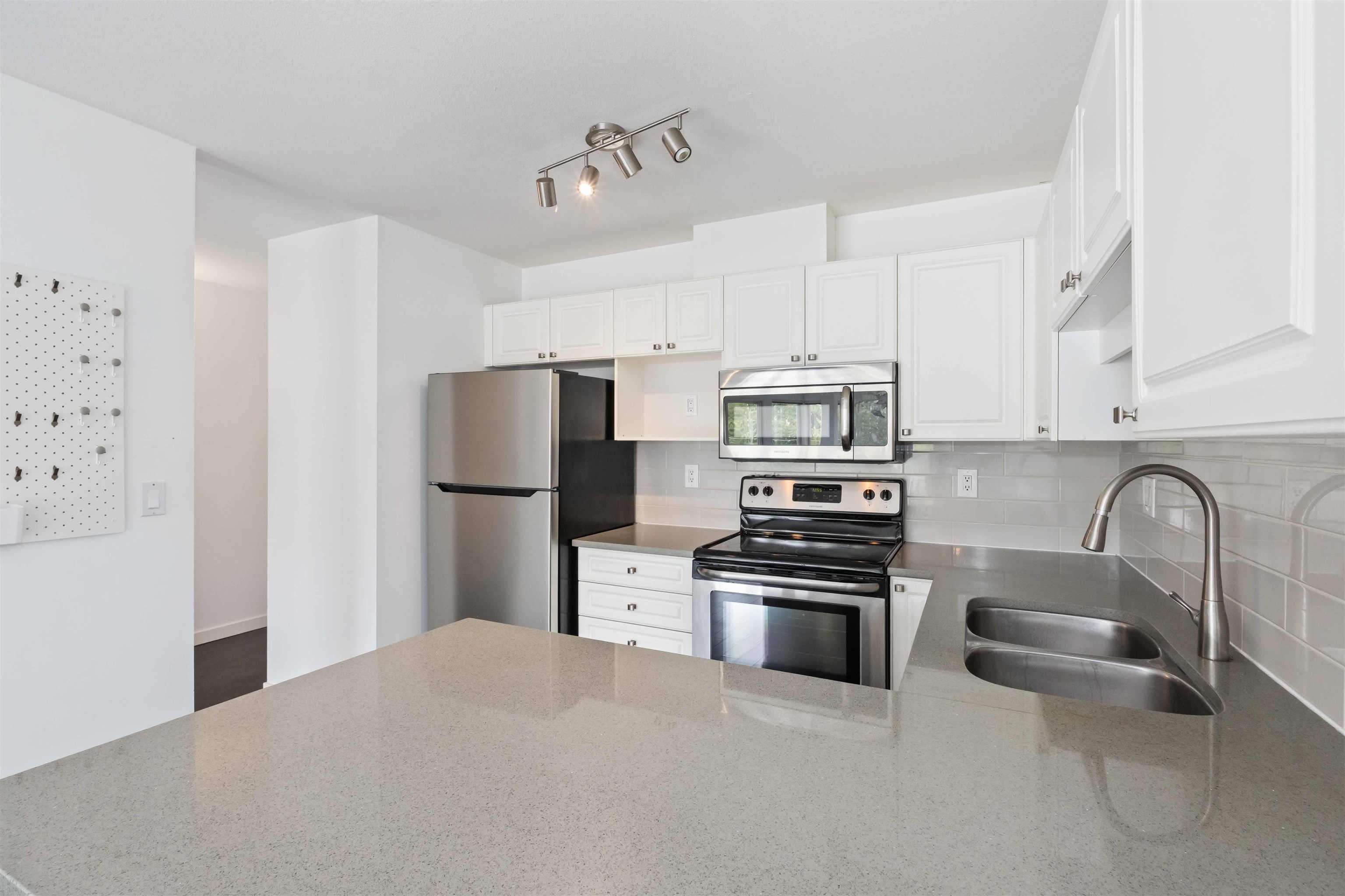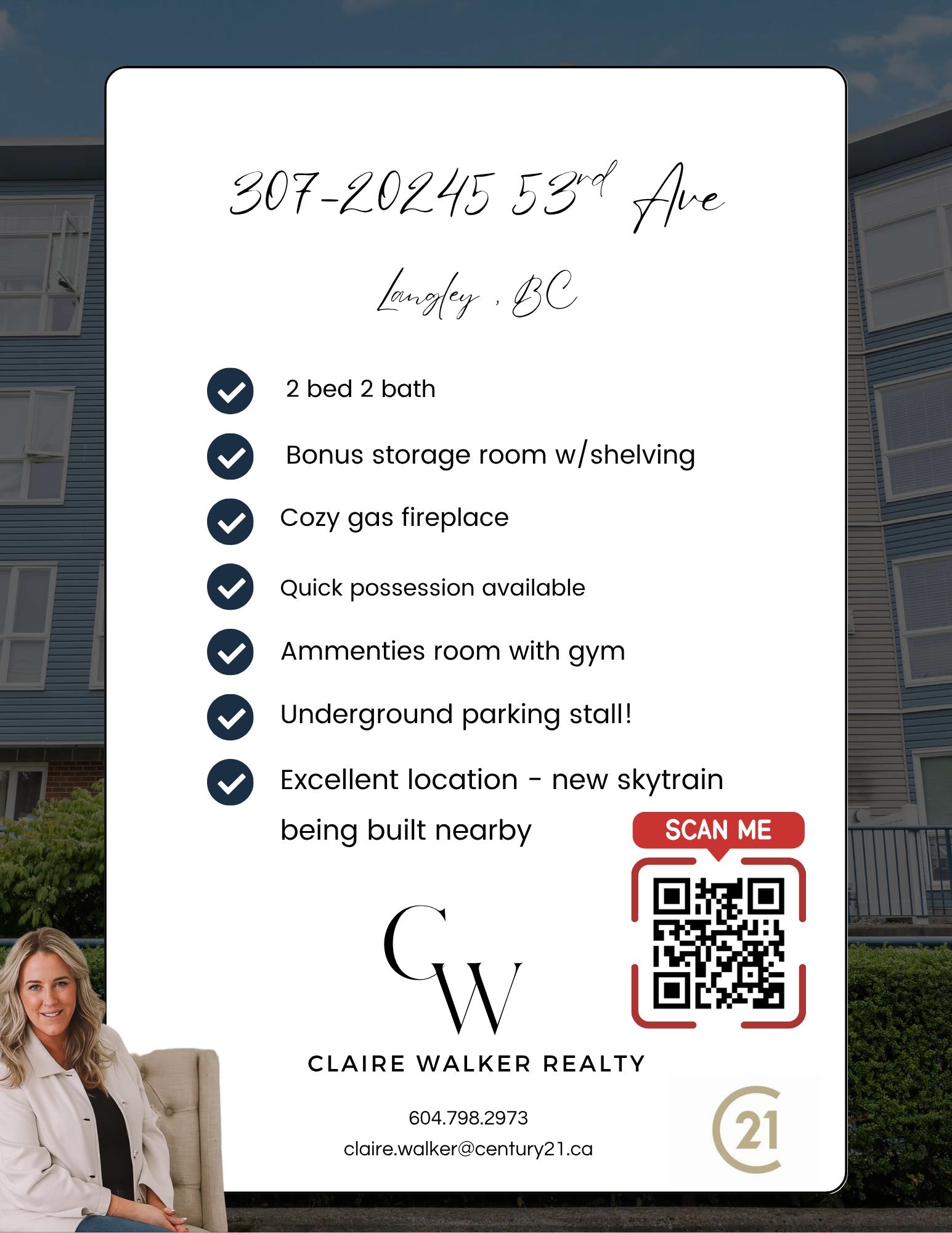 Beautifully maintained 2 bed, 2 bath condo in the heart of Langley! This bright and open-concept home features quartz countertops, ss appliances, garburator in sink, cozy gas f/p, and HUGE windows that fill the space with natural light. The spacious primary bedroom includes a huge w/i closet and private ensuite with tub. You’ll love the oversized in-suite storage room with shelving, bonus space! Includes 1 u/g parking stall, pet and rental friendly—2 pets up to 35 lbs. Unbeatable location close to schools, ...