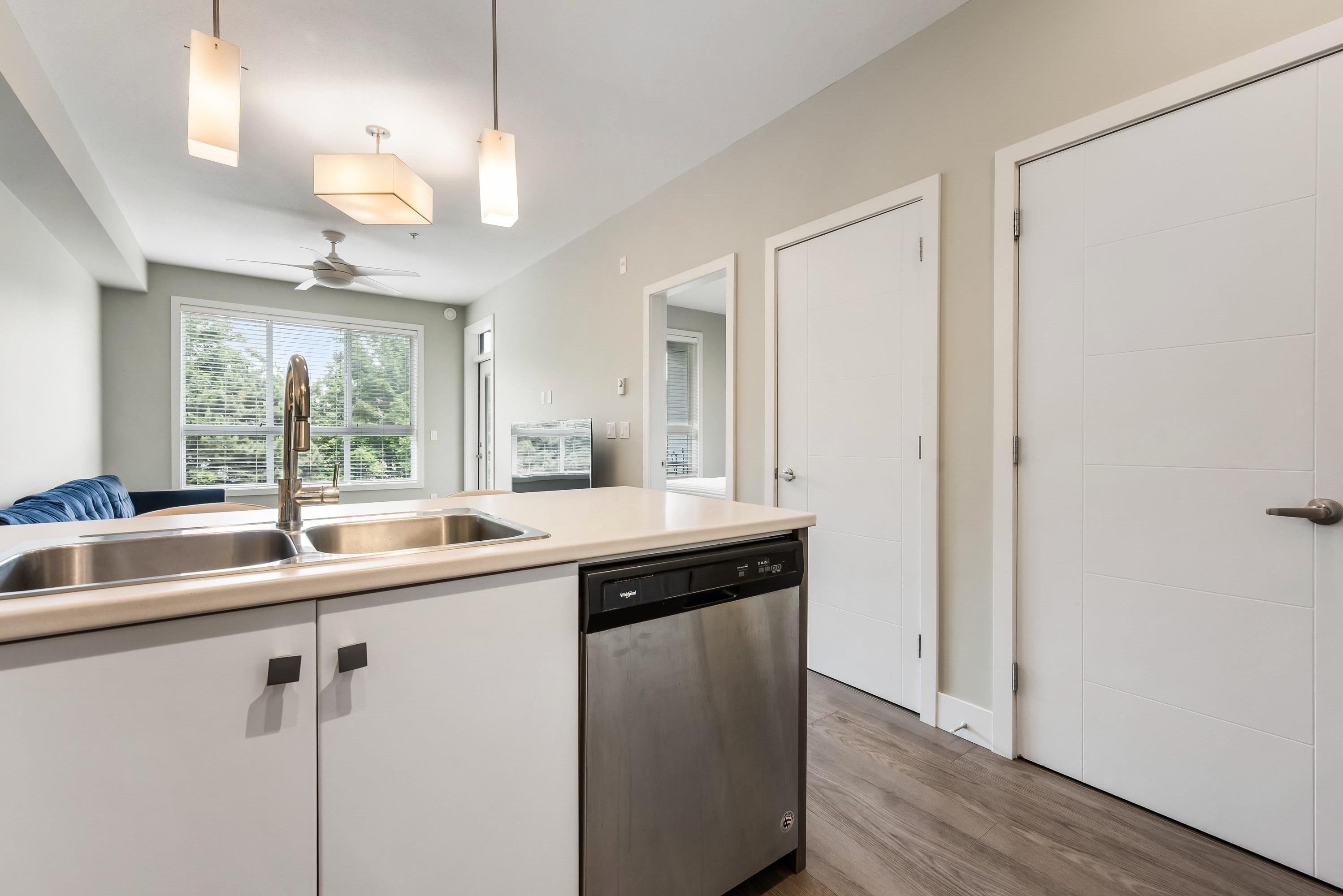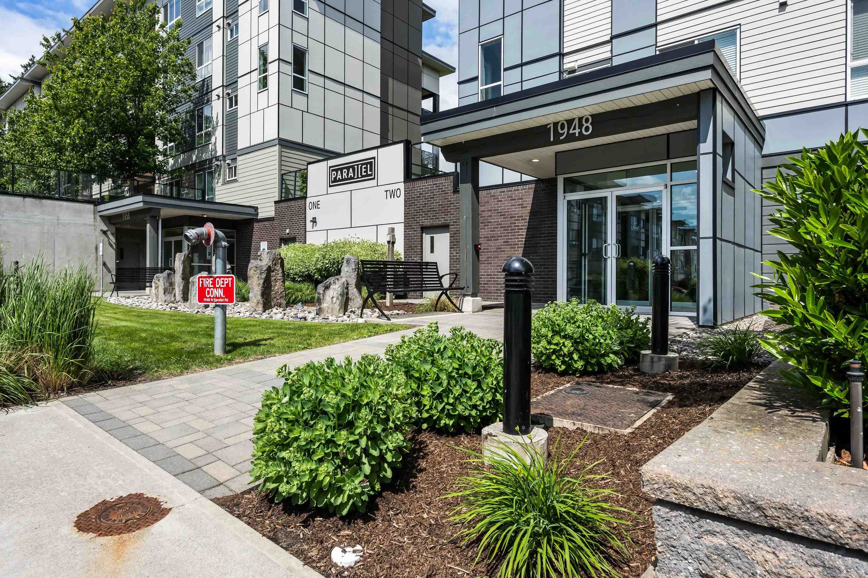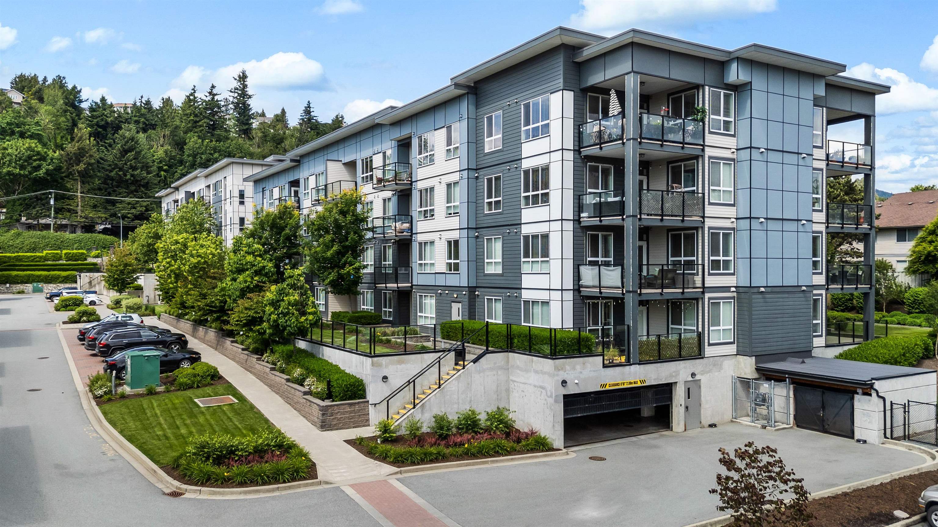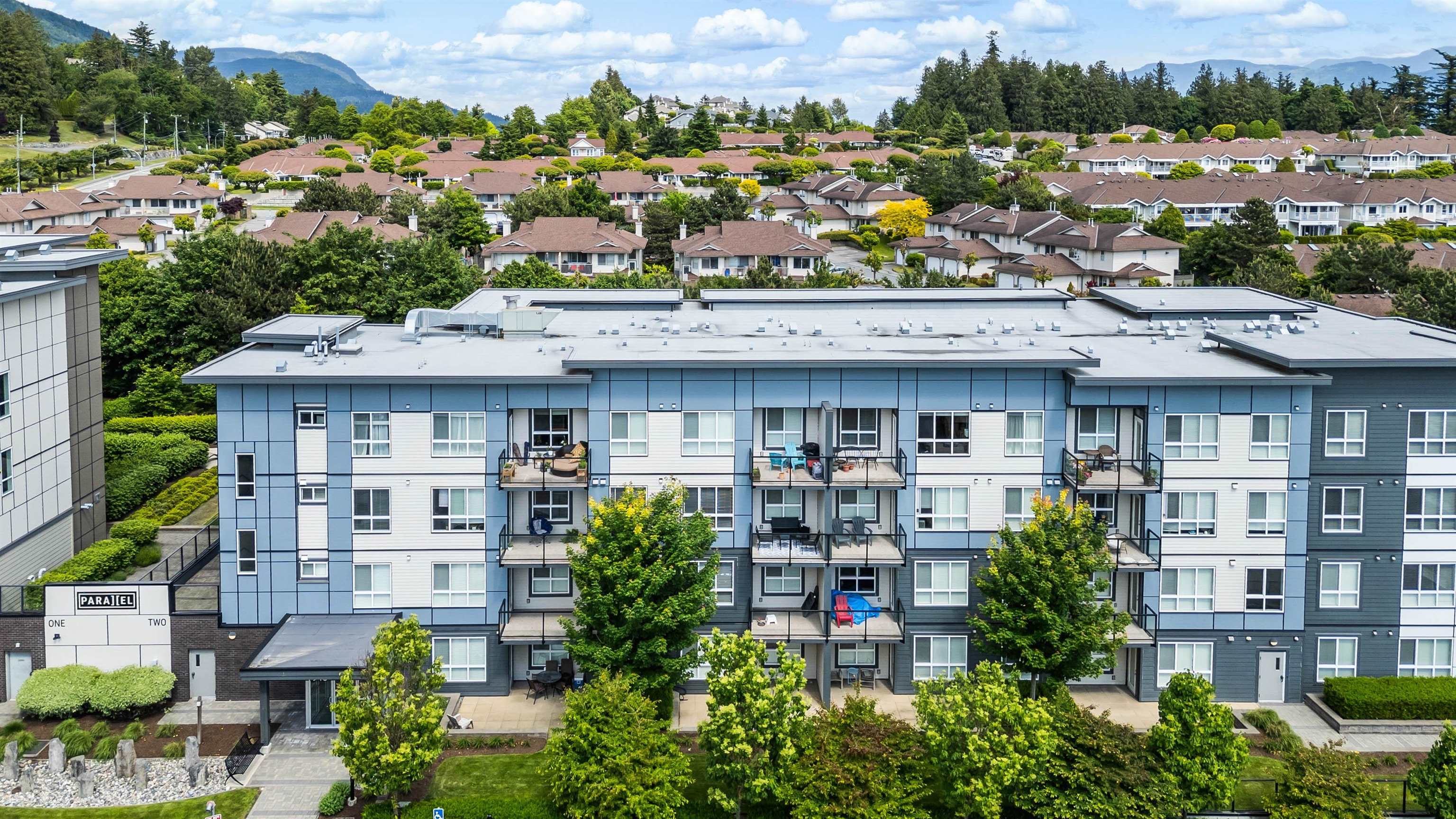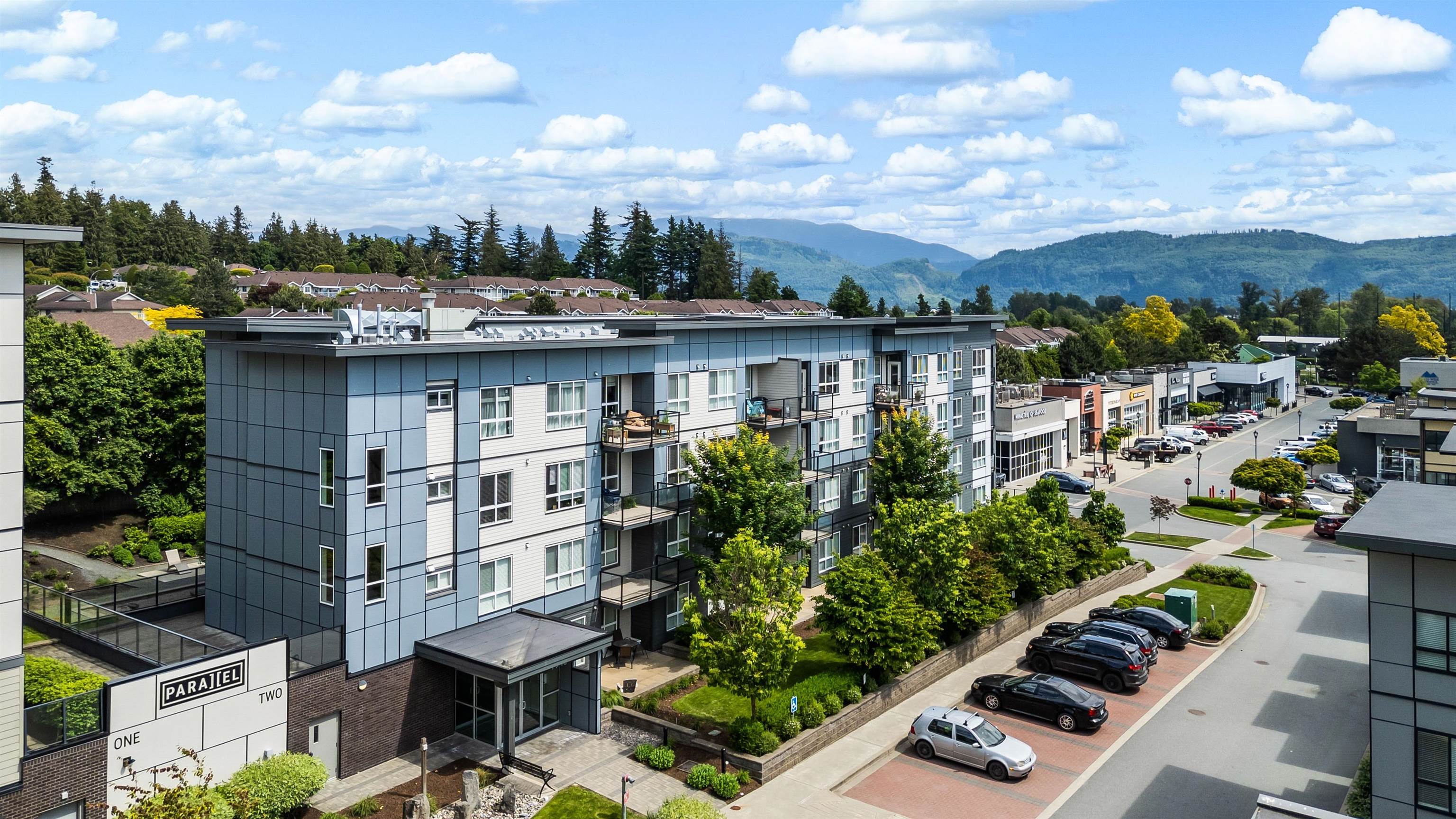 Welcome to this Immaculate 1 Bed 1 Bath unit in sought after Parallel Two in East Abbotsford! This condo is beautifully layout with stainless steel appliances, ample cupboard and counter space in kitchen looking onto spacious living room with huge window for natural light. In suite laundry and 4 piece bathroom. Large primary bedroom with walk-in closet. Enjoy a coffee on your private deck looking out to the quiet treed landscape. Includes 1 underground Parking Stall. This well run building has a quiet court...