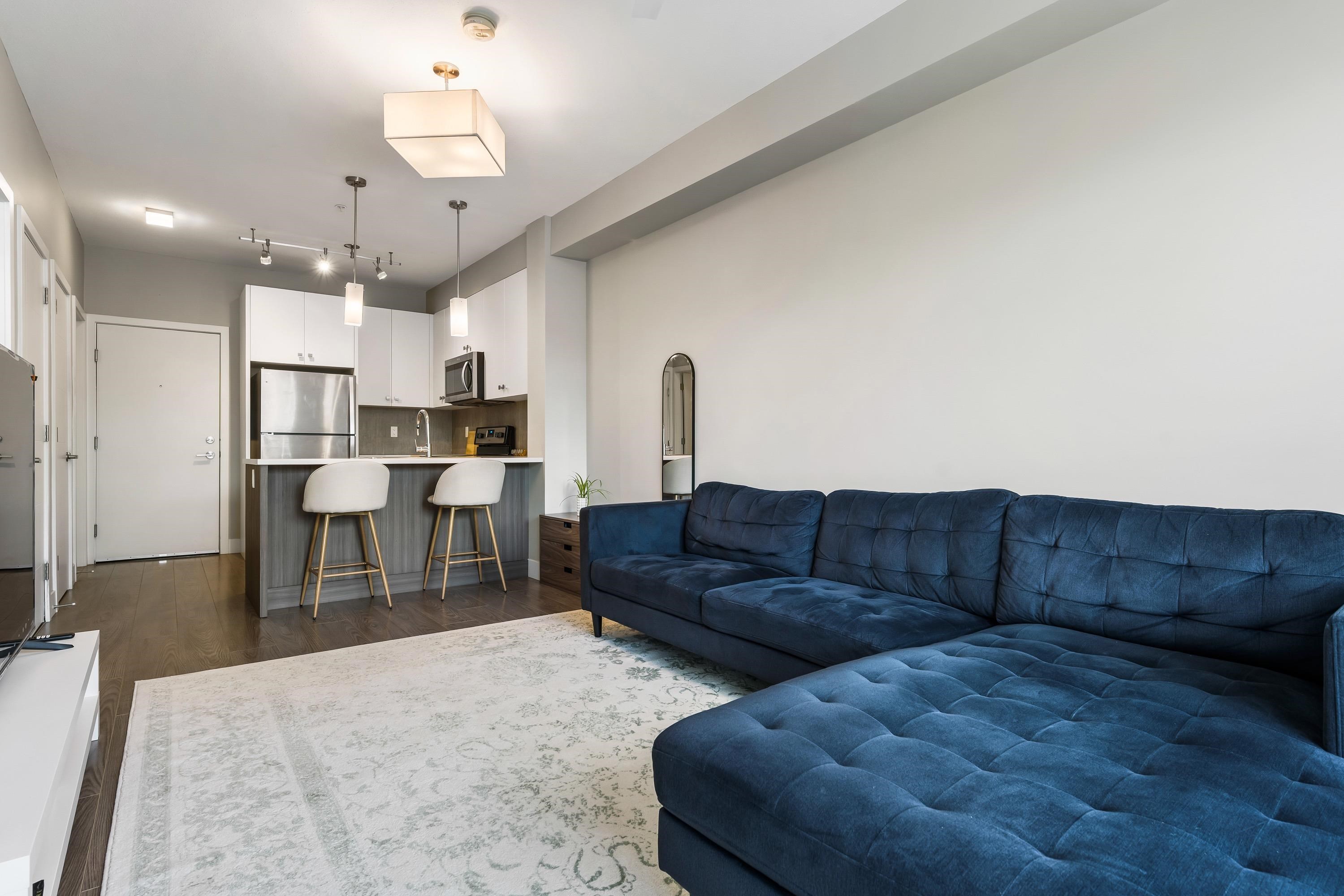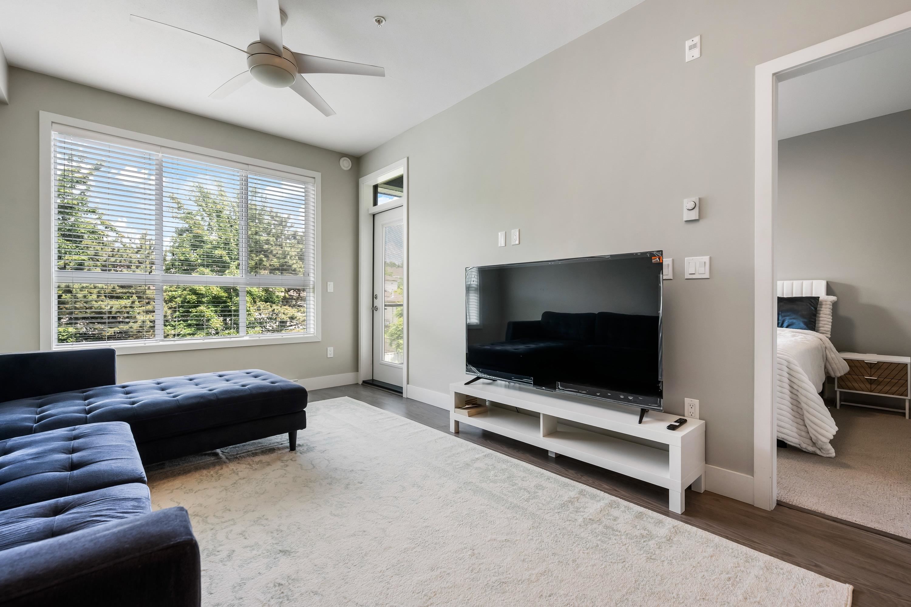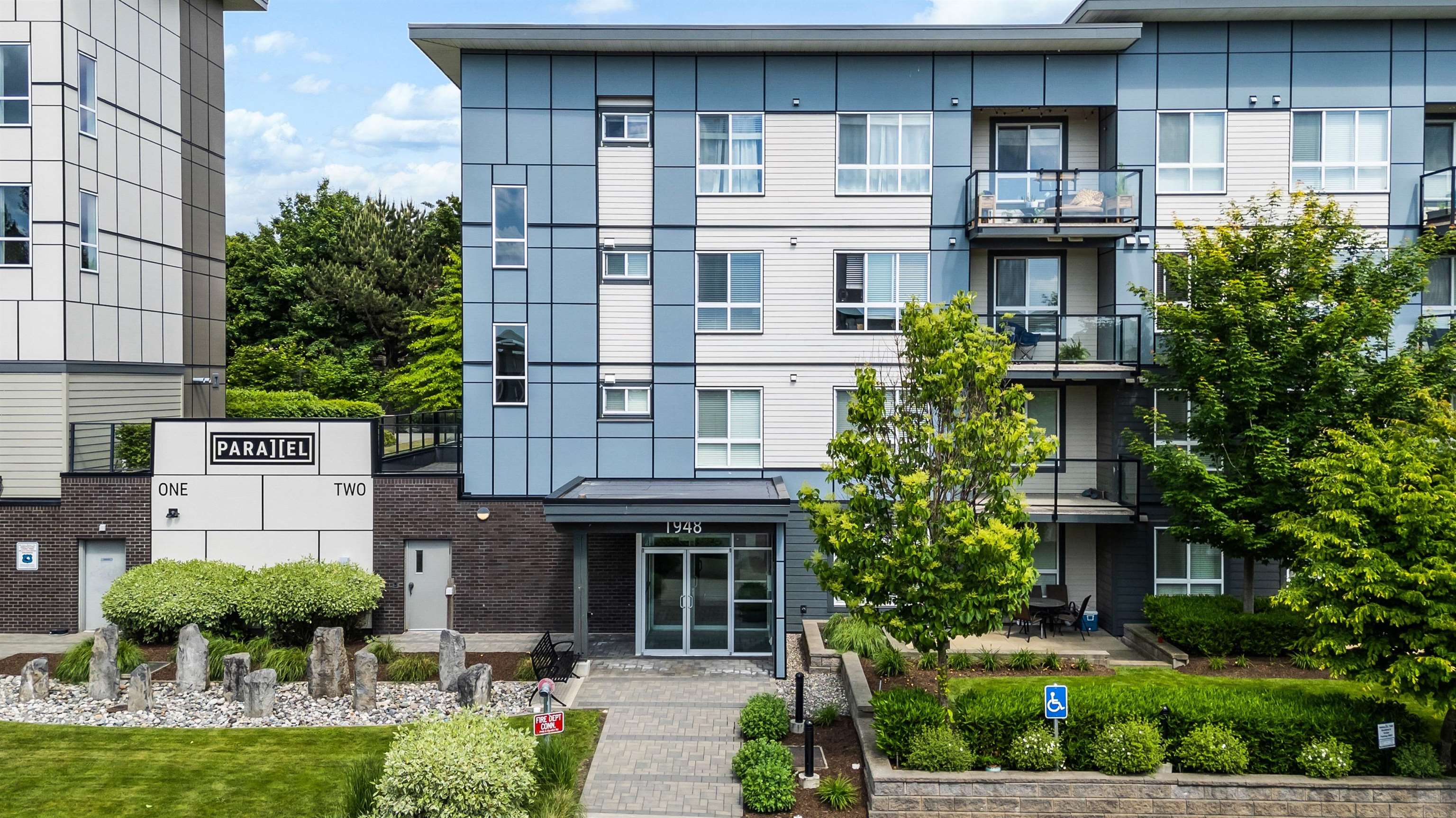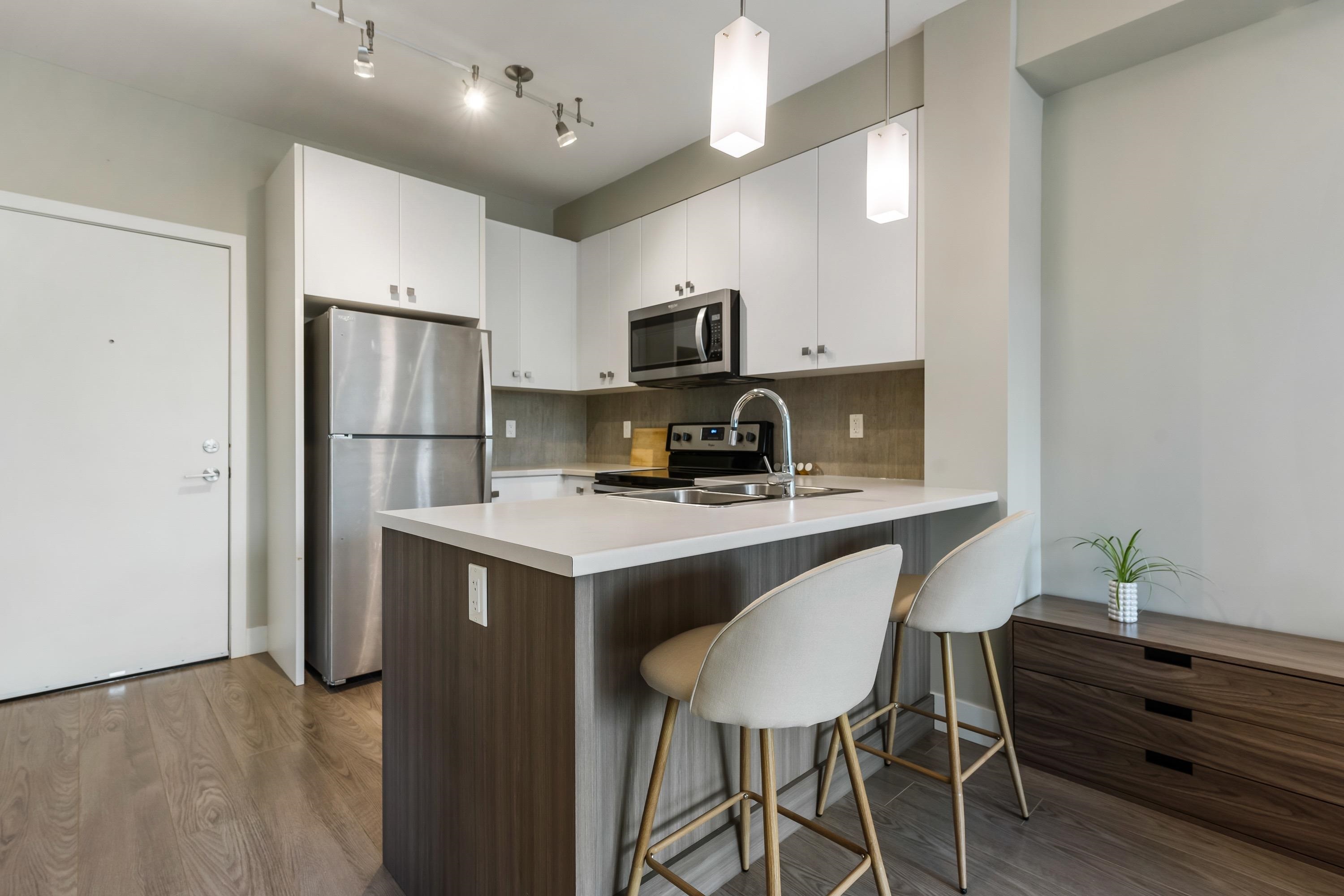 Welcome to this Immaculate 1 Bed 1 Bath unit in sought after Parallel Two in East Abbotsford! This condo is beautifully layout with stainless steel appliances, ample cupboard and counter space in kitchen looking onto spacious living room with huge window for natural light. In suite laundry and 4 piece bathroom. Large primary bedroom with walk-in closet. Enjoy a coffee on your private deck looking out to the quiet treed landscape. Includes 1 underground Parking Stall. This well run building has a quiet court...