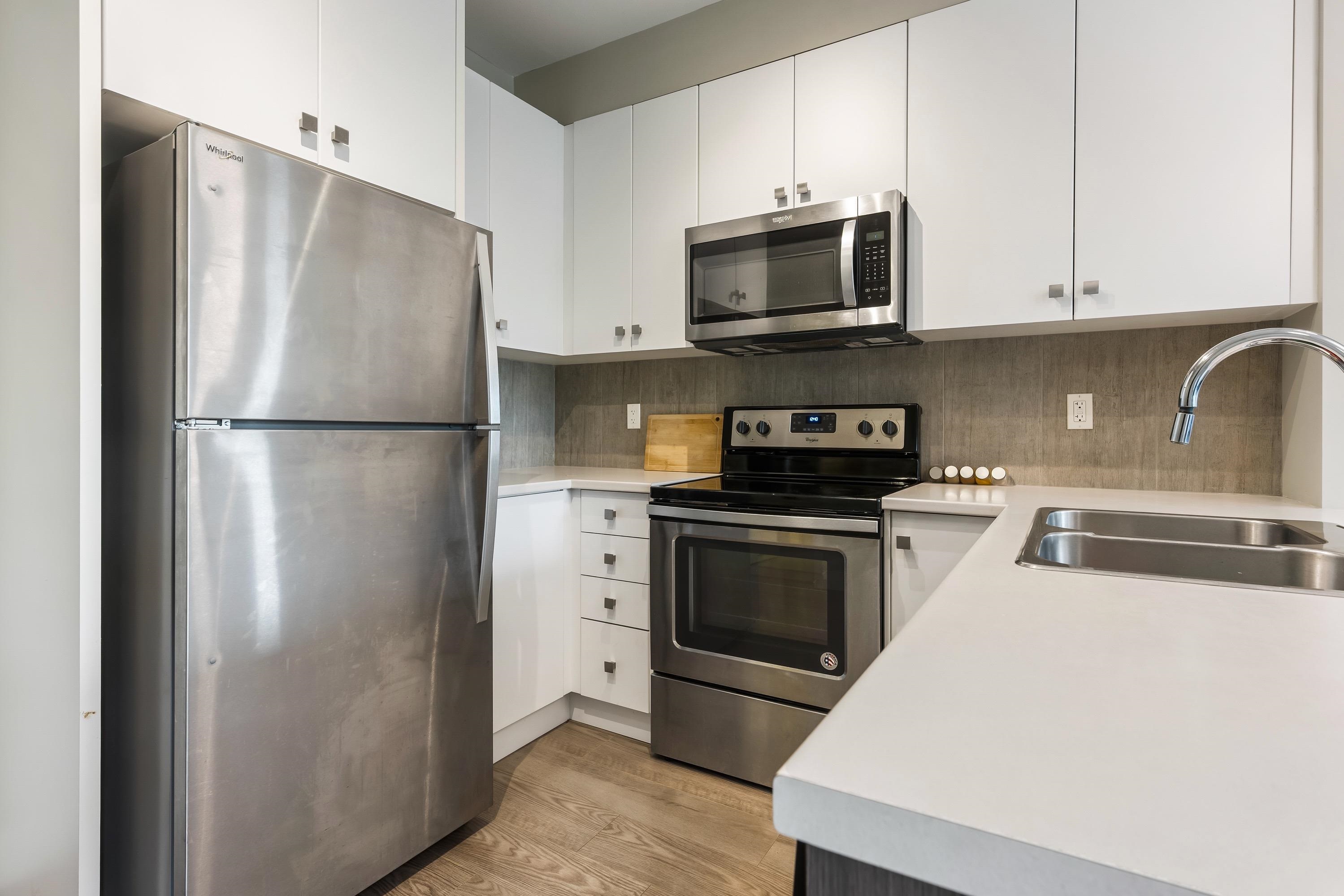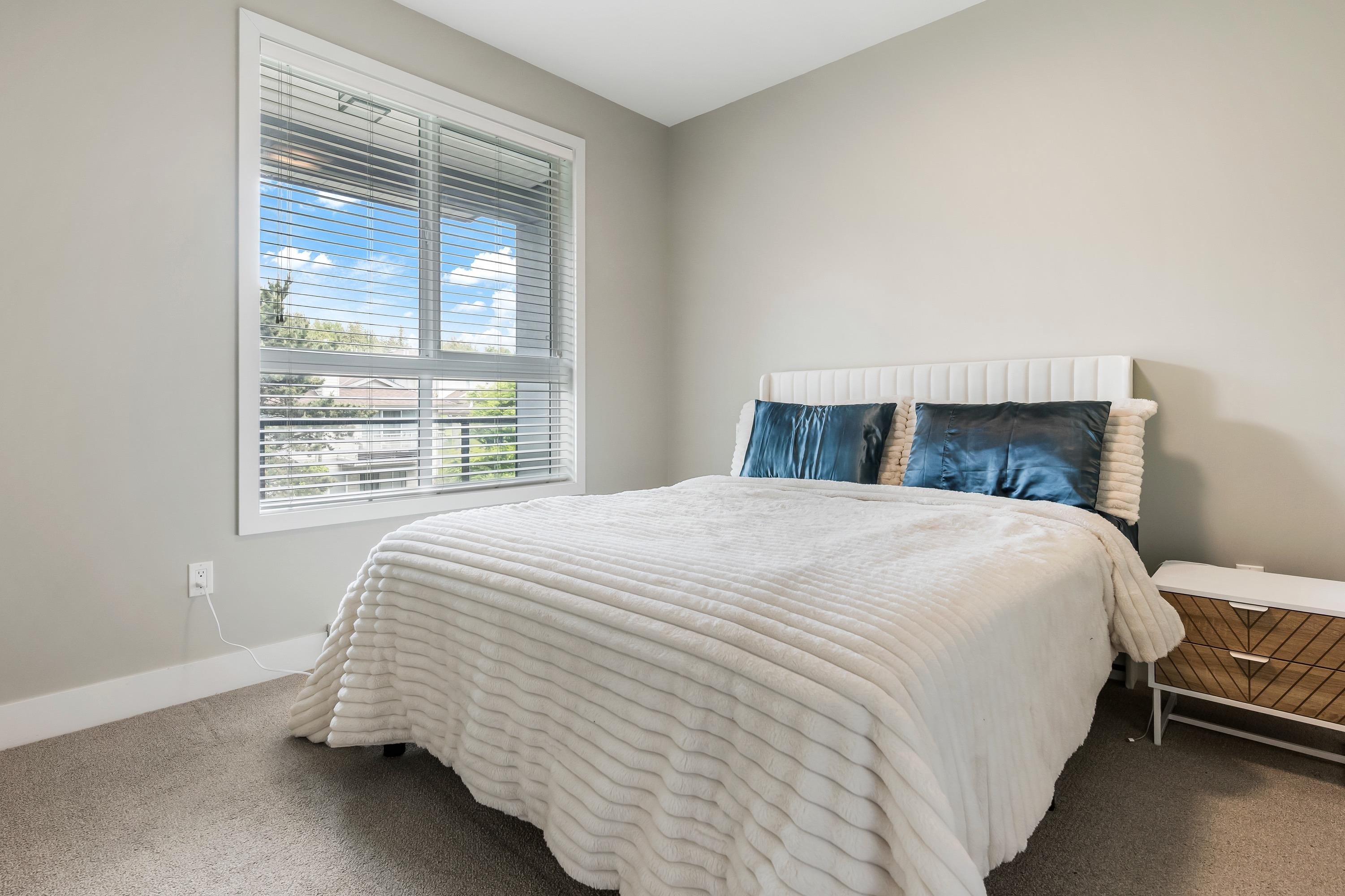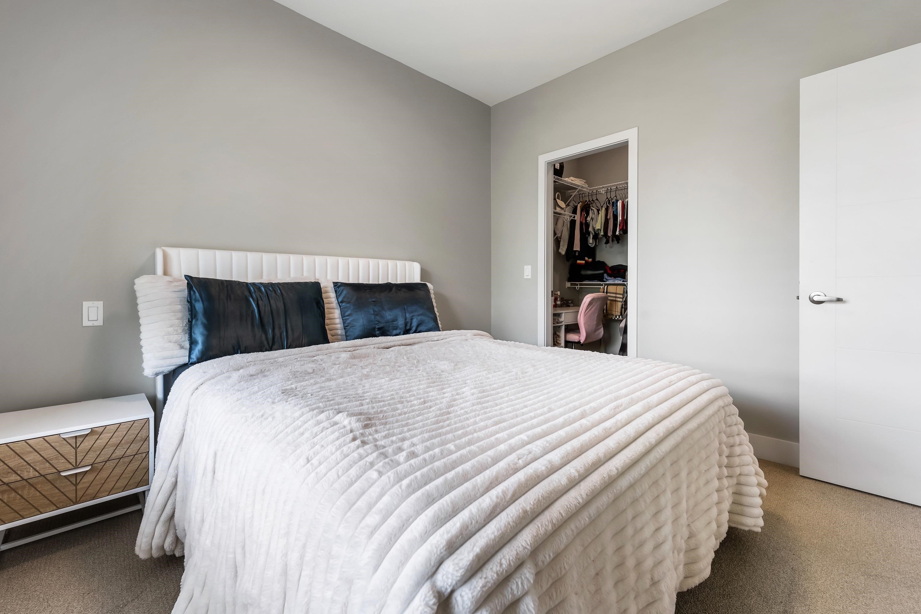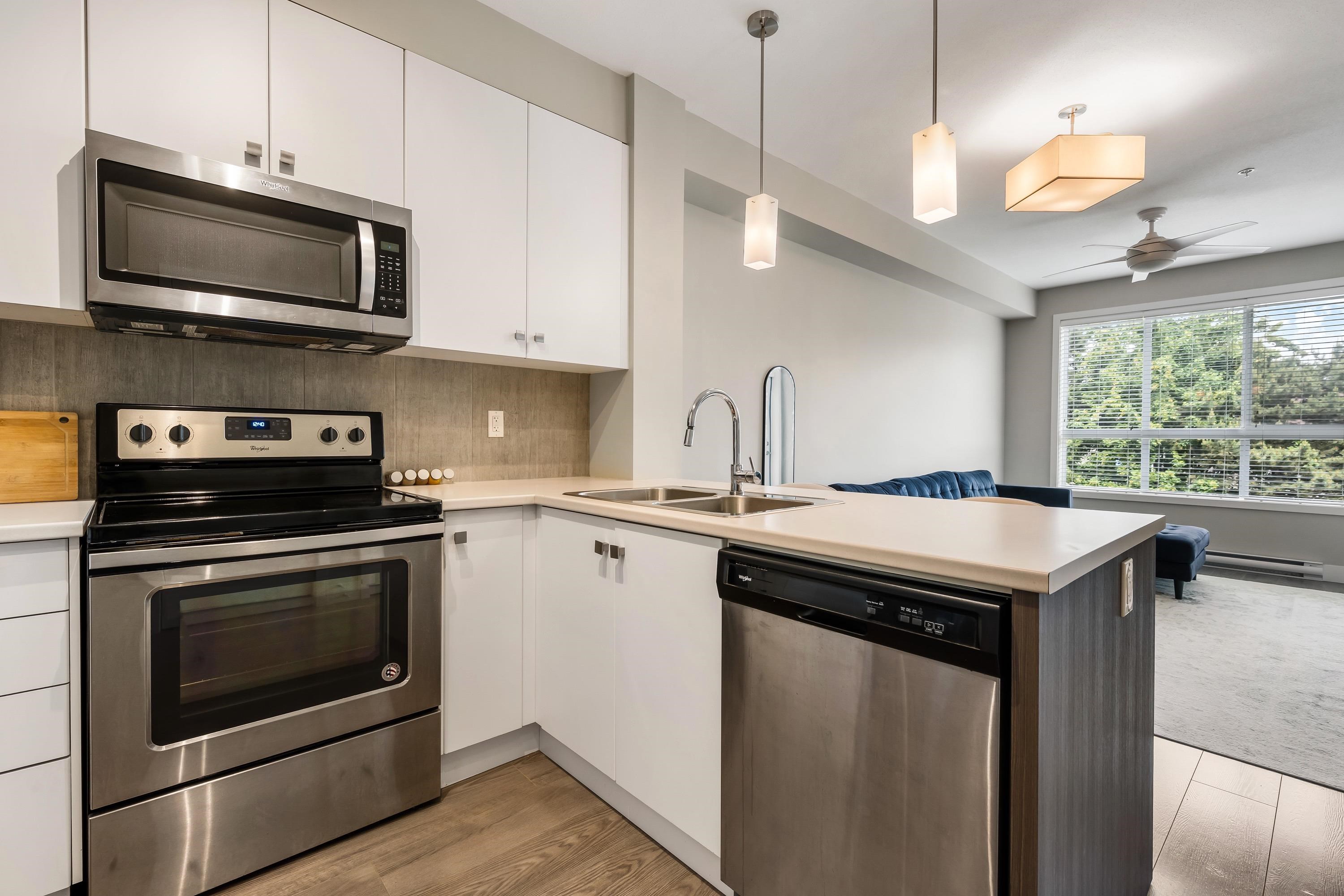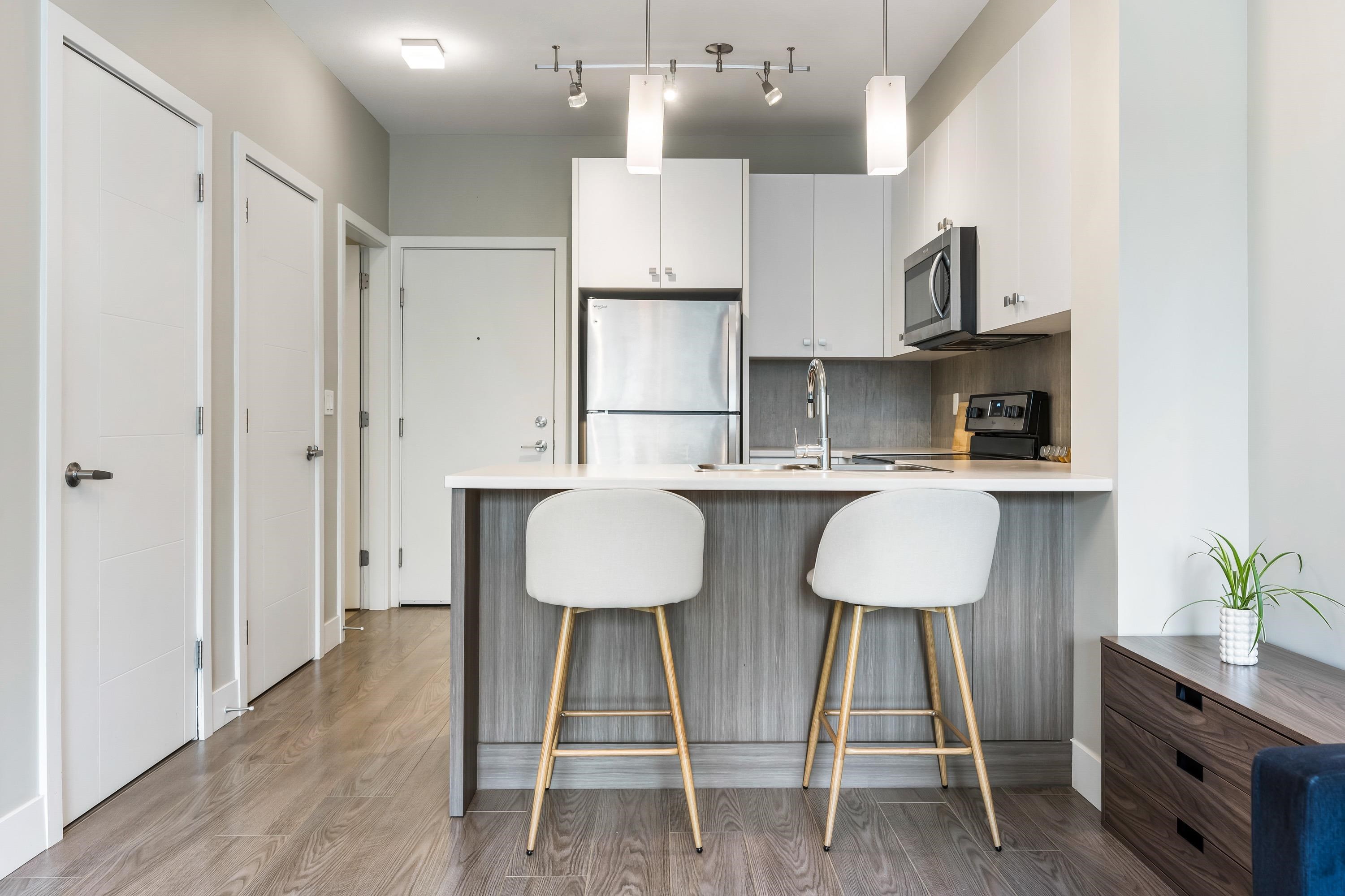 Welcome to this Immaculate 1 Bed 1 Bath unit in sought after Parallel Two in East Abbotsford! This condo is beautifully layout with stainless steel appliances, ample cupboard and counter space in kitchen looking onto spacious living room with huge window for natural light. In suite laundry and 4 piece bathroom. Large primary bedroom with walk-in closet. Enjoy a coffee on your private deck looking out to the quiet treed landscape. Includes 1 underground Parking Stall. This well run building has a quiet court...