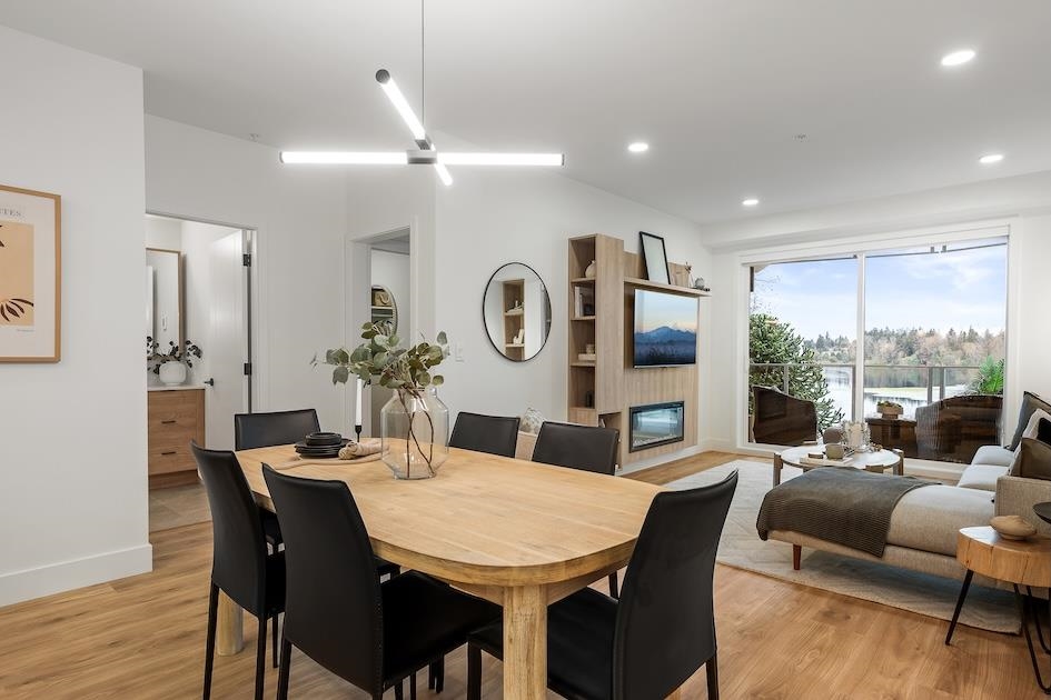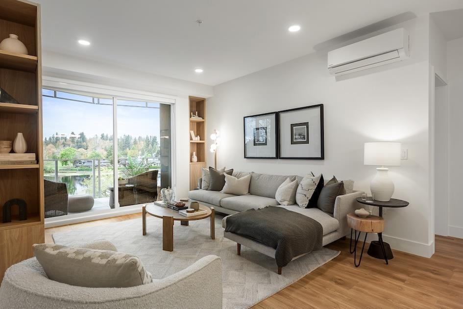 ELEVATED LAKE FRONT LIVING ON MILL LAKE! It is a rare opportunity to live on the shores of Mill lake, minutes away from Abbotsford's essential shopping amenities. Built by reputable local Fraser Valley developer and building Heinrichs Developments with over 30 years of experience in creating exceptional homes. This TWO bed THREE bath home offers 1441 sqft of indoor living space & 318 sqft of outdoor space with views of Mt Baker. This home features AC, a stylish modern kitchen with quartz countertops and Bos...