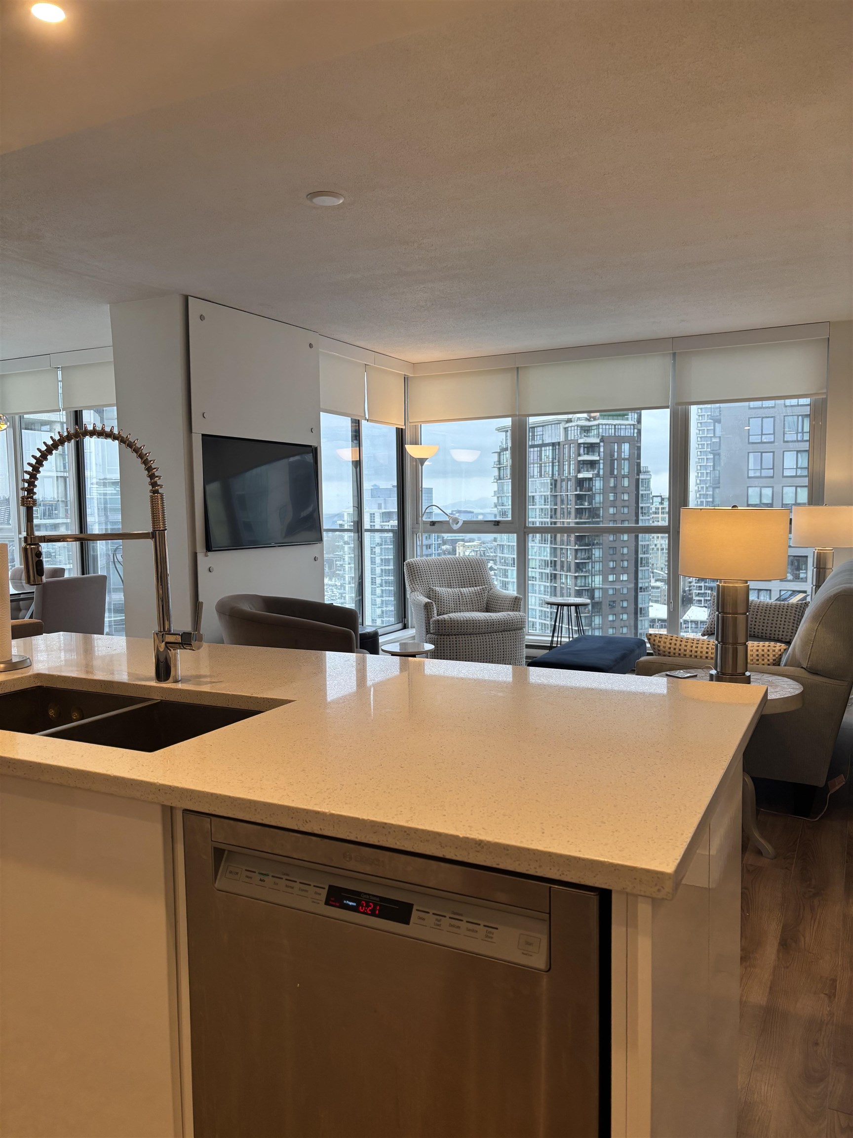 Resort Luxury living at West One! FURNISHED! Immaculate & spacious with floor-to-ceiling windows and a sweet view too! This 1 bedroom and den condo glows with natural light & offers a home away from home feel. Great floor plan w/ balcony access from living room - nice for morning coffee and a sunset view! Life at West One comes with free access to the fabulous Club Viva amenities including indoor pool, gym, hot tub, steam room, squash courts, guest suite, theatre, TV room, pool table, party room, meeting ro...