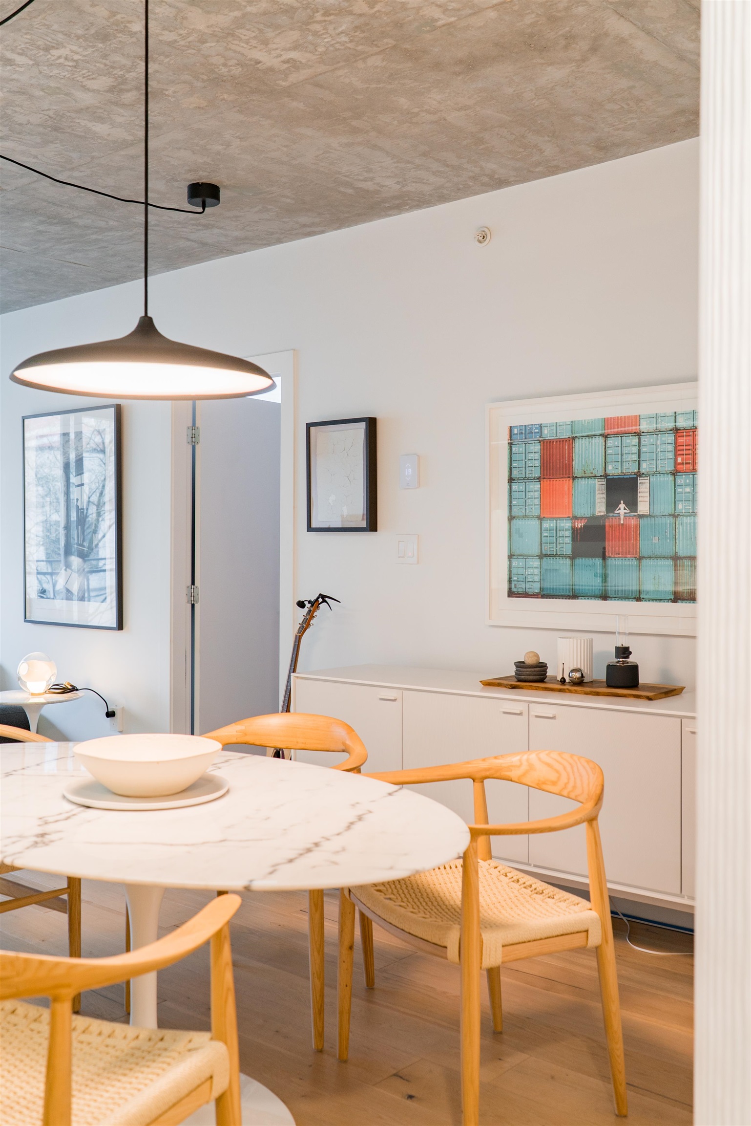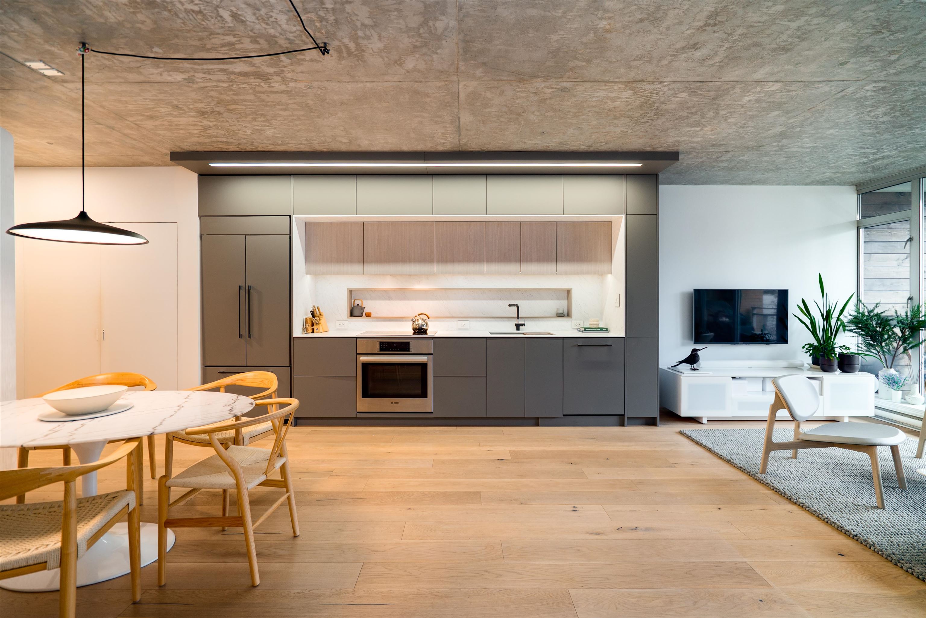 Over 900 sq. ft. of thoughtfully designed space featuring white oak flooring, polished concrete ceilings + floor-to-ceiling windows. The kitchen combines custom solid wood cabinetry with Bosch appliances, flowing seamlessly into the living + dining areas + so great for entertainingOriginally two bedrooms, the second bedroom is currently opened up with a Molo freestanding partition, creating flexible, living options. Custom updates throughout enhance the modern, refined aesthetic. Complete with one parking s...