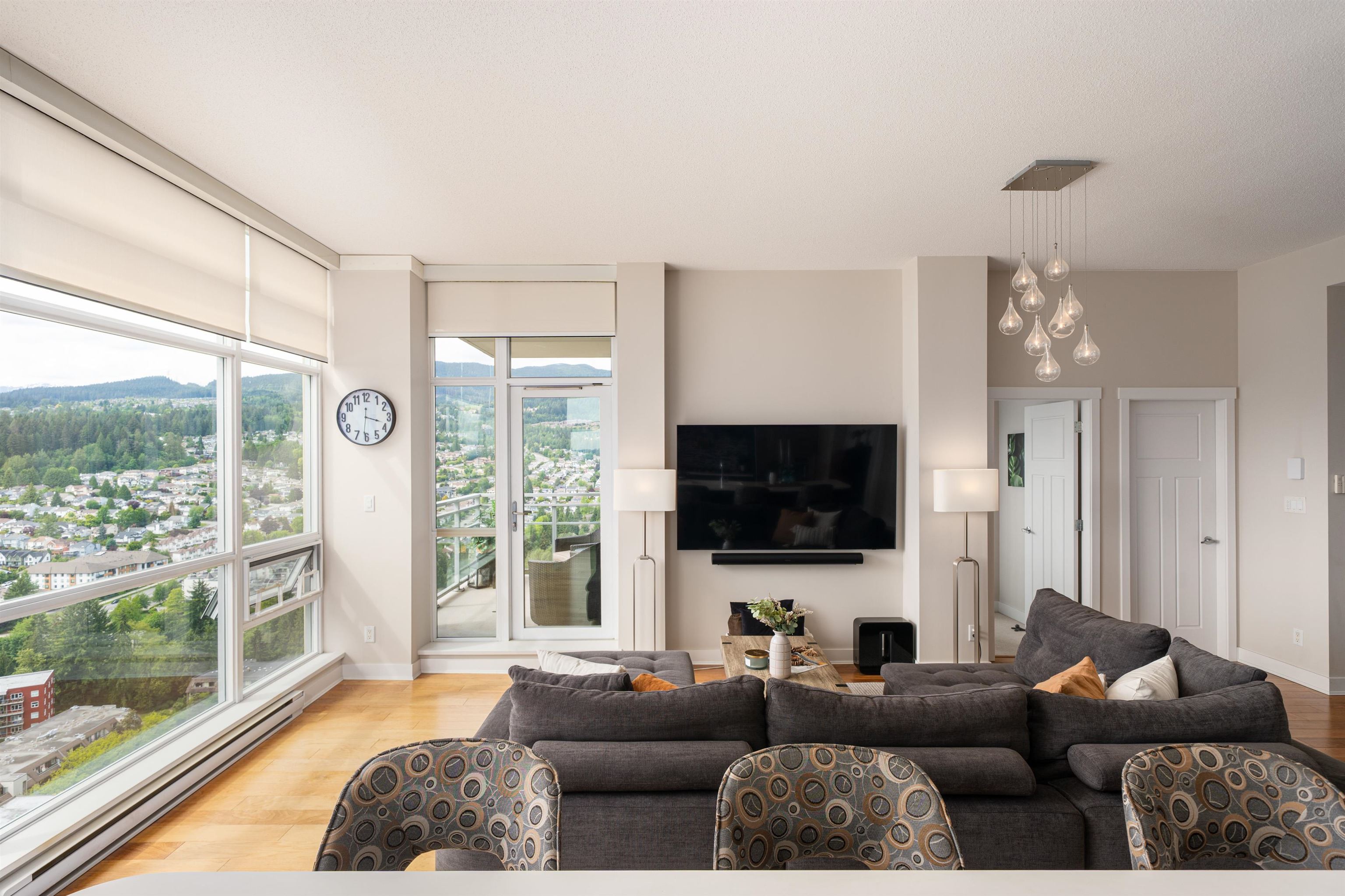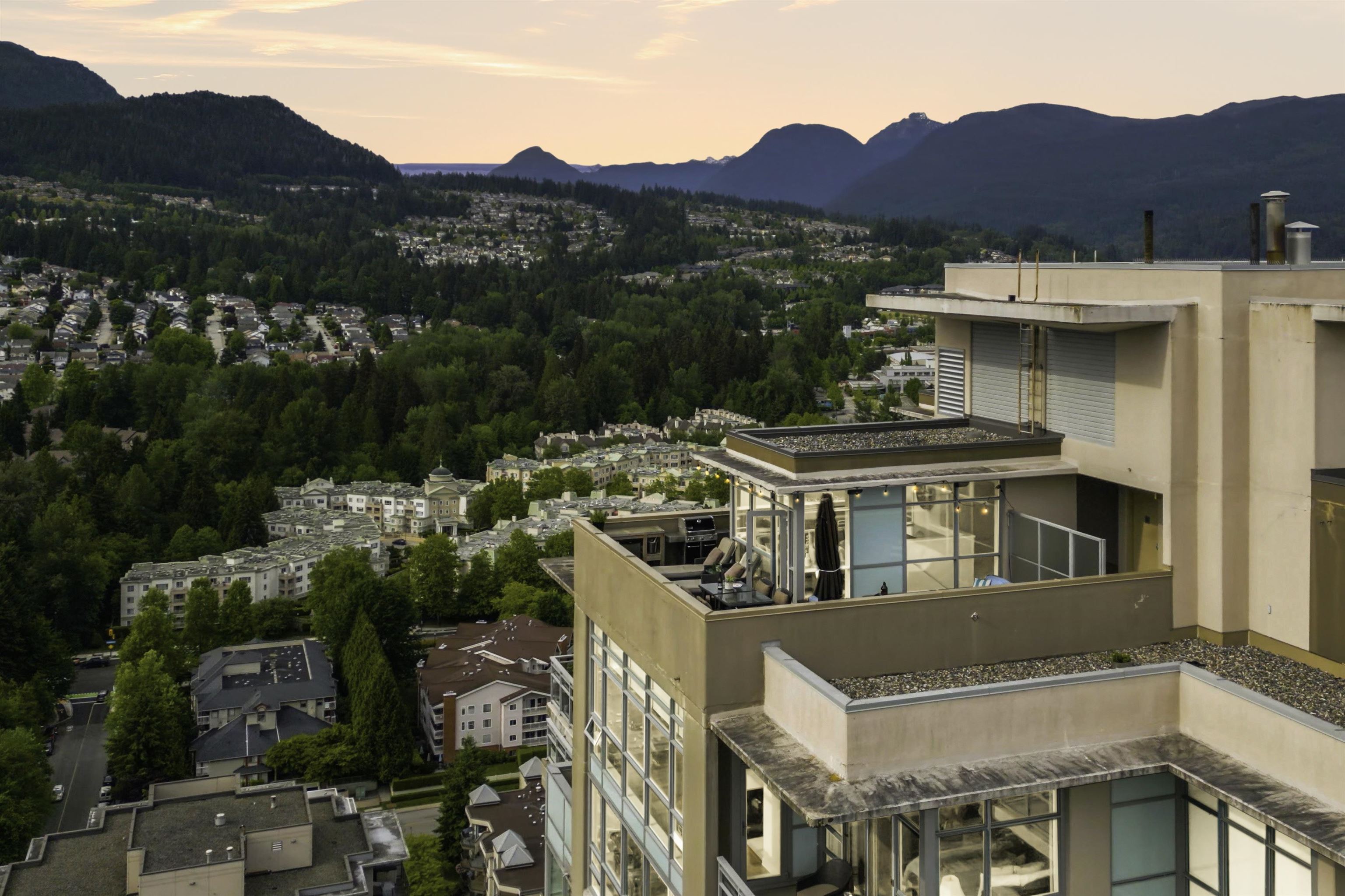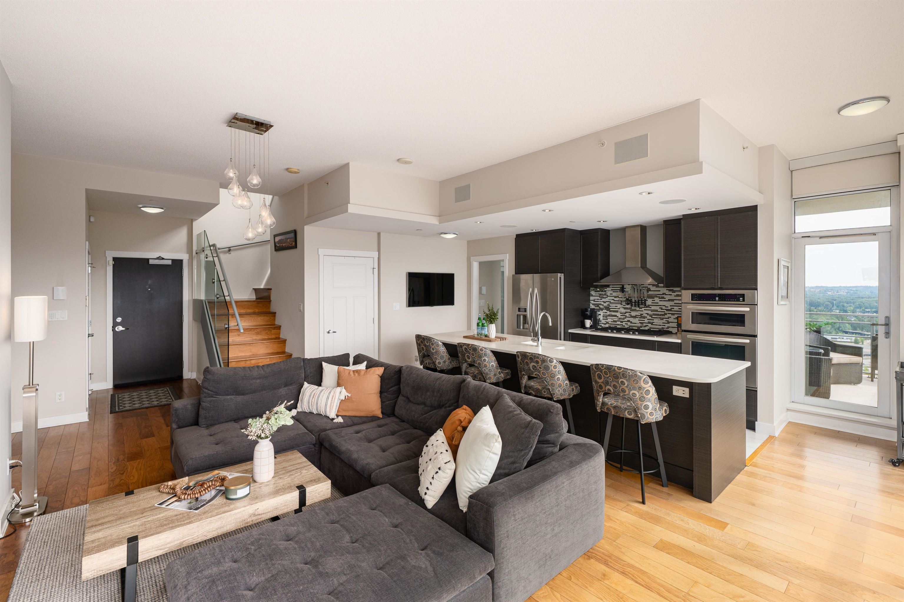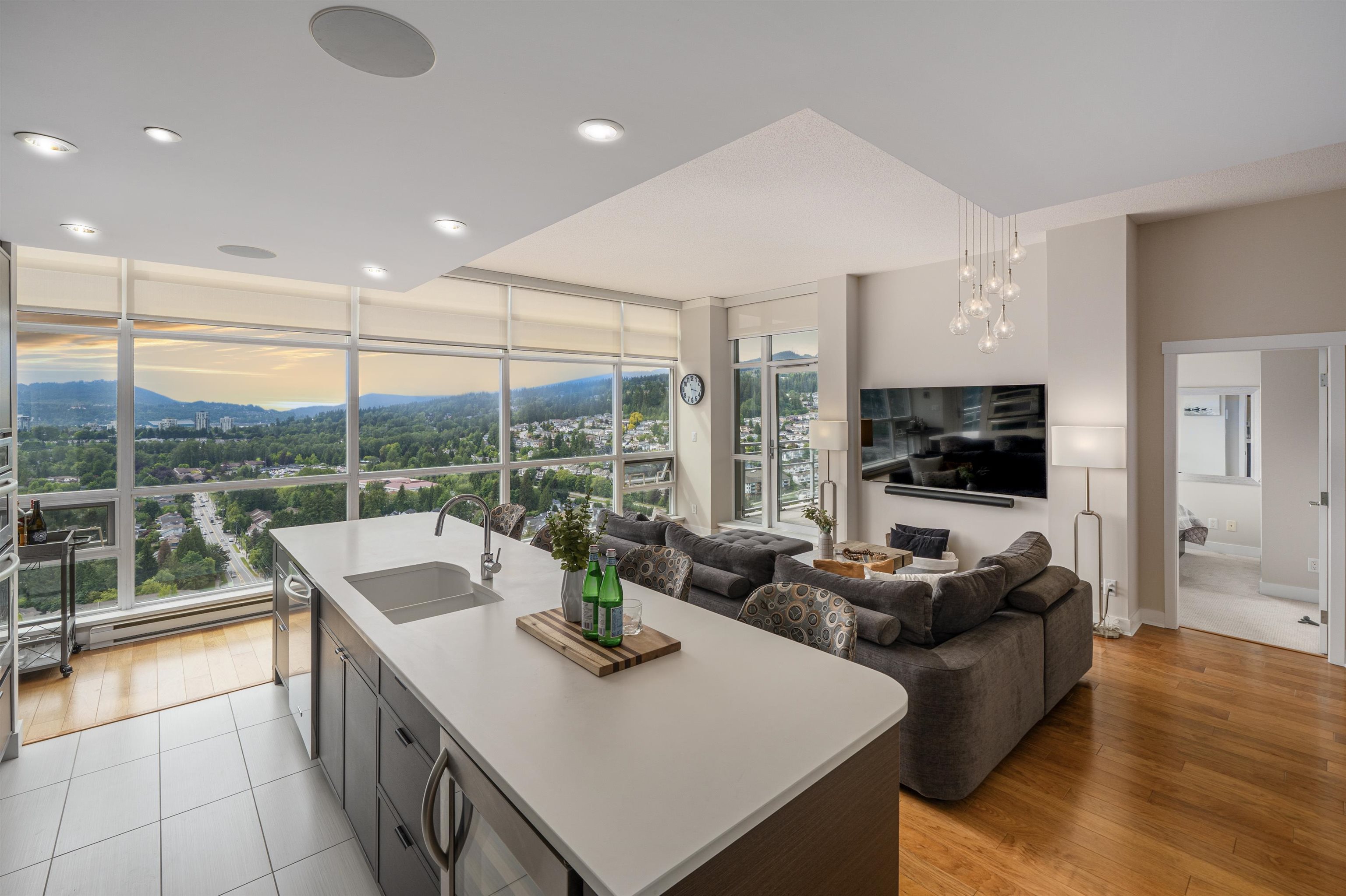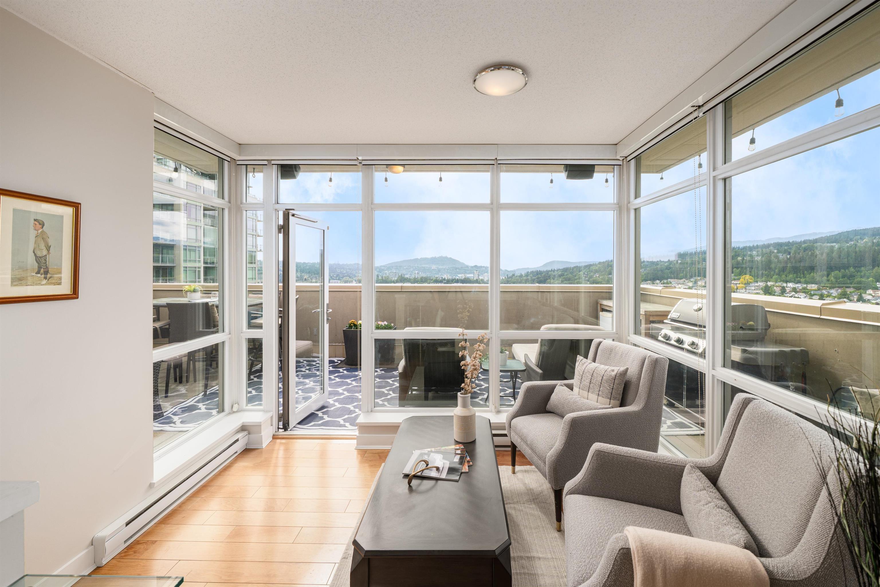 Elevate your lifestyle in this signature two-storey penthouse soaring above the heart of Coquitlam. Walls of glass showcase cinematic views of Westwood Plateau, Burrard Inlet, and the city skyline, while rich hardwood and refined designer finishes create a striking, modern ambiance. Entertain at the dramatic 12-ft kitchen island with wine fridge, unwind in the renovated spa-inspired ensuite, and enjoy smart luxury with Sonos, powered blinds, and integrated lighting. Bedrooms are privately separated with the...