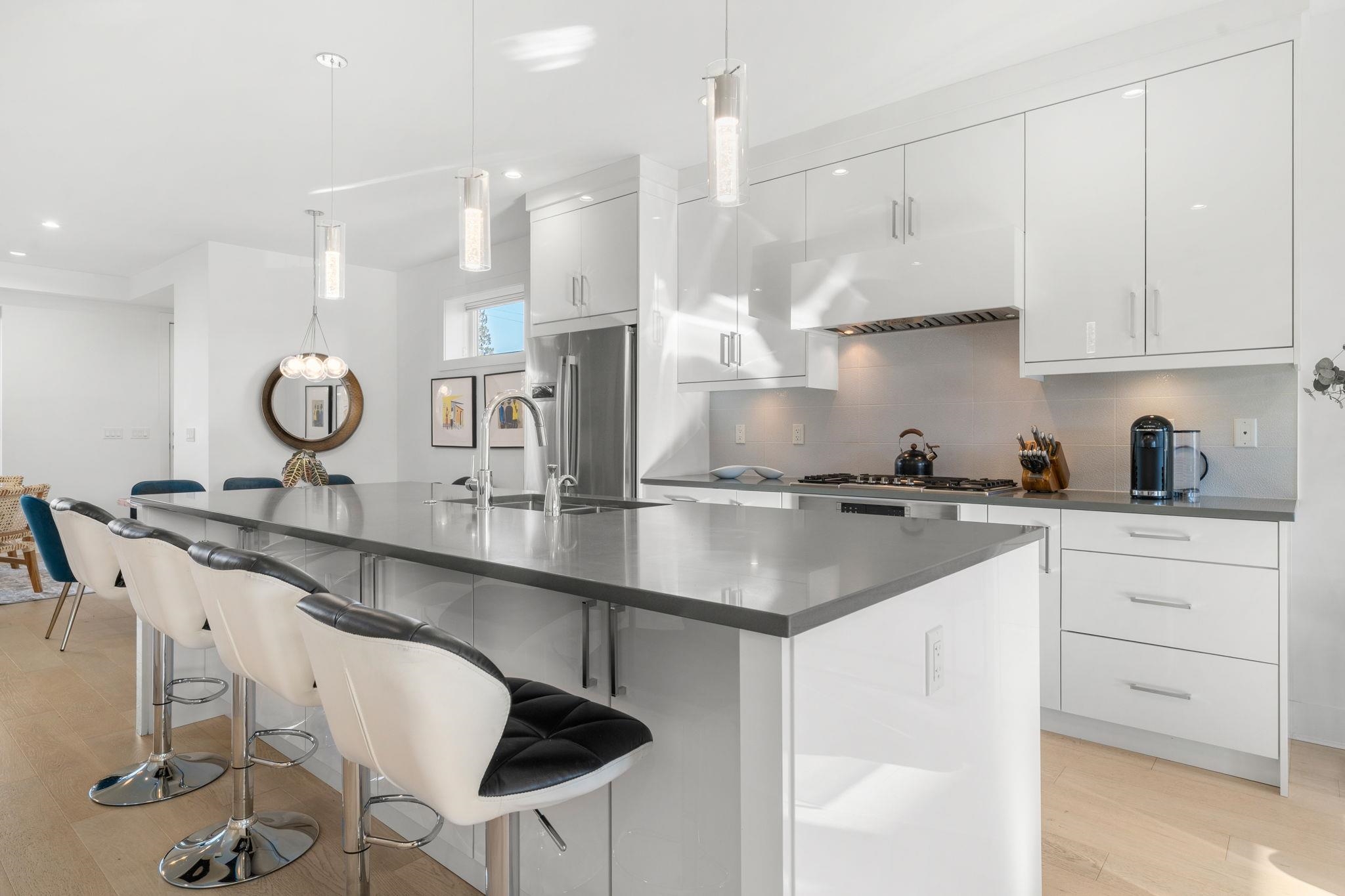 Beautifully crafted 1/2 duplex by award-winning Bolder Homes, ideally located in Central Lonsdale. Over 2,700 sq ft of refined living across three levels, featuring a bright open-concept design, gourmet kitchen with Bosch appliances, stone counters, oversized island, hardwood floors, and gas fireplace. Five bedrooms and four bathrooms, including an elegant primary suite with walk-in closet, heated tile spa-like ensuite, and convenient upstairs laundry. Premium comforts include a heat pump, AC/HRV, hot water...