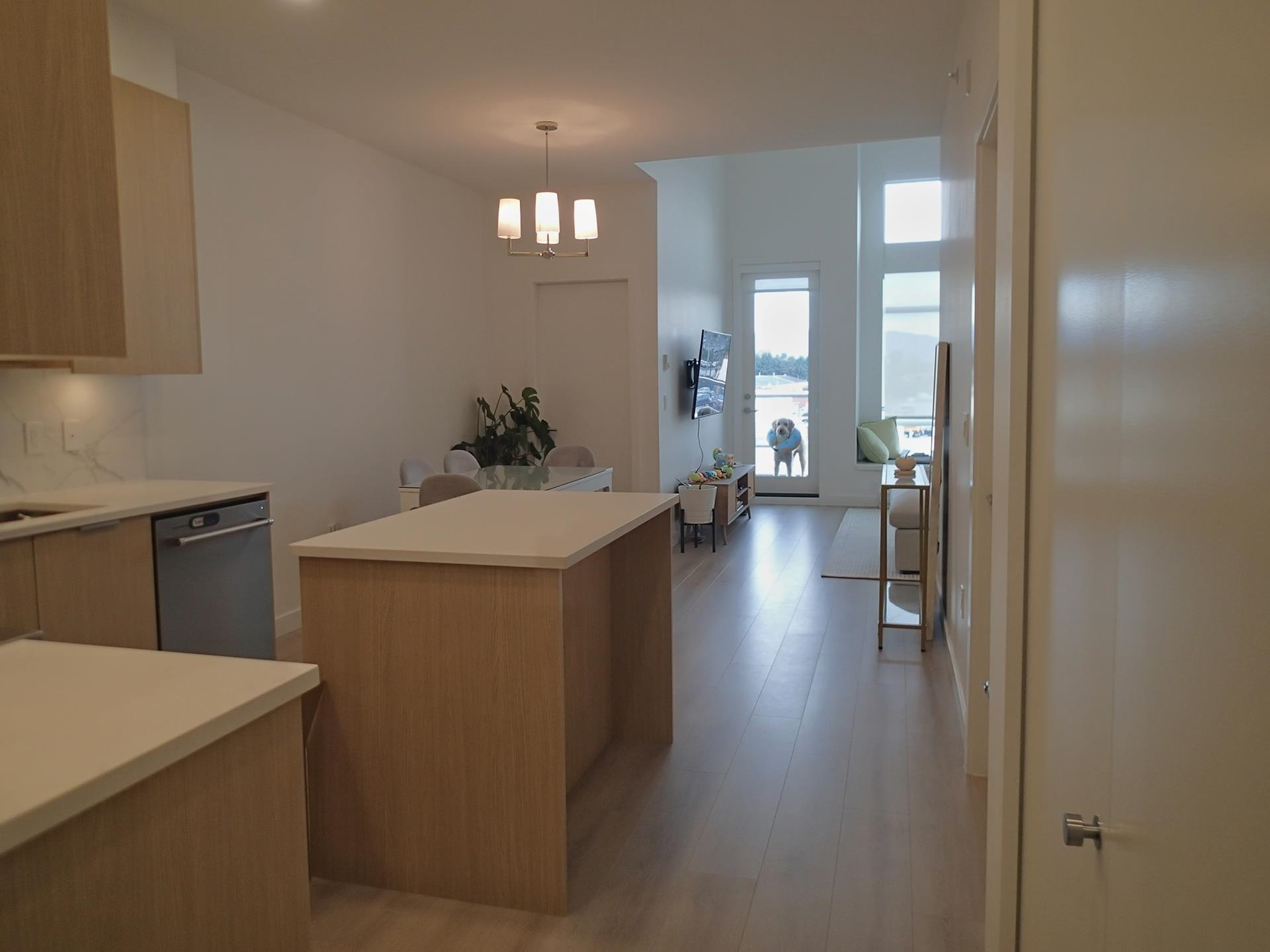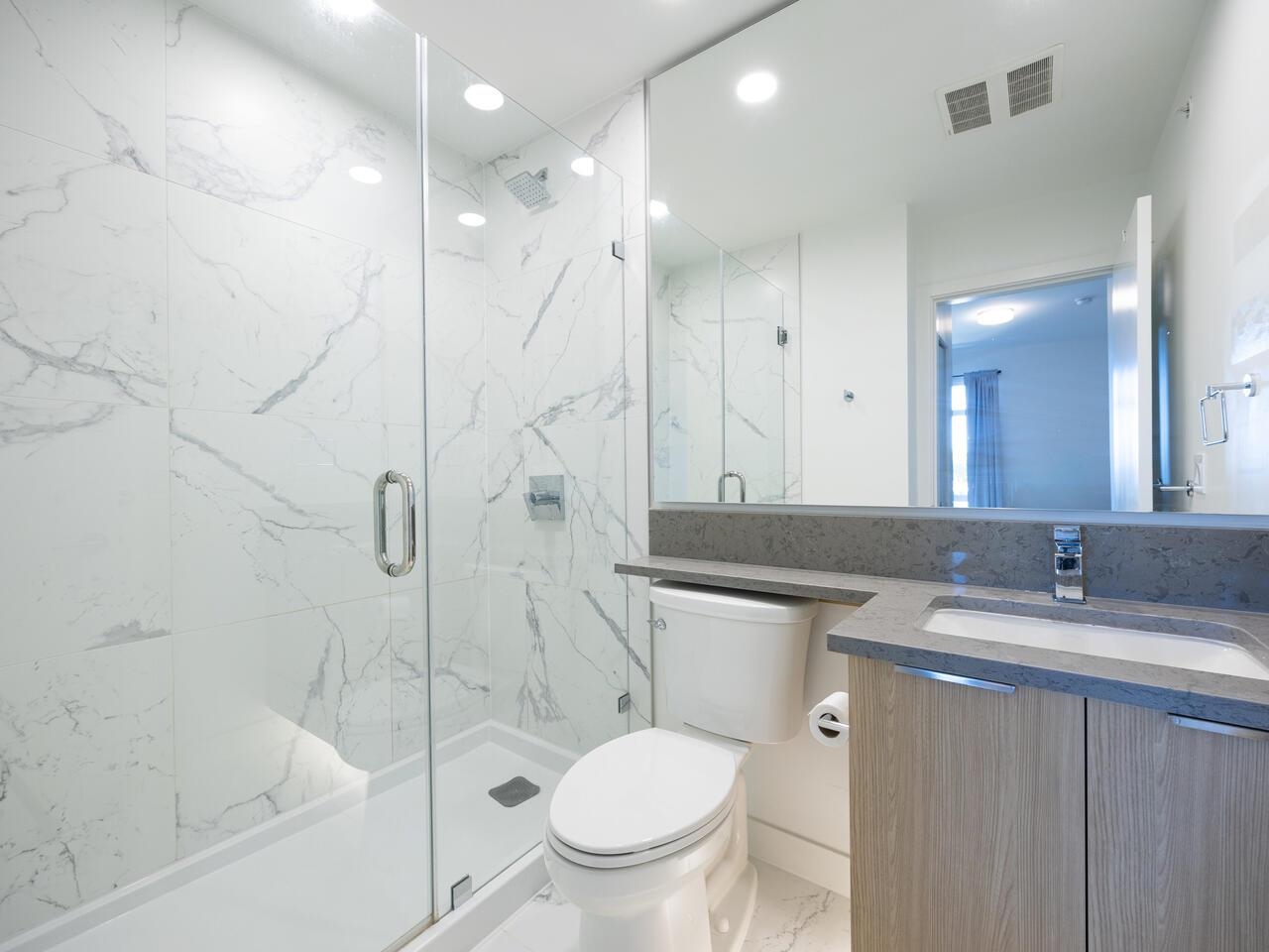 Top floor! This NE-facing unit features 13ft high ceilings in the living room with expansive windows, a covered balcony and a functional floorplan. Soft LED lighting, USB outlets and prewired high speed internet provides for seamless work/play at home. The primary bedroom features a walk-in closet and an ensuite with a walk-in shower. Packages? There's a concierge and smart lockers so you don't have to wait. Other shared amenities include EV charging for you and visitors, guest suites, bike rooms, car wash ...