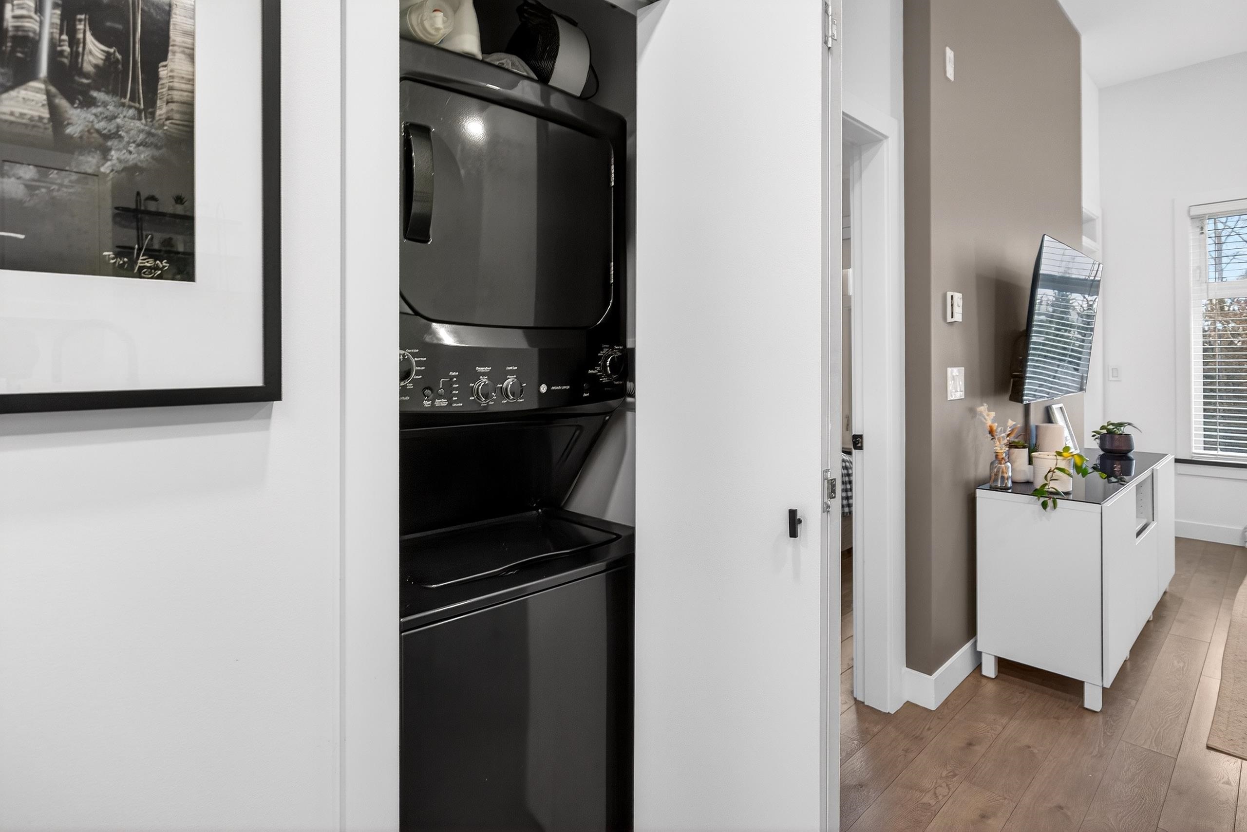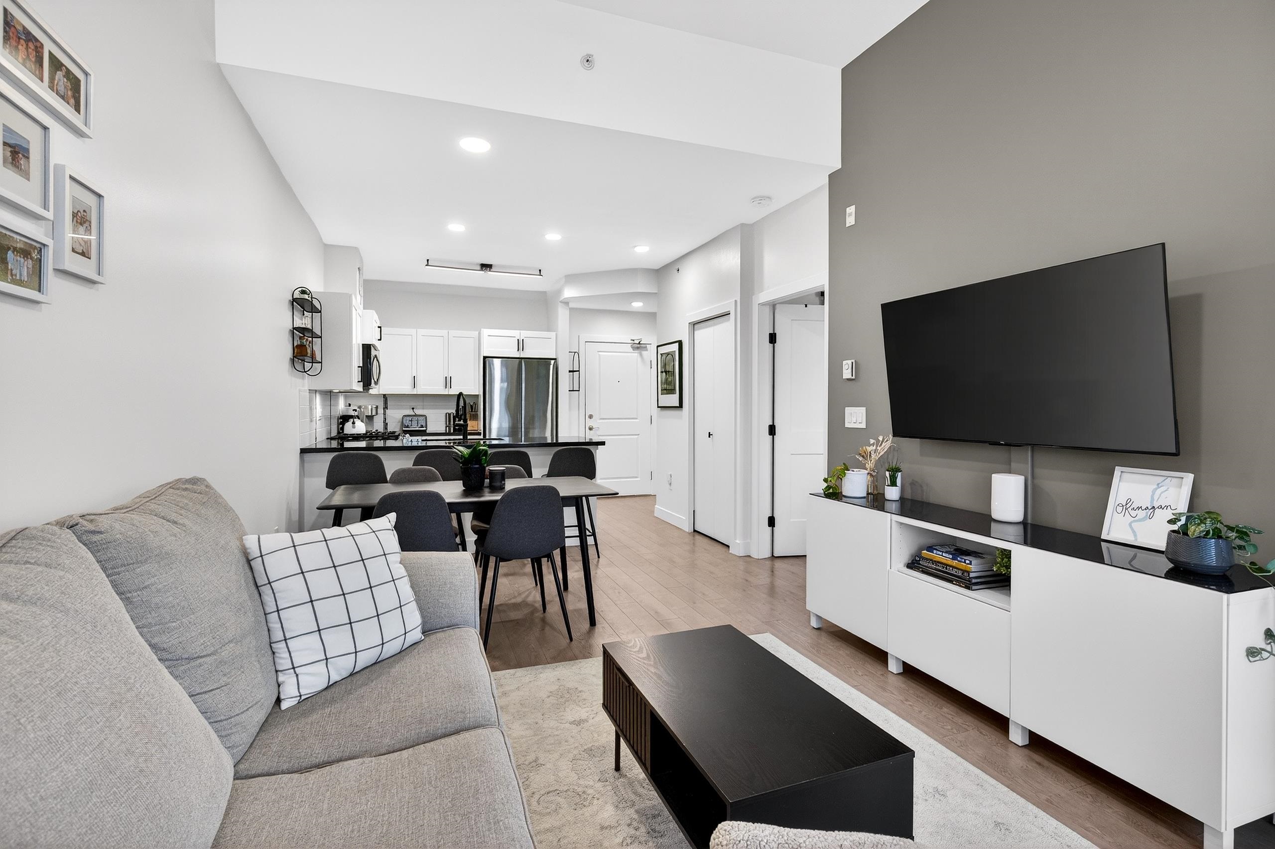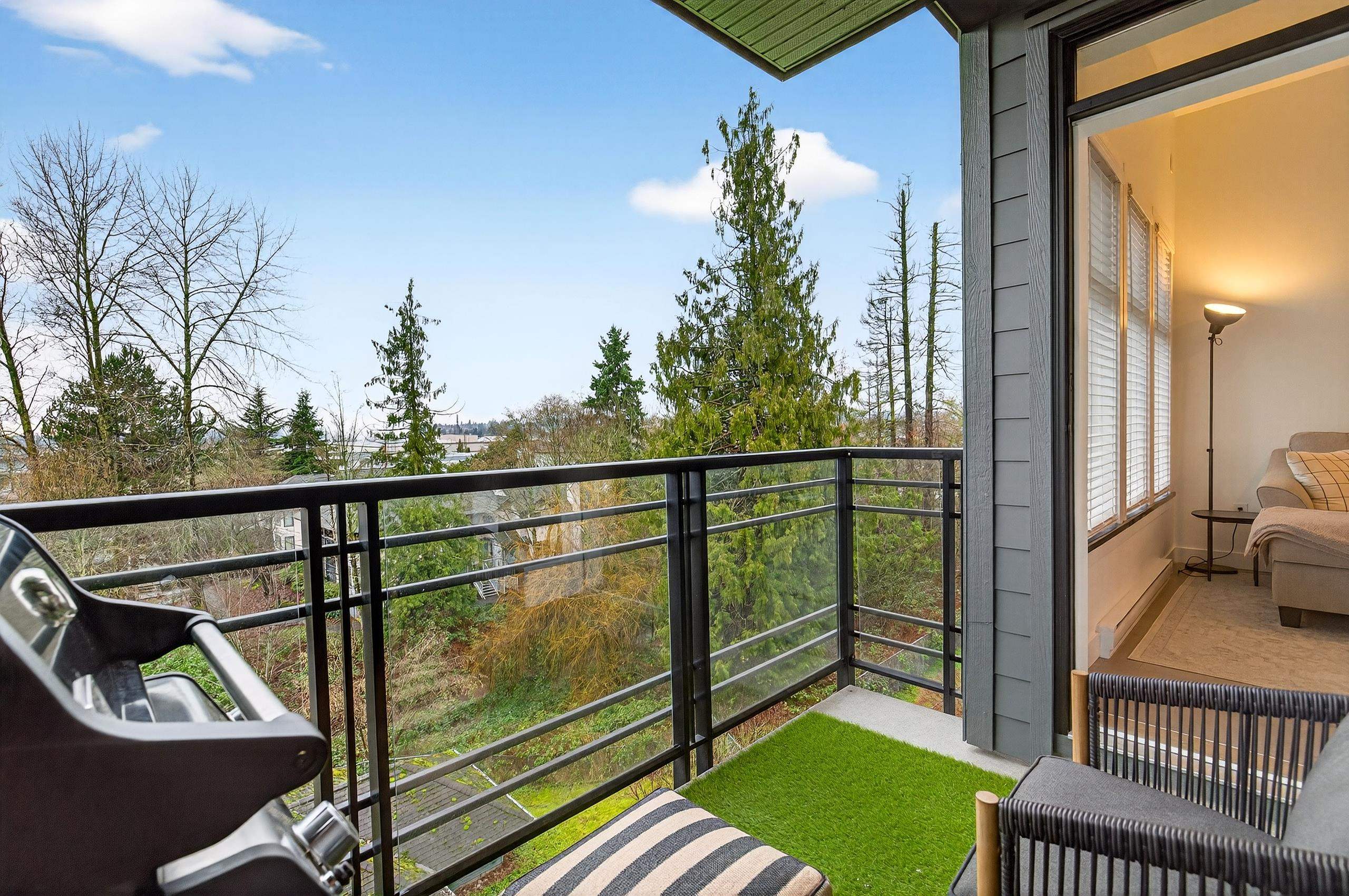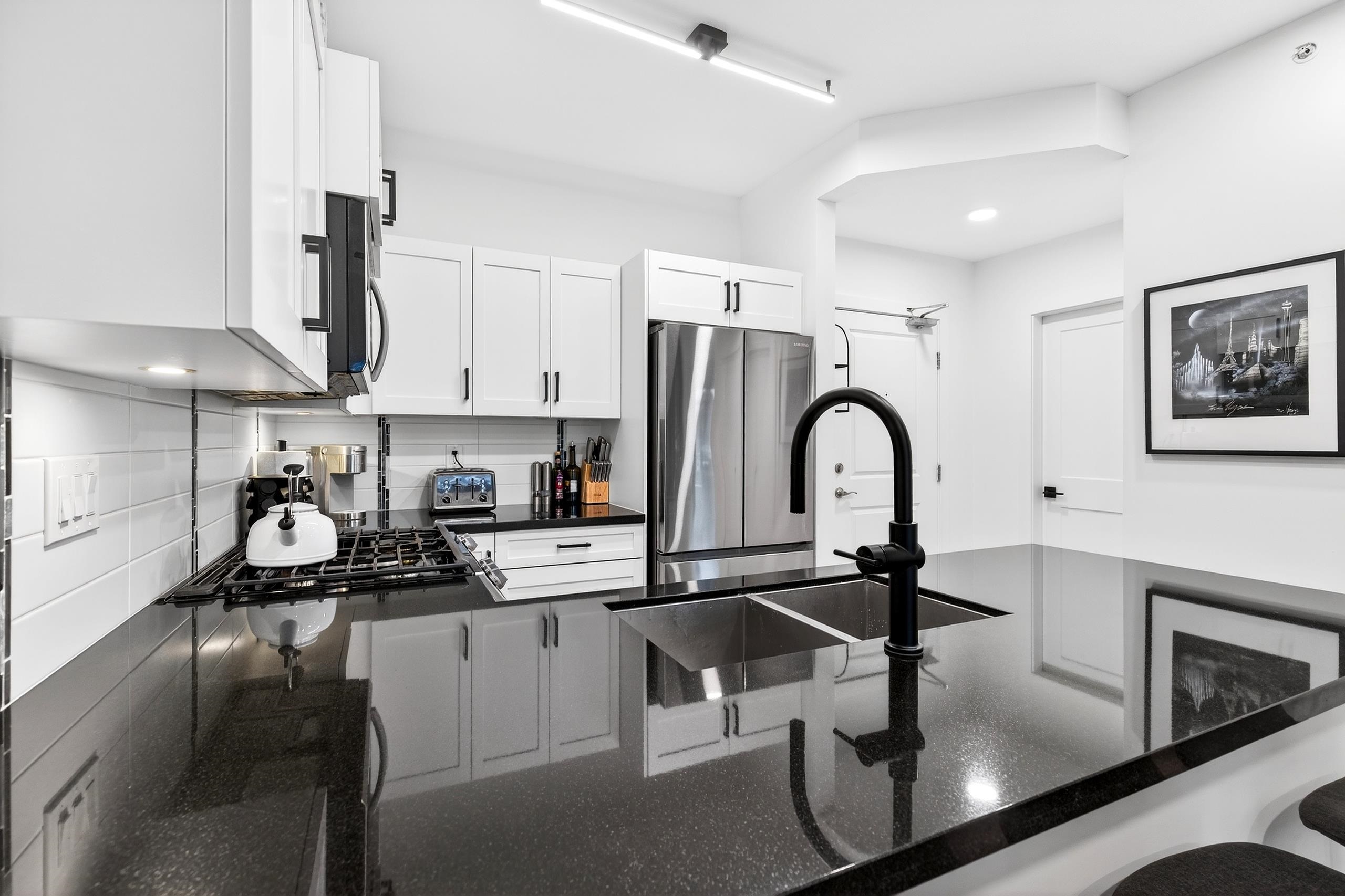 Stunning TOP FLOOR home in the highly sought-after Varsity, overlooking greenery and the North Shore mountains with beautiful sunset VIEWS. This bright, open-concept unit features vaulted ceilings, oversized windows, an updated kitchen, brand-new washer & dryer, plus all new interior doors throughout. The spacious bedroom offers a walk-through closet and cheater ensuite, an ideal one-bedroom layout. Enjoy your private balcony with gas hookup, perfect for year-round use. Unbeatable location near the future S...