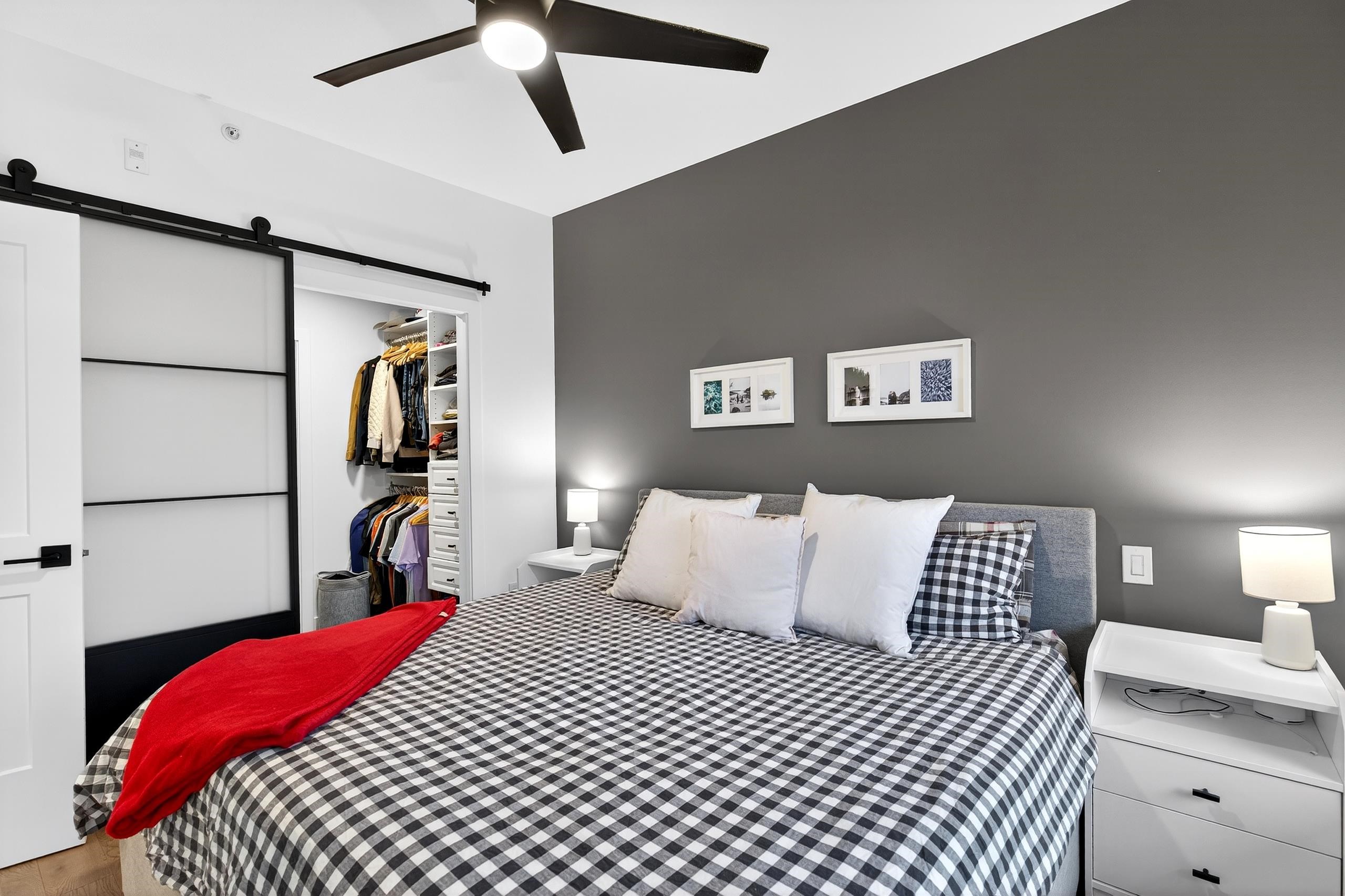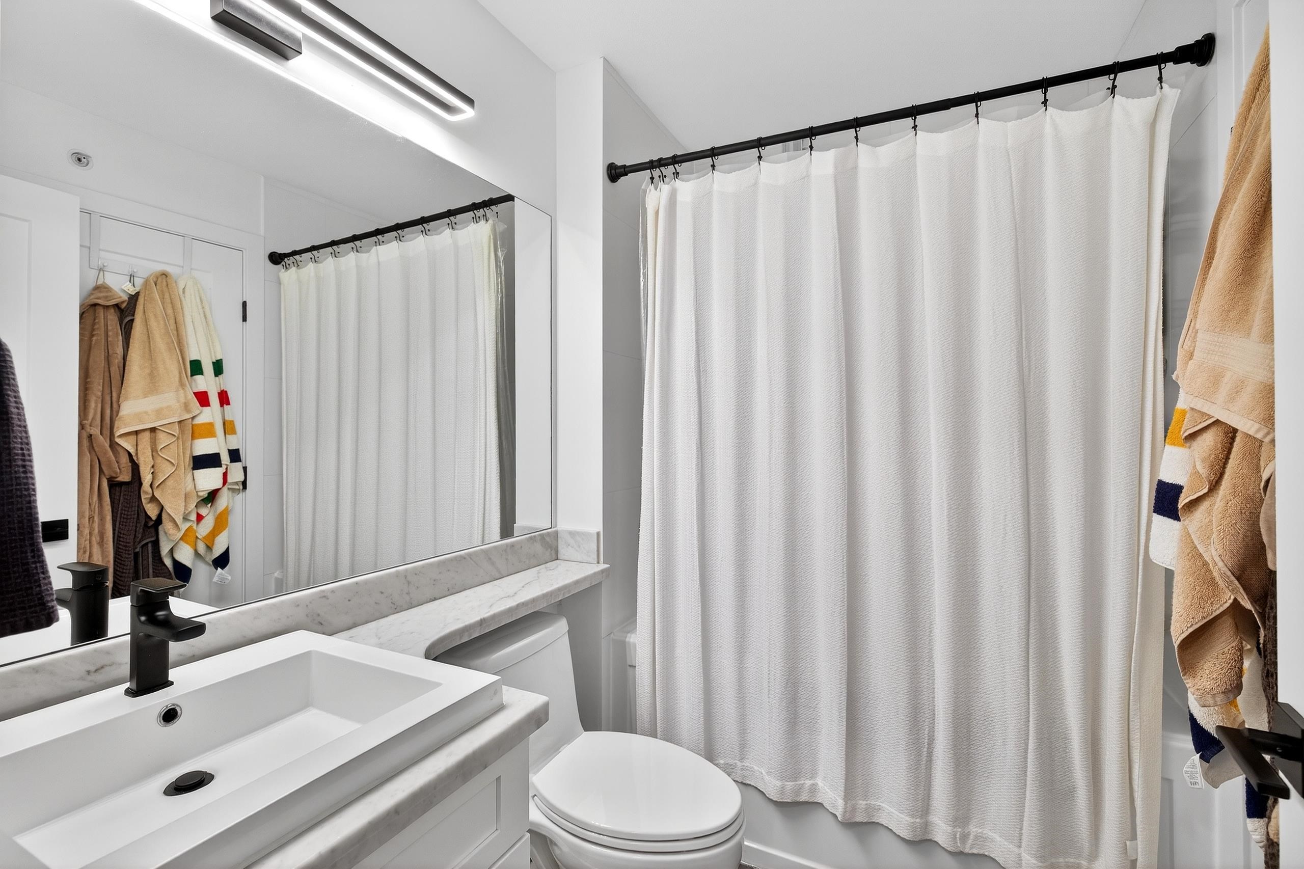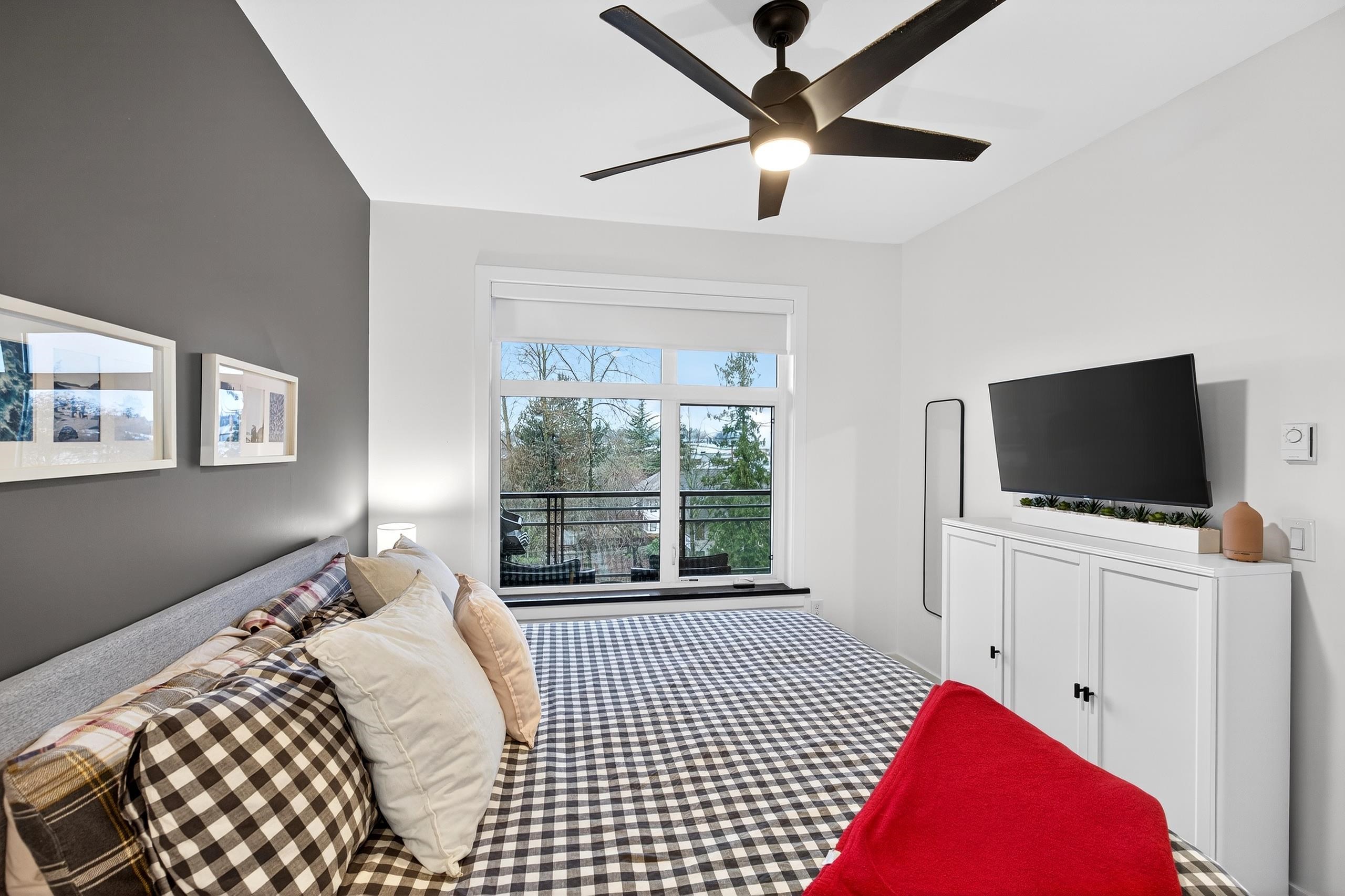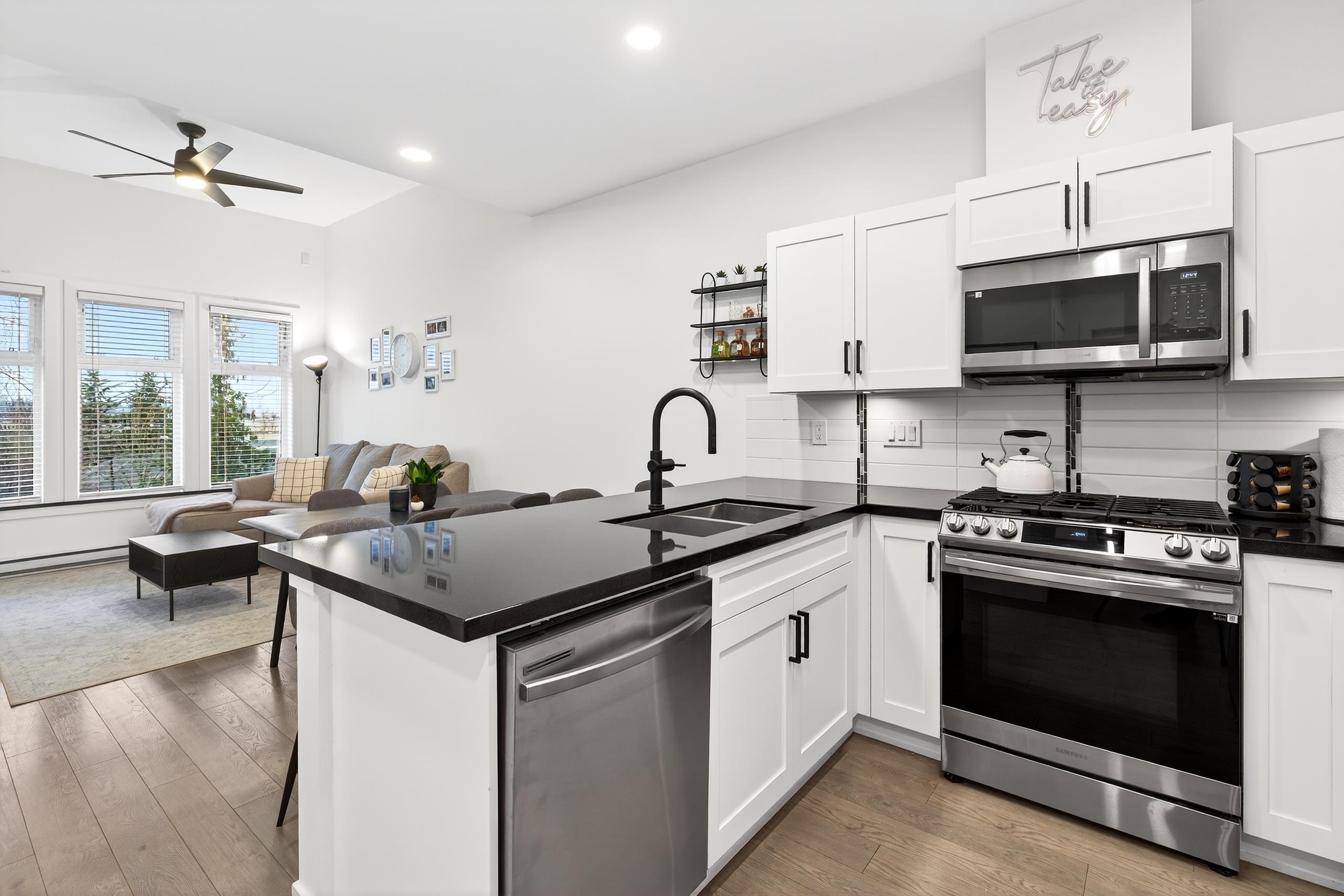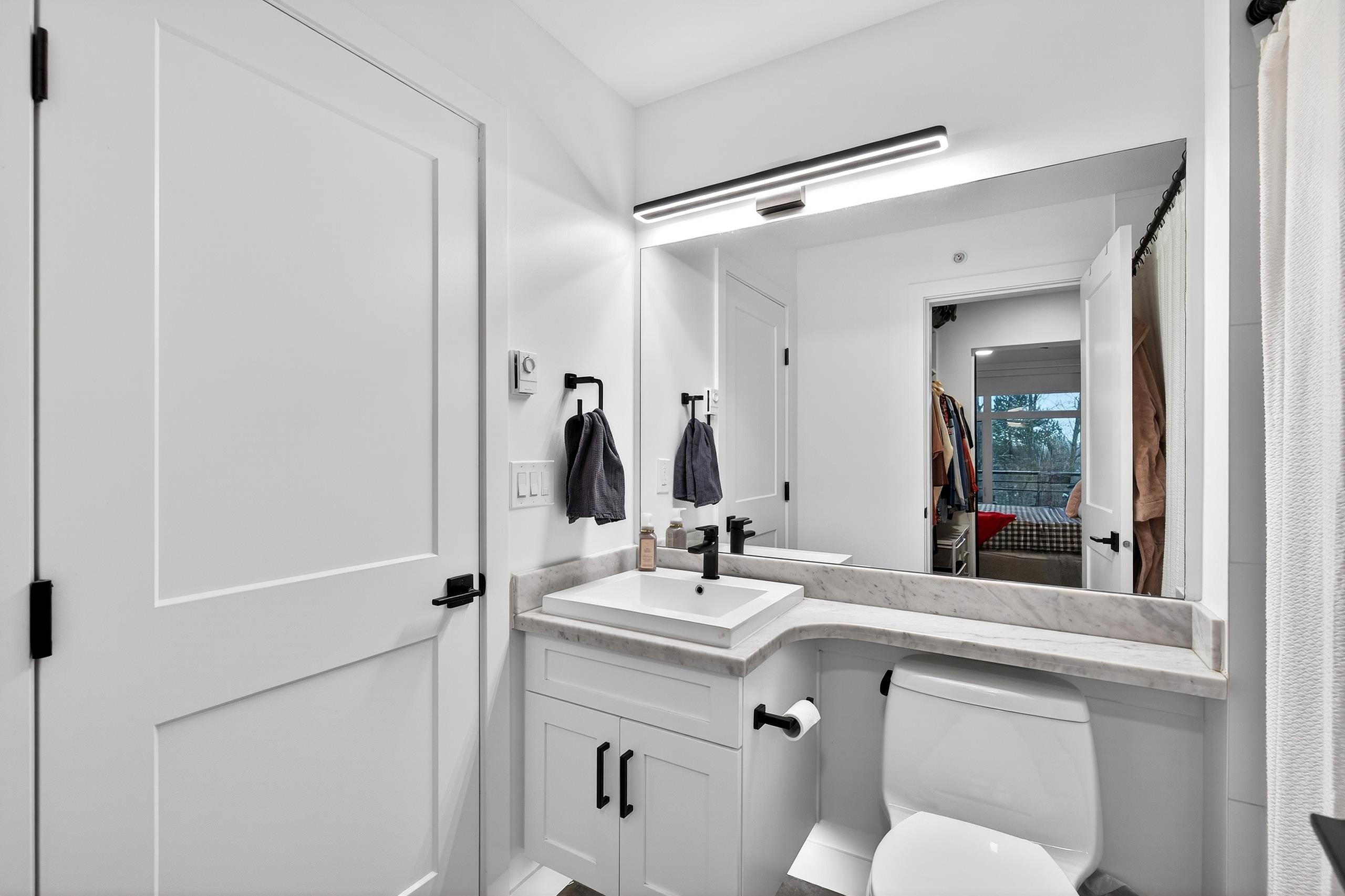 Stunning TOP FLOOR home in the highly sought-after Varsity, overlooking greenery and the North Shore mountains with beautiful sunset VIEWS. This bright, open-concept unit features vaulted ceilings, oversized windows, an updated kitchen, brand-new washer & dryer, plus all new interior doors throughout. The spacious bedroom offers a walk-through closet and cheater ensuite, an ideal one-bedroom layout. Enjoy your private balcony with gas hookup, perfect for year-round use. Unbeatable location near the future S...