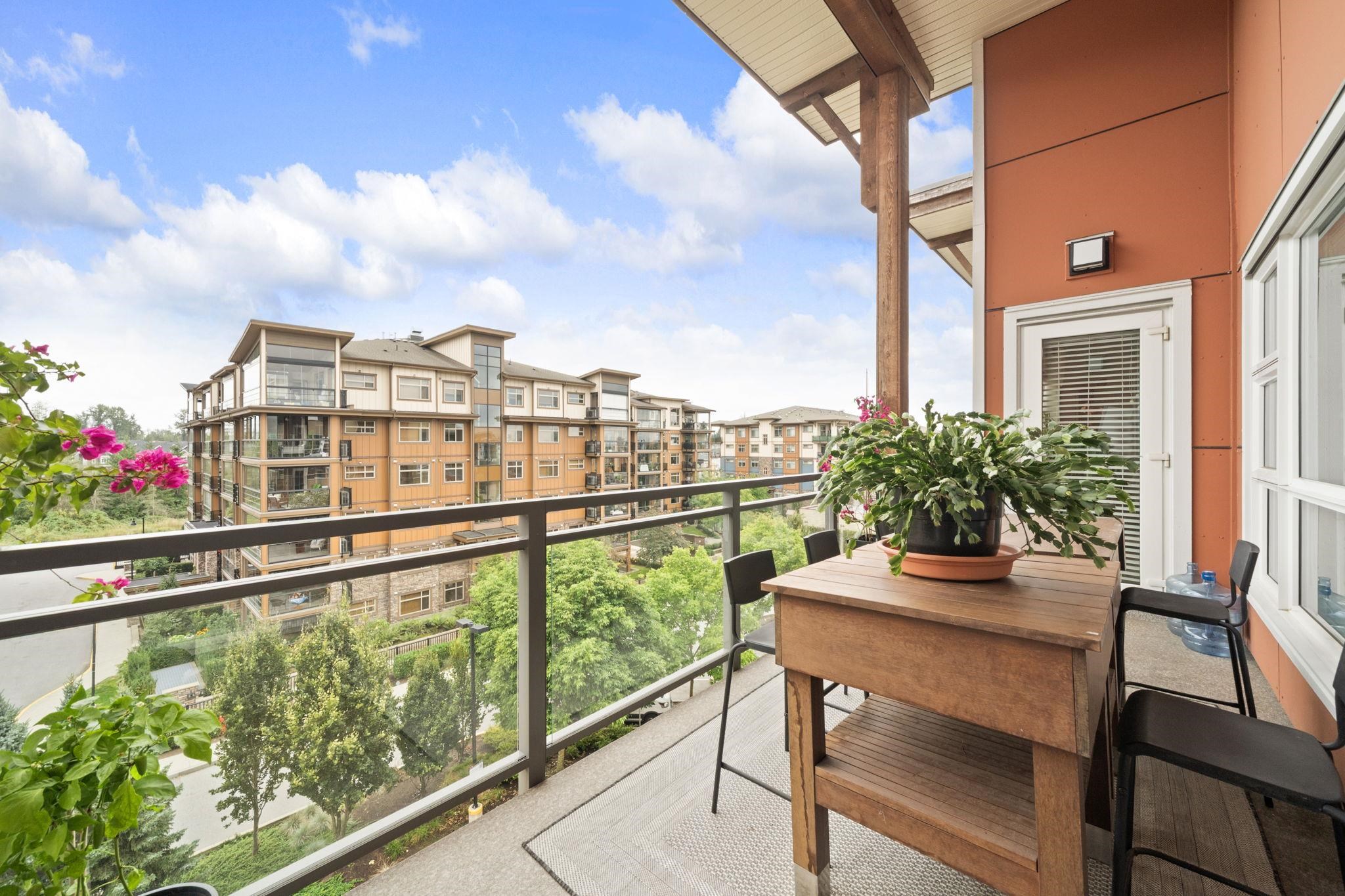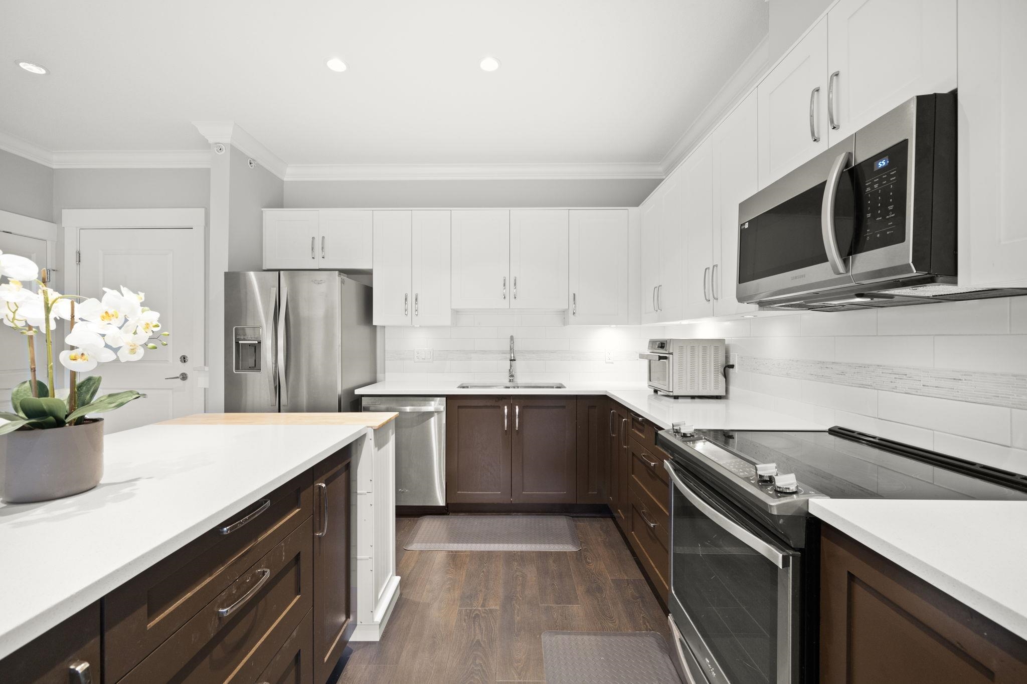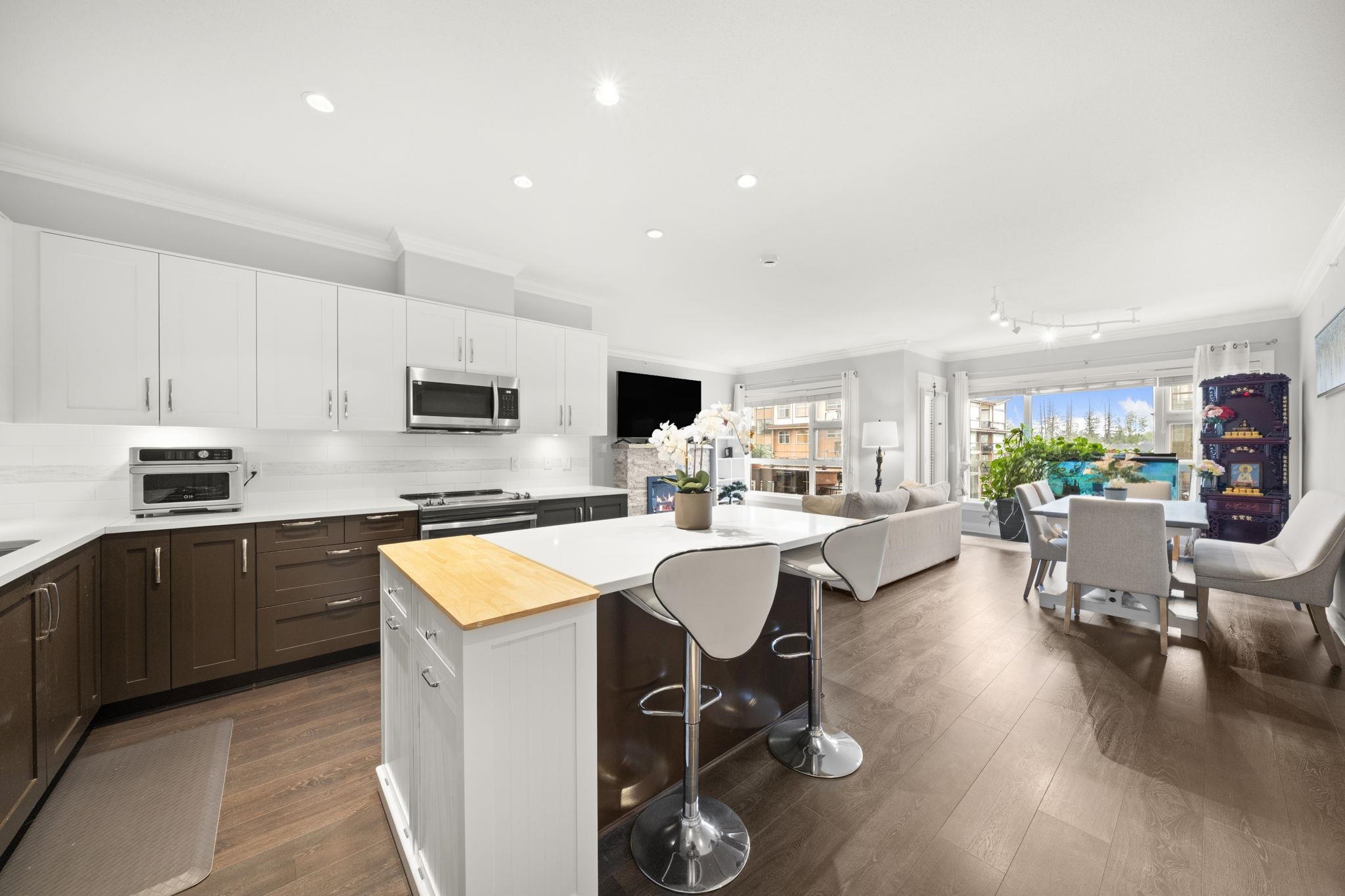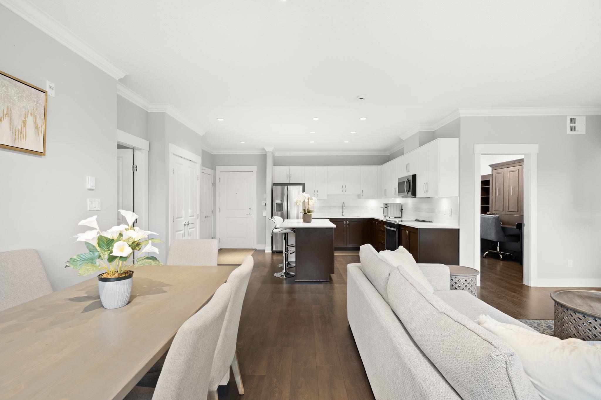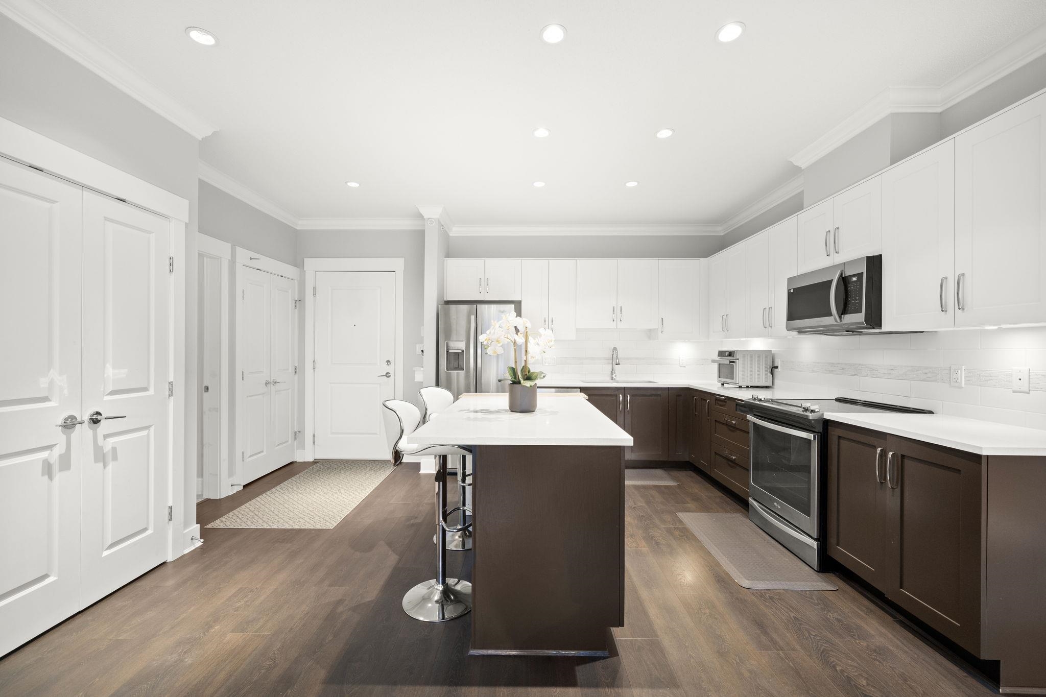 Exquisite Top-Floor Residence at The Kensington, Willoughby Town Centre. This 1,240 sq.ft. south-facing home offers a sophisticated open with 2 bedrooms + den, soaring 9-ft ceilings, and two private sundecks. Elegant details include crown mouldings, a feature fireplace, and refined neutral palette. The gourmet kitchen showcases a large island, quartz counters, and premium stainless steel appliances. Added conveniences: in-suite laundry with storage, two prime parking stalls (fits full-size truck), and a sto...