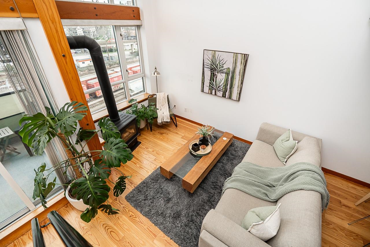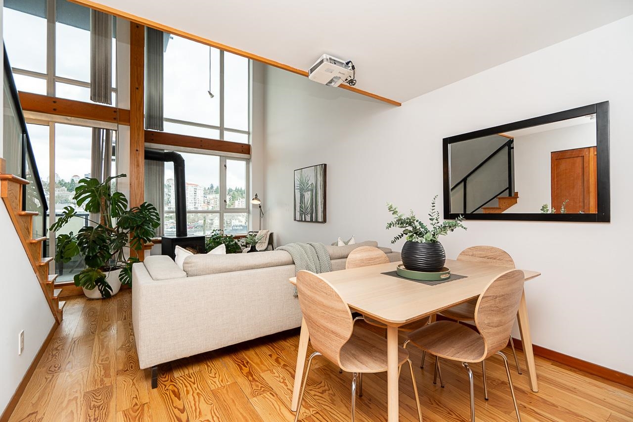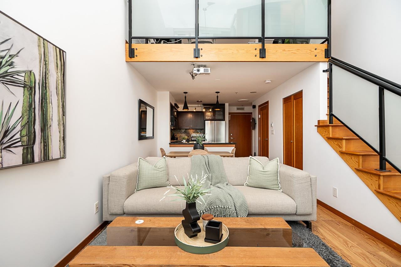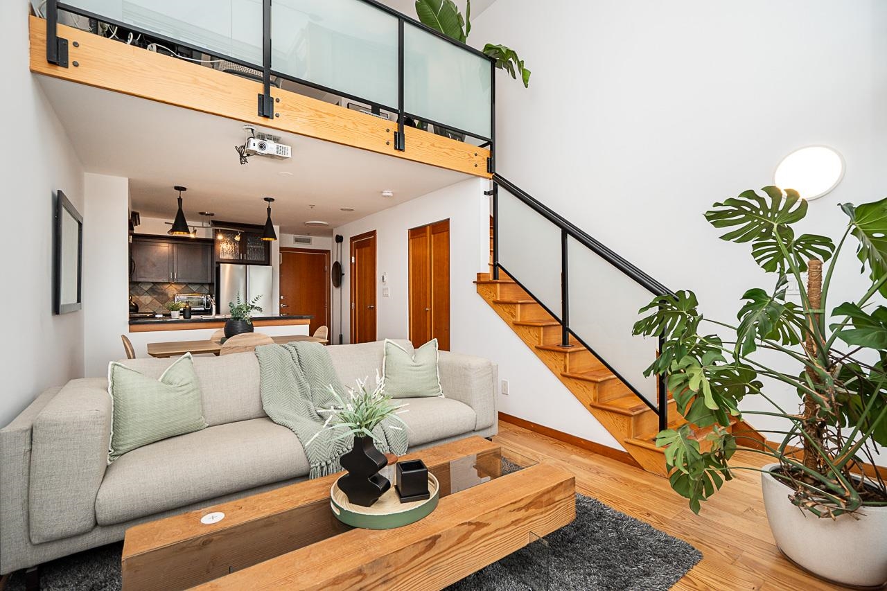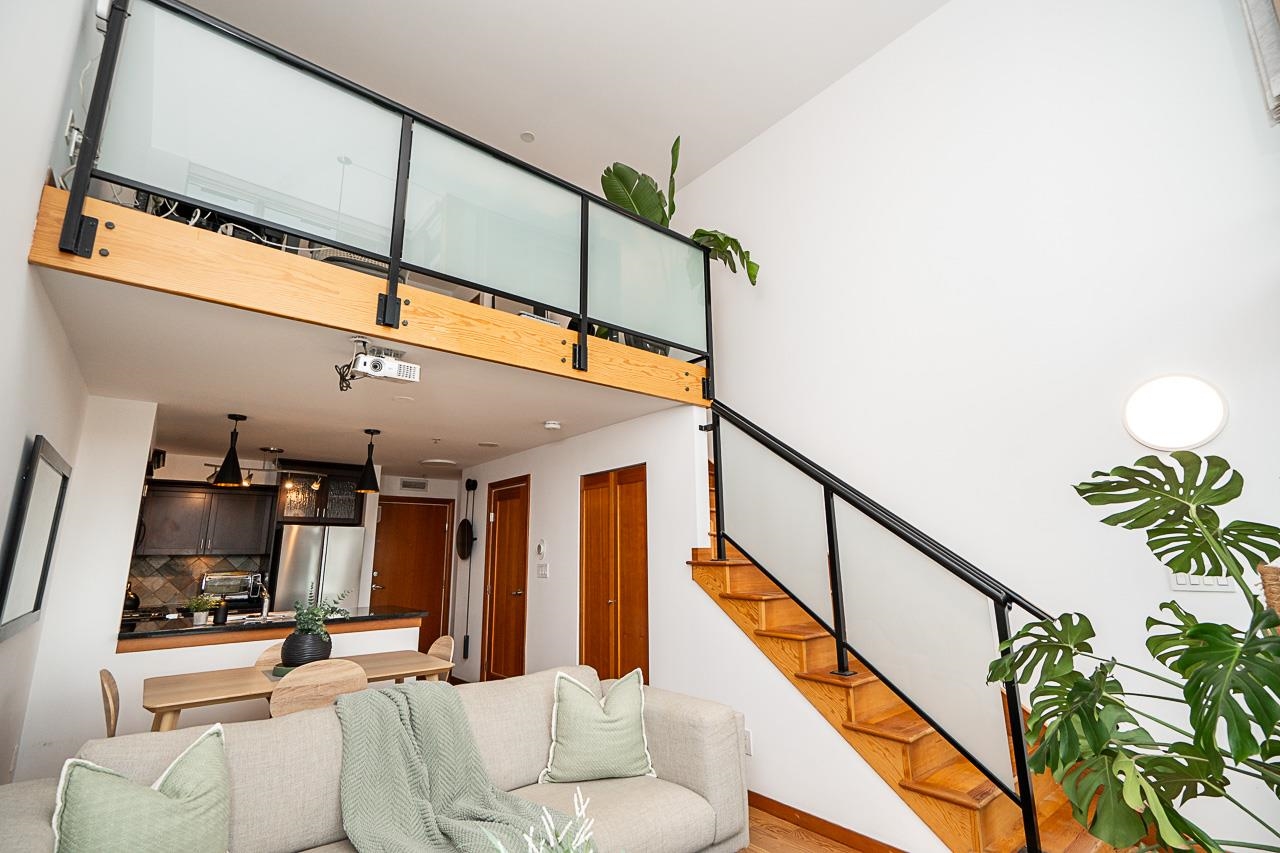 Welcome to Murano Lofts by Aragon Properties, where heritage charm meets modern loft living in a peaceful waterfront community. This bright two-level loft features 16’7” ceilings and expansive windows that fill the home with natural light. The open kitchen offers quartz countertops, a gas range, stainless steel appliances, and ample cabinetry. Upstairs, the spacious loft-style bedroom easily fits a king bed and includes a walk-in closet. Warm fir wood floors and a cozy natural gas fireplace add character. A...