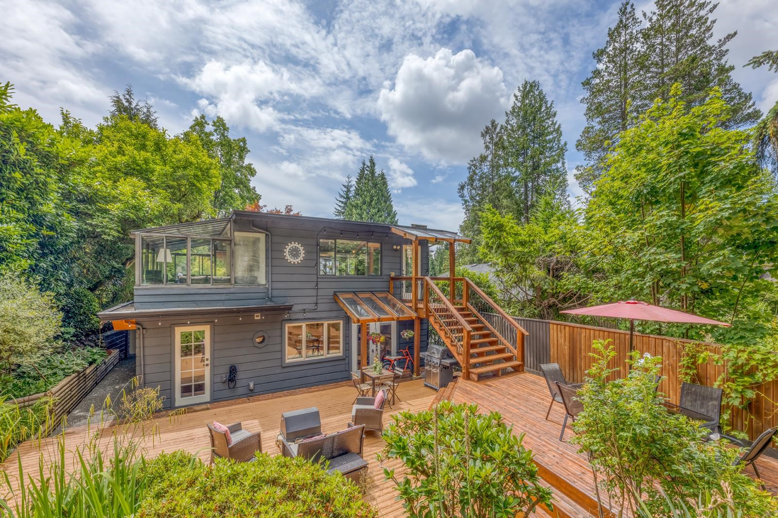 Gorgeous post-and-beam home on a quiet, tree-lined street in Upper Lonsdale. Family home updated living with a reverse floor plan maximizing light and privacy. Vaulted ceilings, exposed beams, and a stunning glass-enclosed solarium bring the outdoors in. Spacious primary suite with walk-in closet and French doors to a lush, multi-tiered deck and landscaped yard. Open-concept kitchen, large balcony, radiant heat, and carport. Steps to Carisbrooke School, parks, and trails. A private, architecturally timeless...