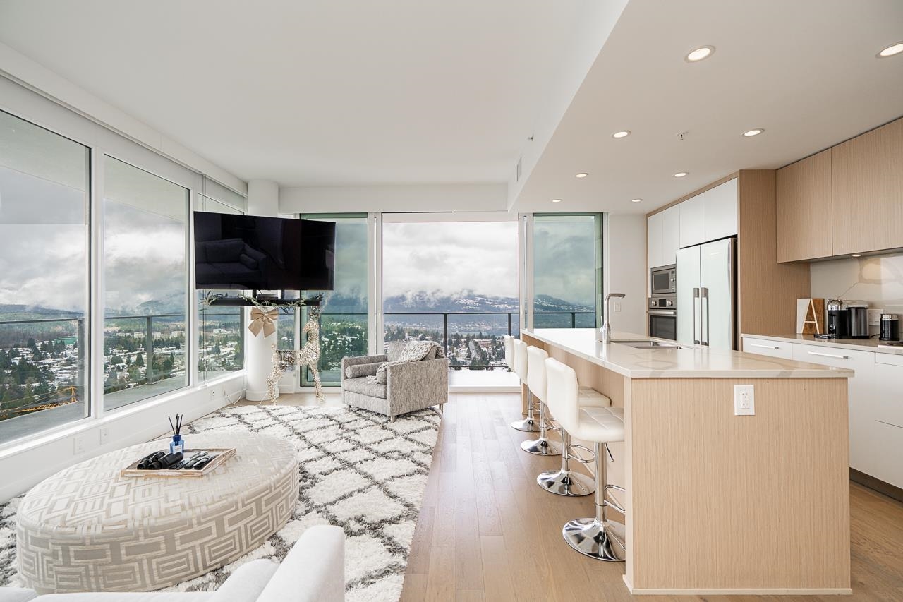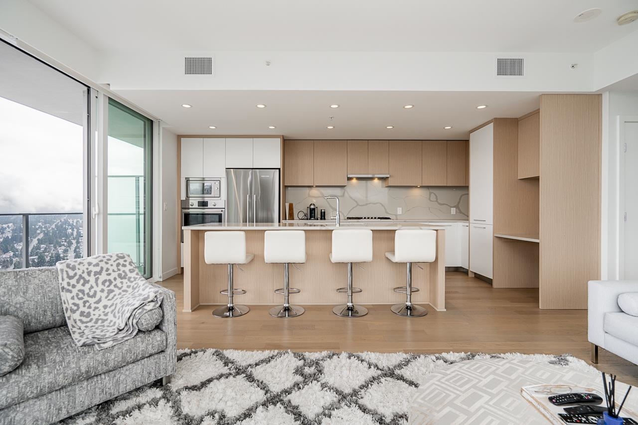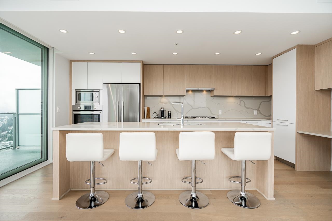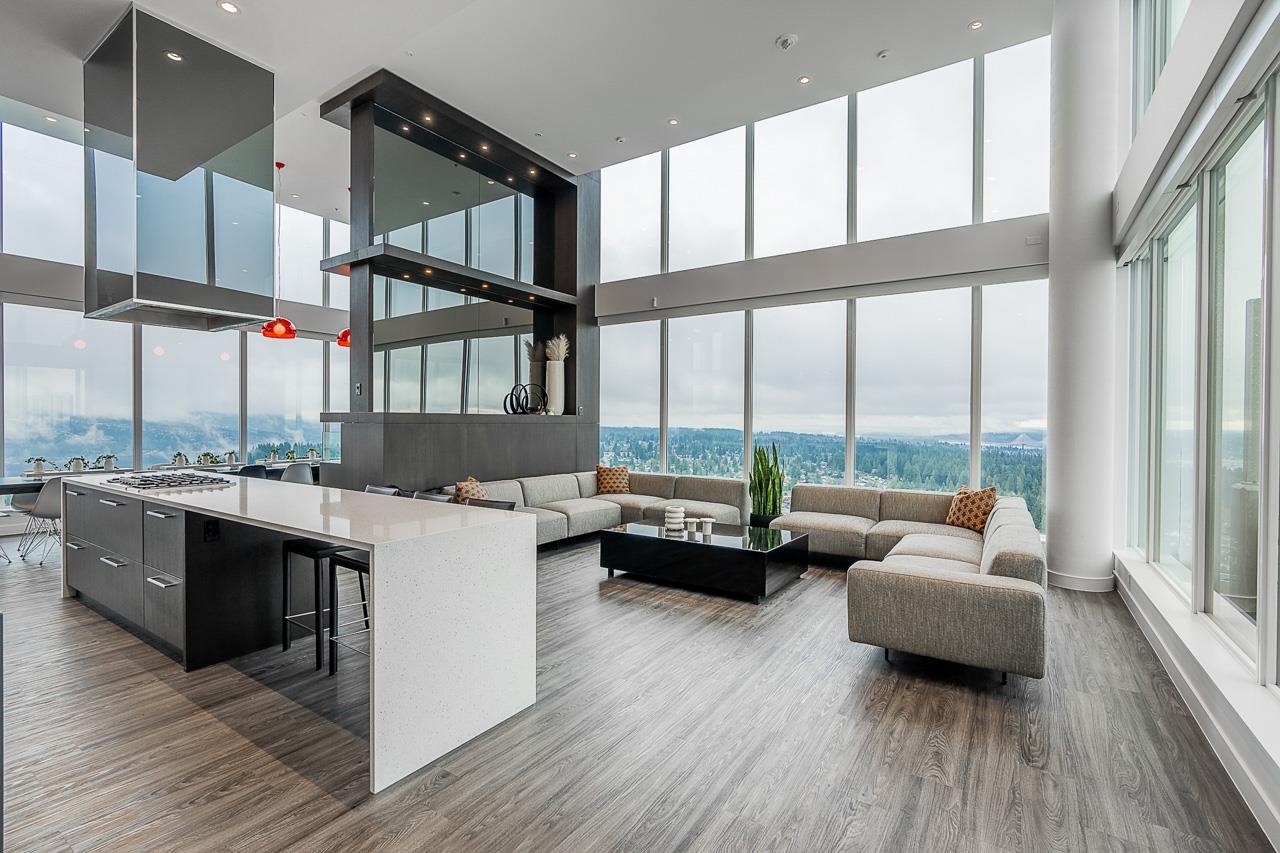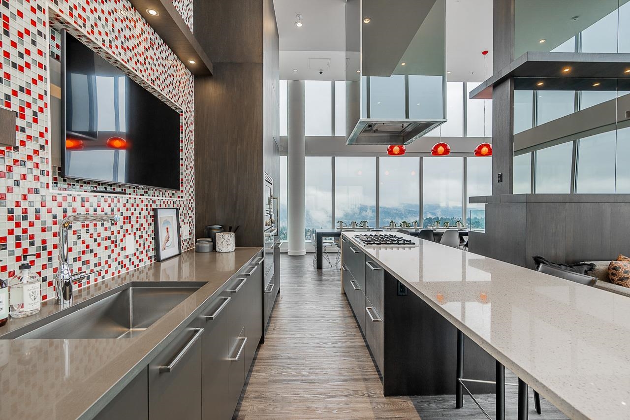 PENTHOUSE @ Clark & Como HIGH UP on 48th Floor!! 3 Bed + Den Corner offering approximately 1,400 sq ft of bright living space w/panoramic 360 water, mountain & city views from every room. Wrap around Balcony facing North, West, Primary bdrm facing South. Modern kitchen features lge island w/ High End appliances, wine cooler, gas stove, built-in oven, & built-in microwave perfect for cooking & entertaining. Enjoy the rare bonus 3 CAR PARKING STALLS + a double sized STORAGE locker. Located steps to Burquitl...