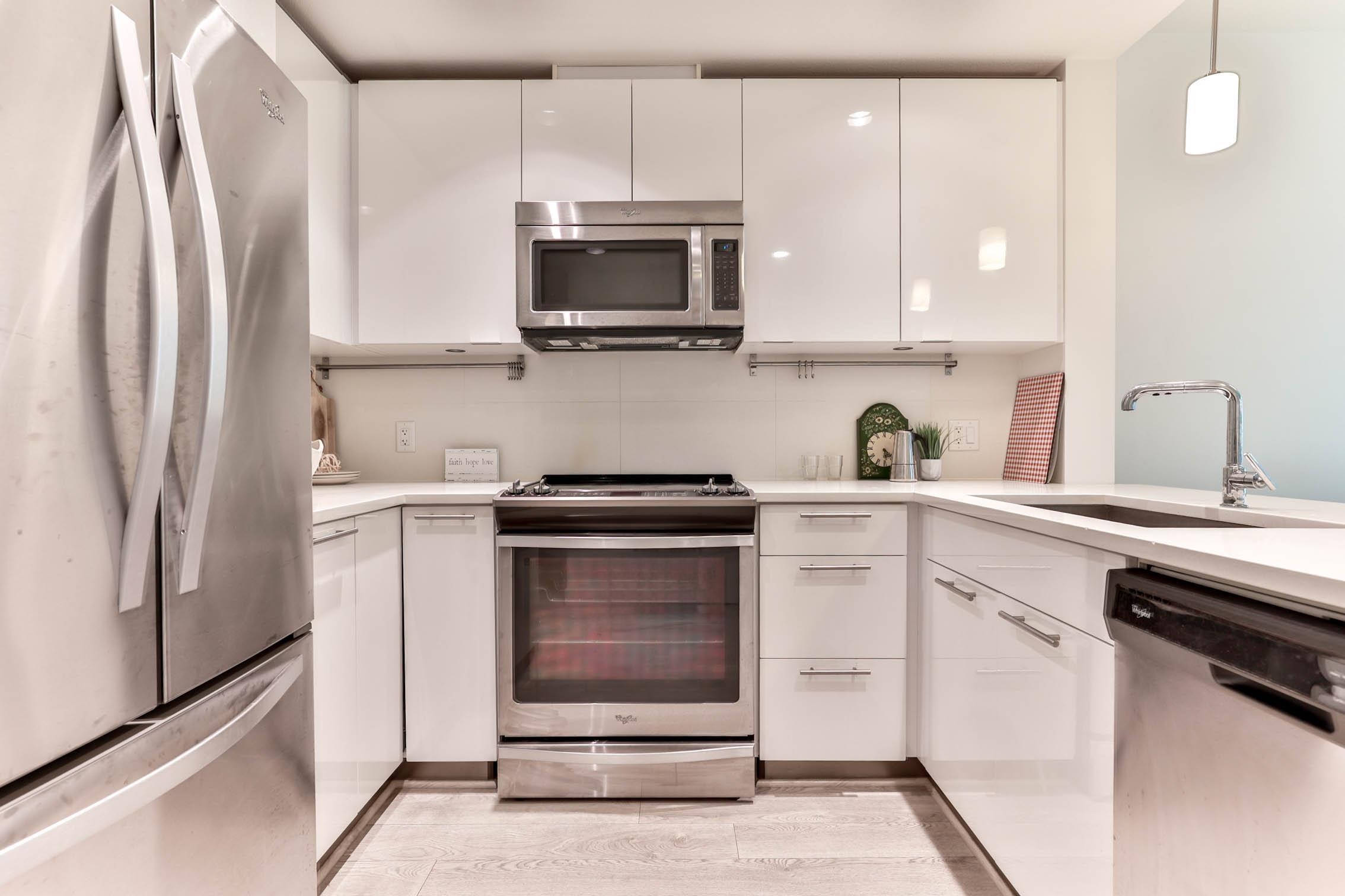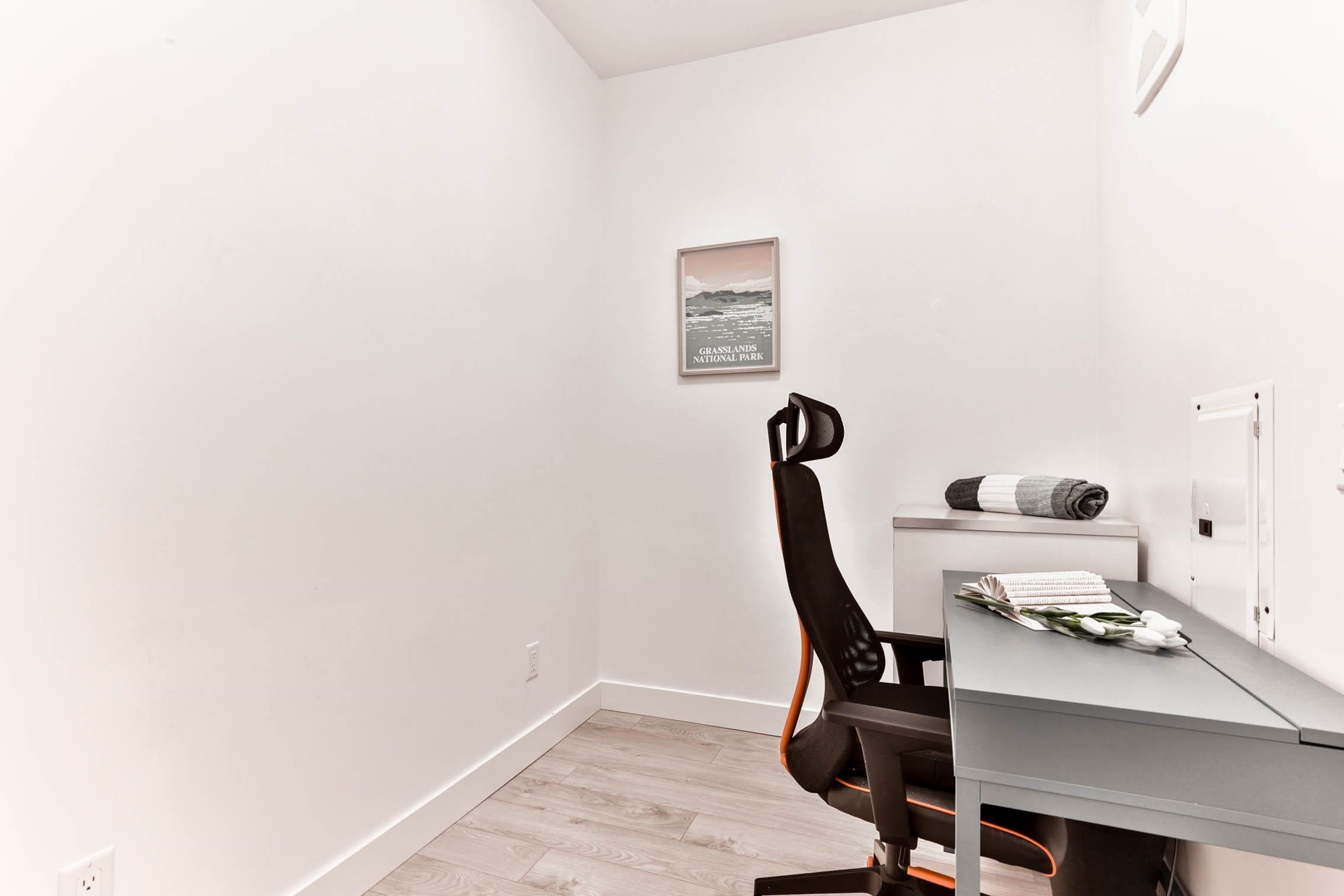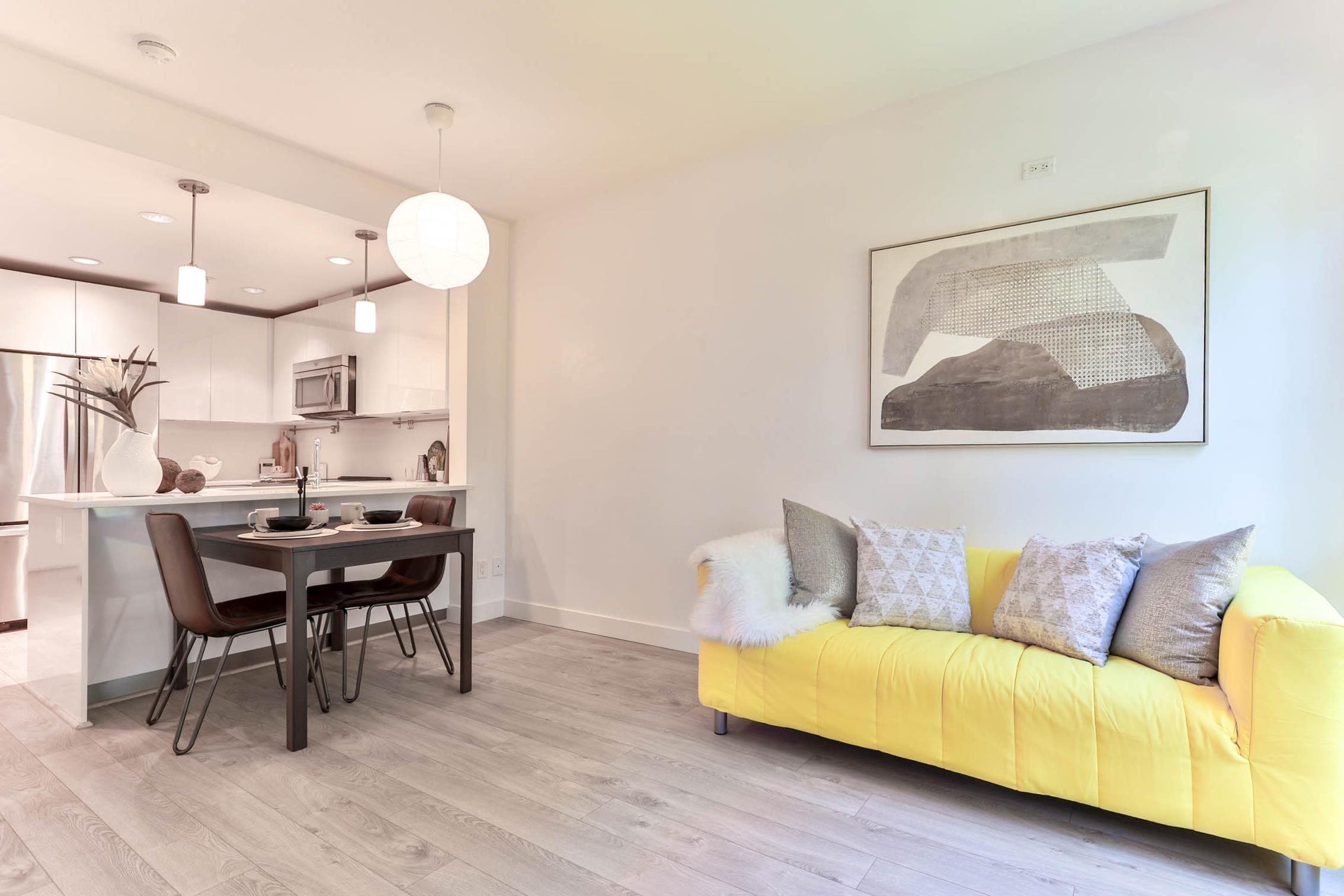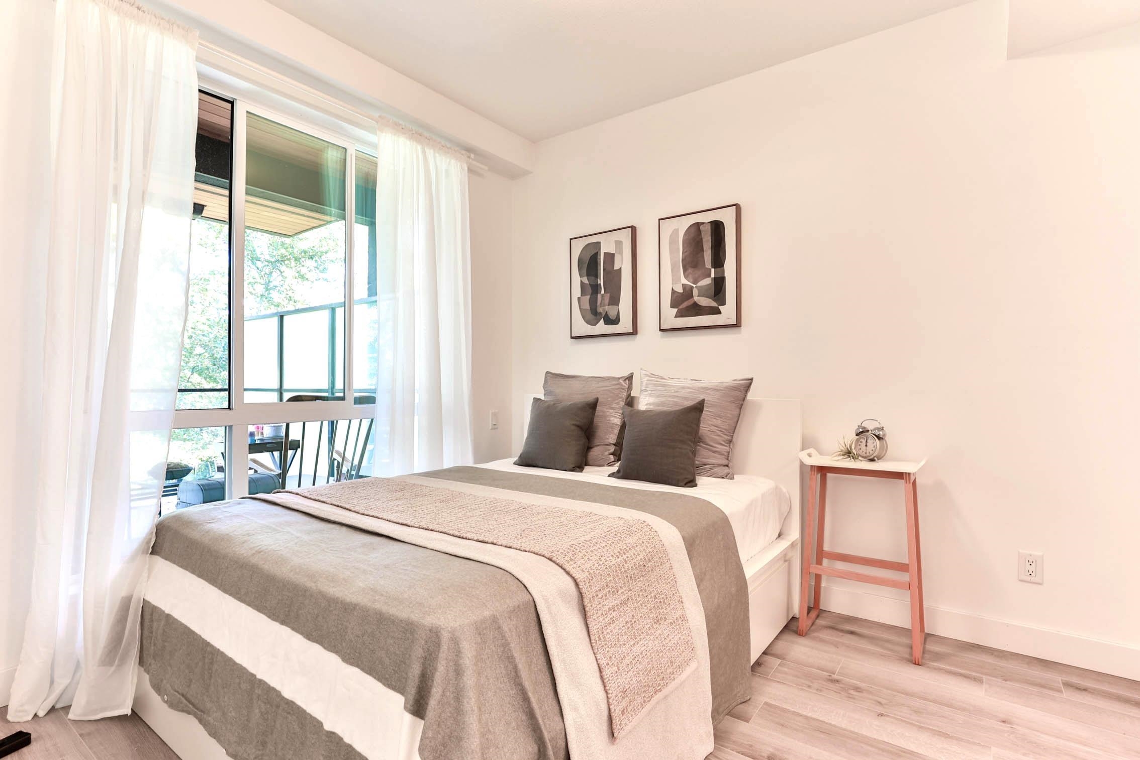 Experience contemporary West Coast architecture at its finest in this immaculate 1 bed + DEN condo, located in a LEED Gold certified building byAdera. This unit boasts high ceilings and an open kitchen layout with stunning views of the creek and Mosquito Creek Trail. The property offers aserene and private living experience with western exposure. The condo features laminate flooring throughout and is equipped with stainless steelappliances. The spacious den is versatile, suitable for use as a child's room o...