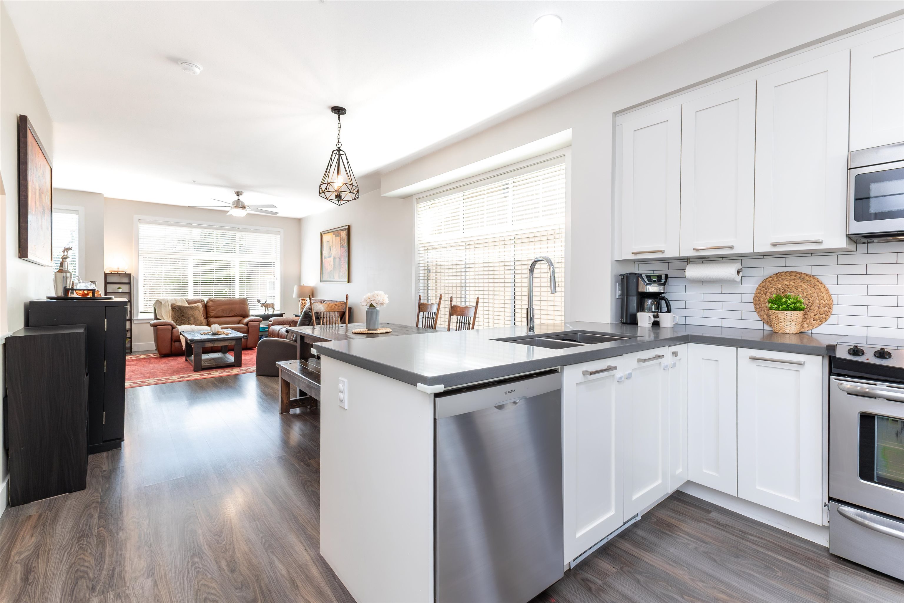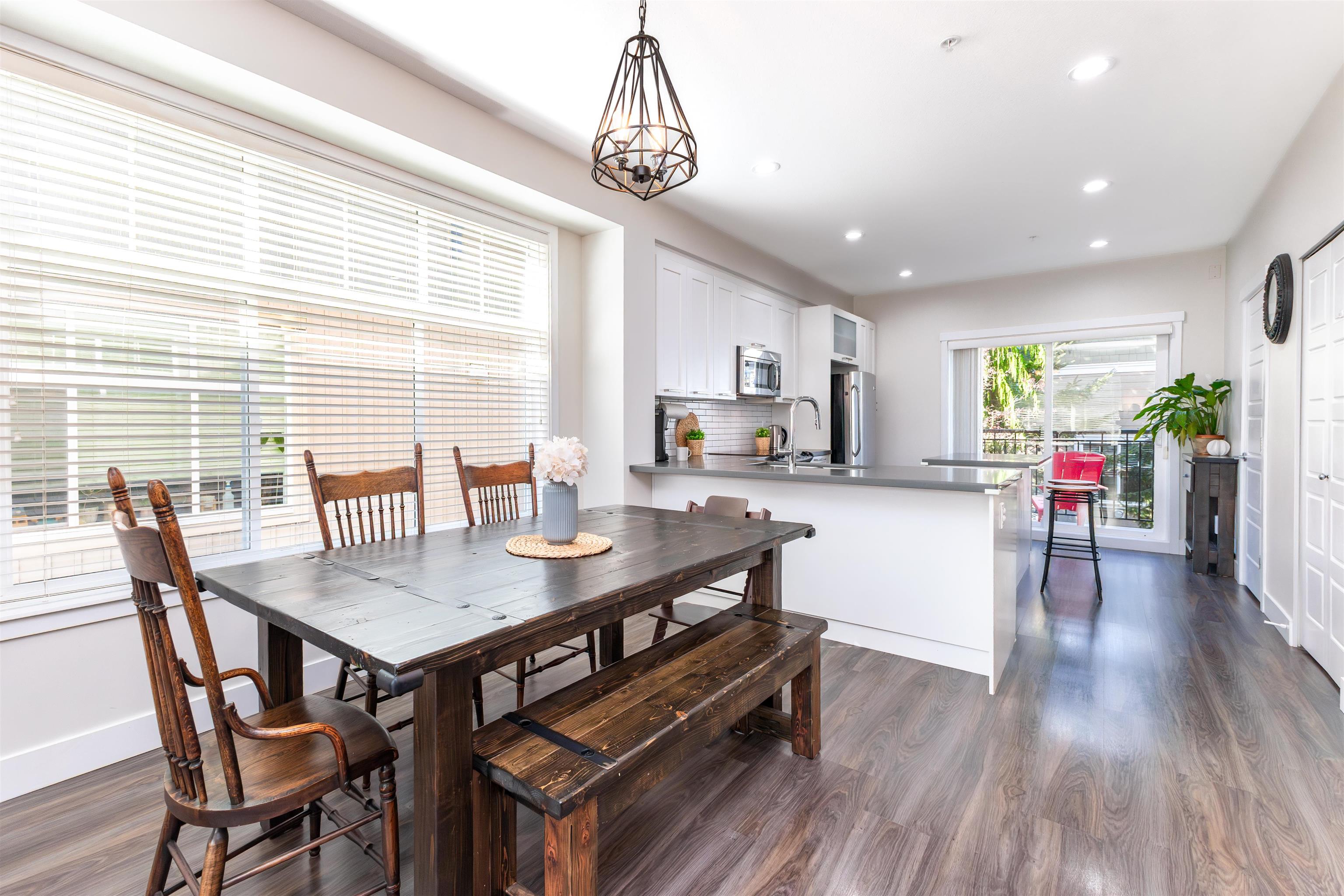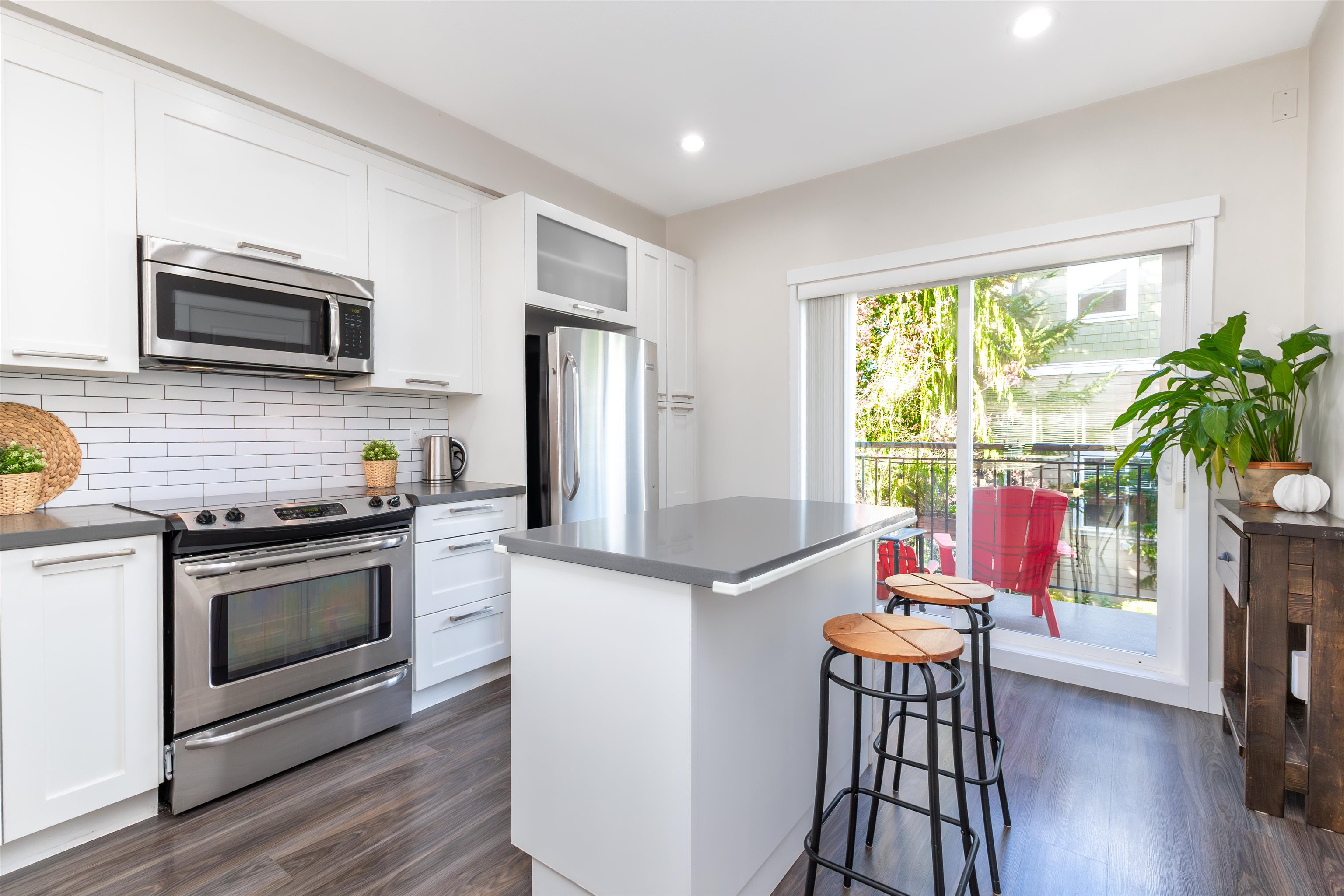 Nature's Walk Presents: Bright and gorgeous END UNIT. Main floor features open concept design with 9' ceilings, powder room, and lots of natural light with the extra windows. Kitchen boasts white shaker cabinetry, quartz countertops, stainless steel appliances, island with storage, and pantry. Balcony off the kitchen overlooking large fenced yard with mature trees for privacy. Upstairs you will find primary bedroom with vaulted ceilings, 3 pc ensuite and walk through closets. 2 additional bedrooms upstairs ...