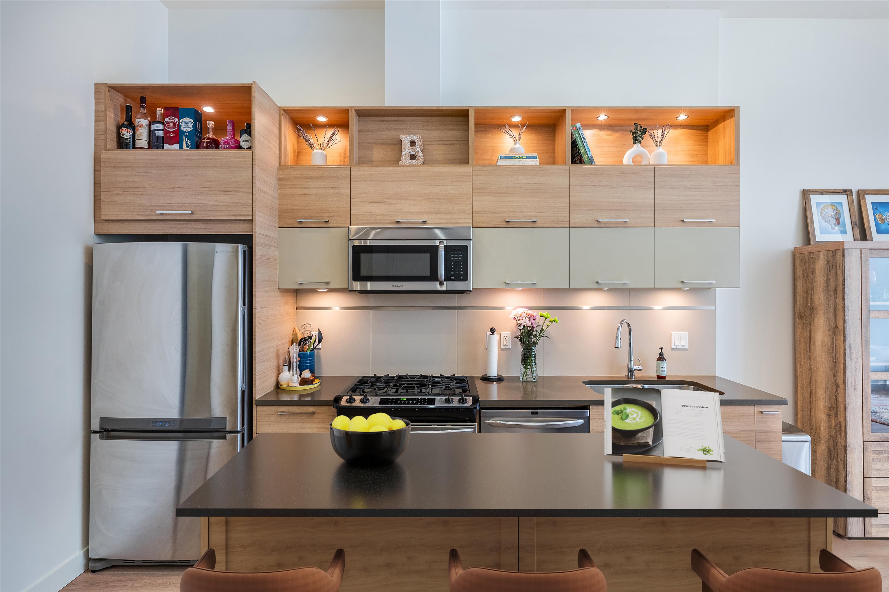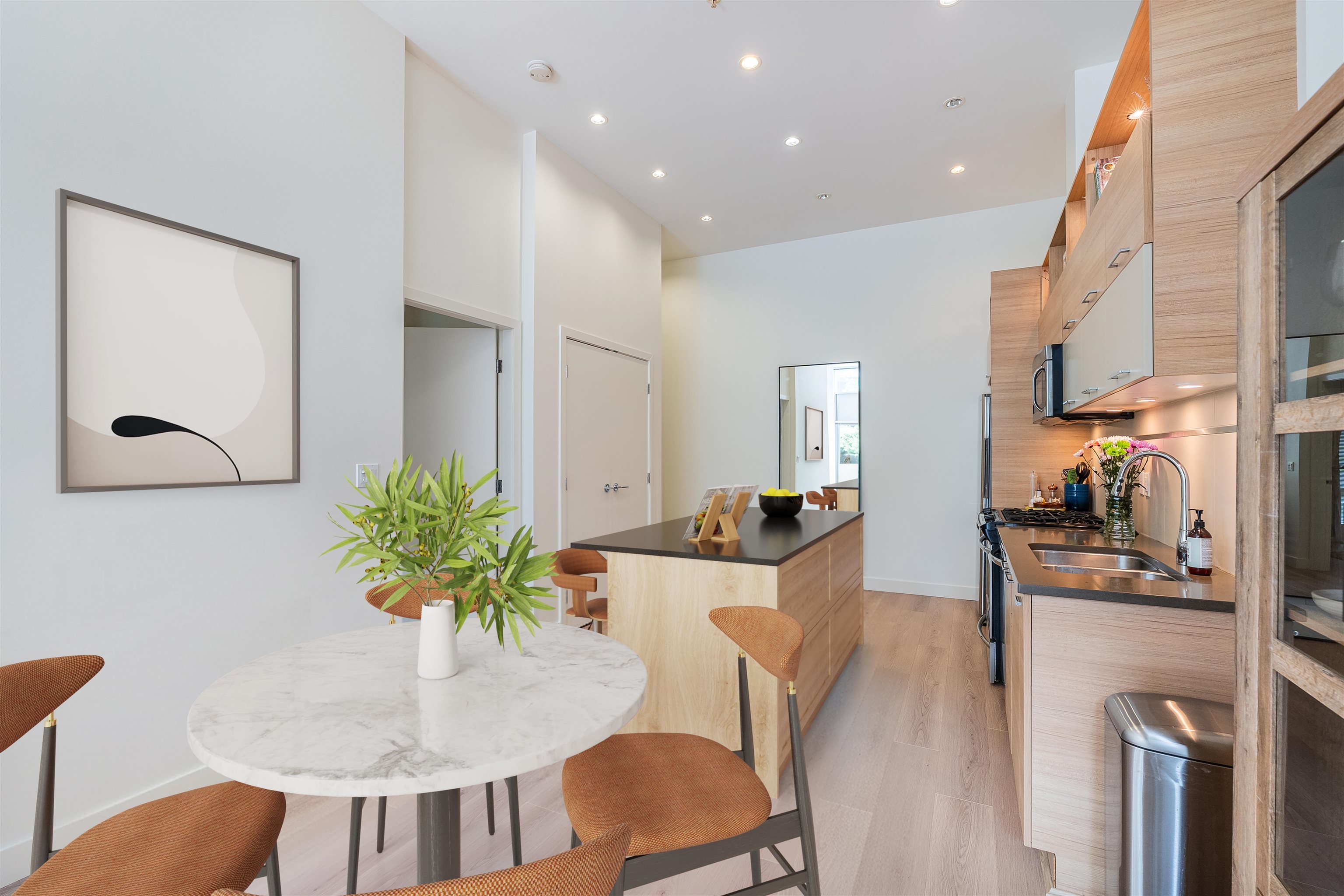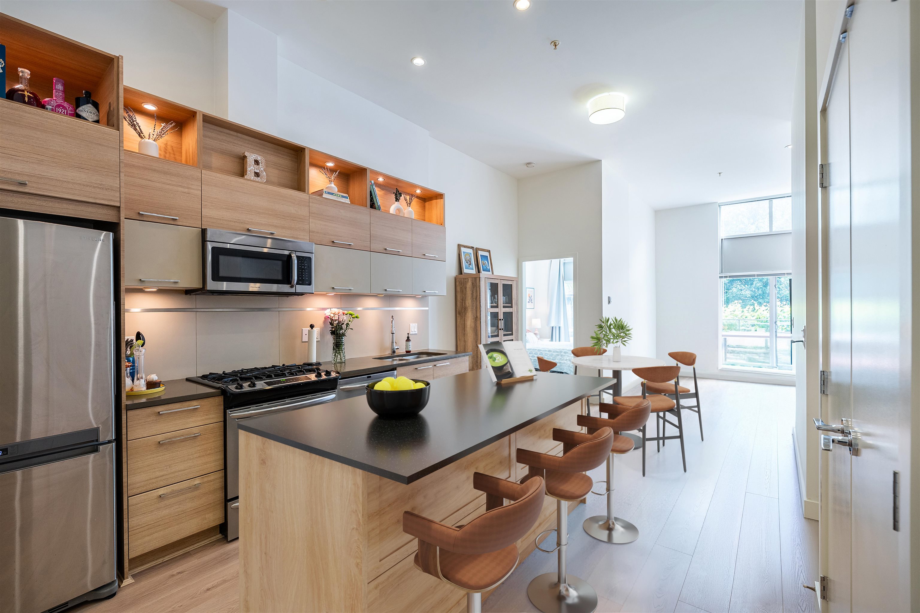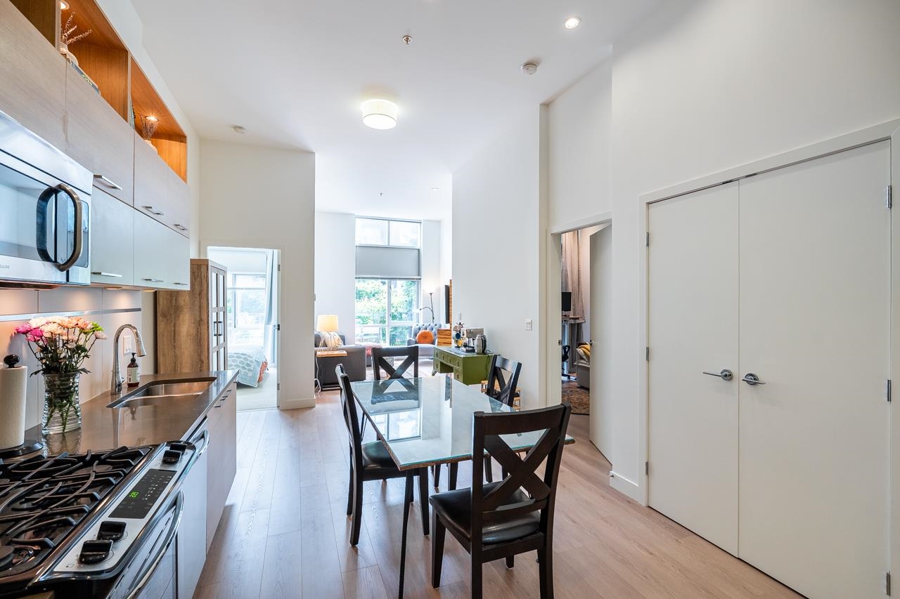 Townhouse style entry off your expansive, private, gated, south facing patio. Step inside to soaring 11'6 foot ceilings and over height double windows. Enjoy the comforts of in-floor radiant heating, a modern linear kitchen with stainless steel appliances, gas cooktop, loads of cabinets & polished quartz countertops. Showcasing brand new laminate flooring & carpets. Perfect for shared living, bedrooms and baths on opposite side of living space. Situated in SFU's sought-after UniverCity community: steps to ...
