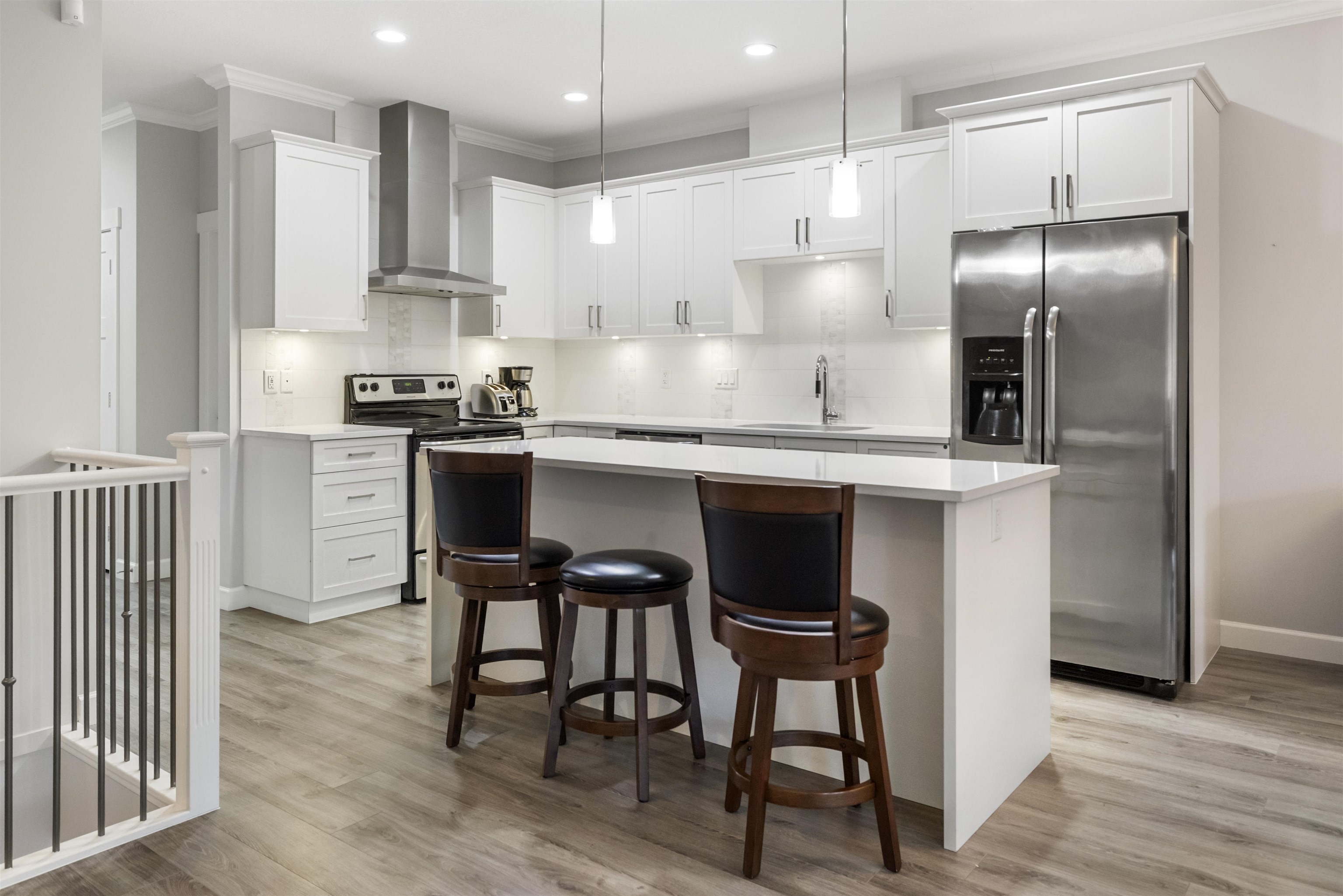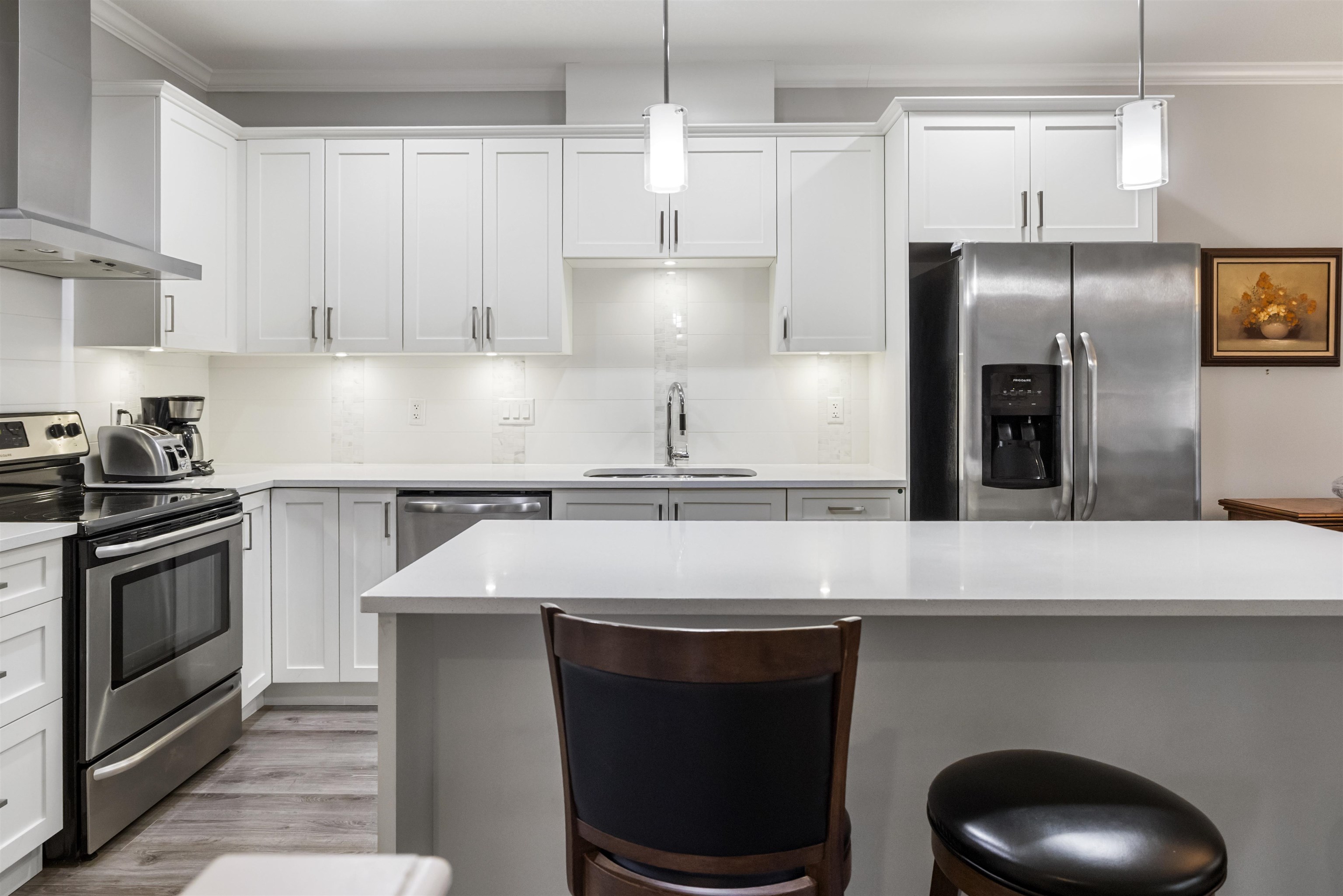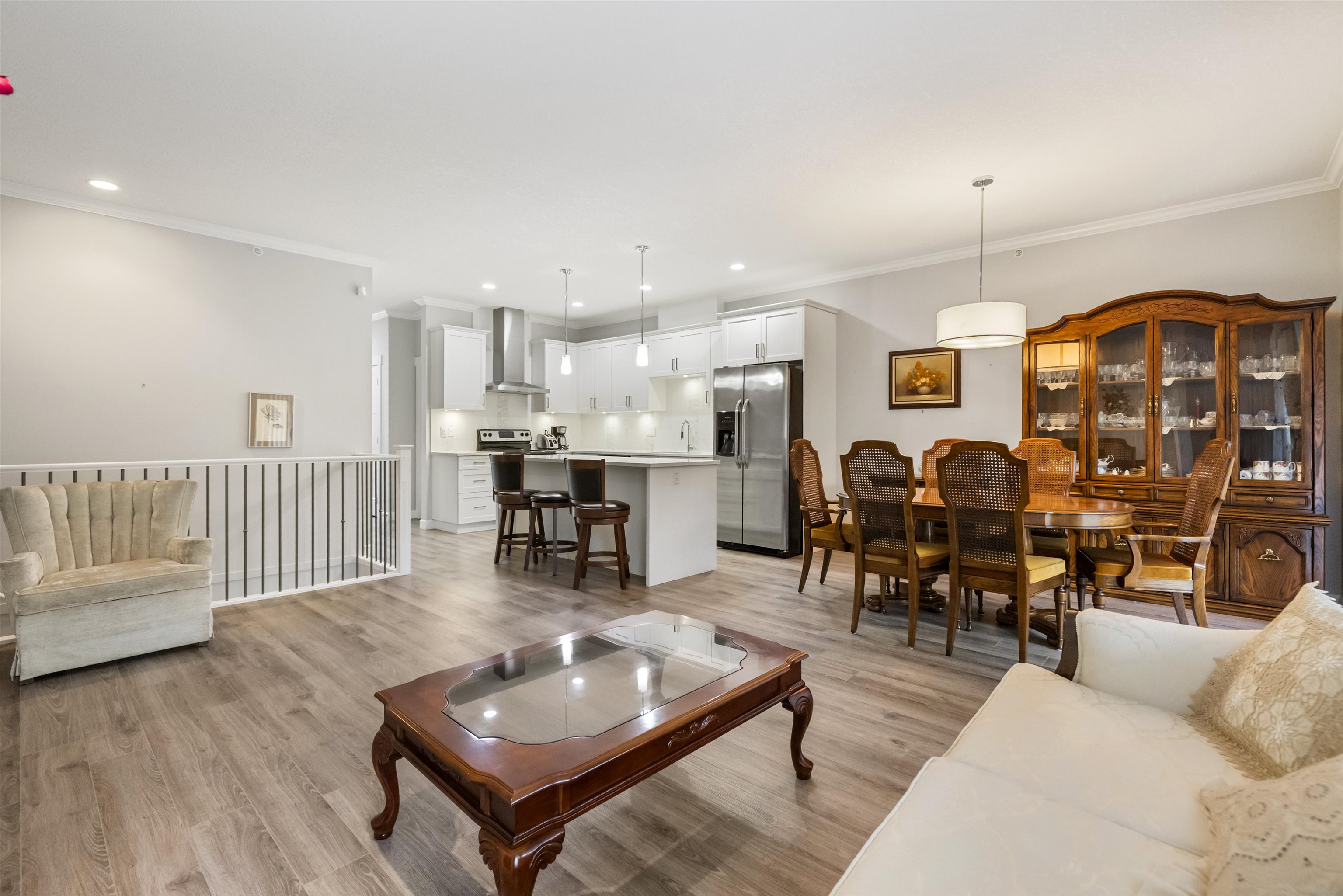 This spacious rancher style townhouse offers an exceptional layout with main level living and a fully finished basement. The primary bedroom is conveniently located on the main floor and features a generous walk-in closet and a private ensuite. The lower level impresses with a massive recreation room, den/media room, and kitchenette, ideal for entertaining, extended family, or flexible living space. A double-wide garage provides excellent parking and storage. Located close to schools, Willoughby Town Centre...