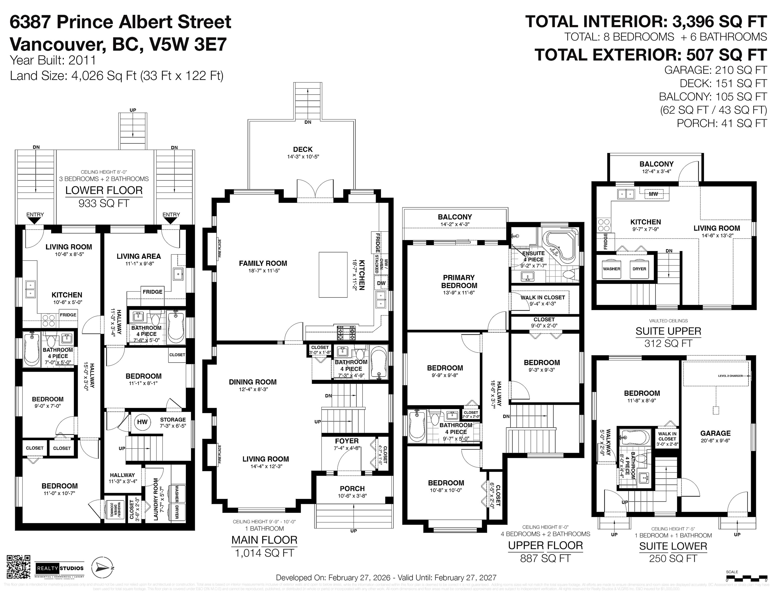 Quality 2011-built home with strong income potential, offering two legal suites plus a laneway home. The main residence features 11’ ceilings, engineered hardwood floors, radiant heating, and two gas fireplaces. Open living and dining areas with built-in storage connect to a well-appointed kitchen and den with large peninsula island stainless steel appliances, plus west-facing deck offers brilliant afternoon light. Second floor includes rare 4 bedrooms, including a primary with walk-in closet, ensuite, and ...