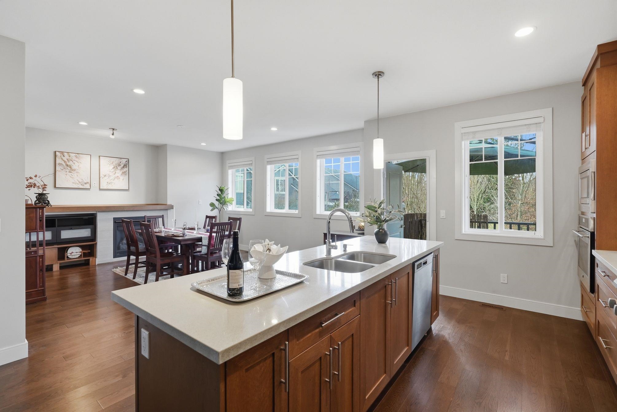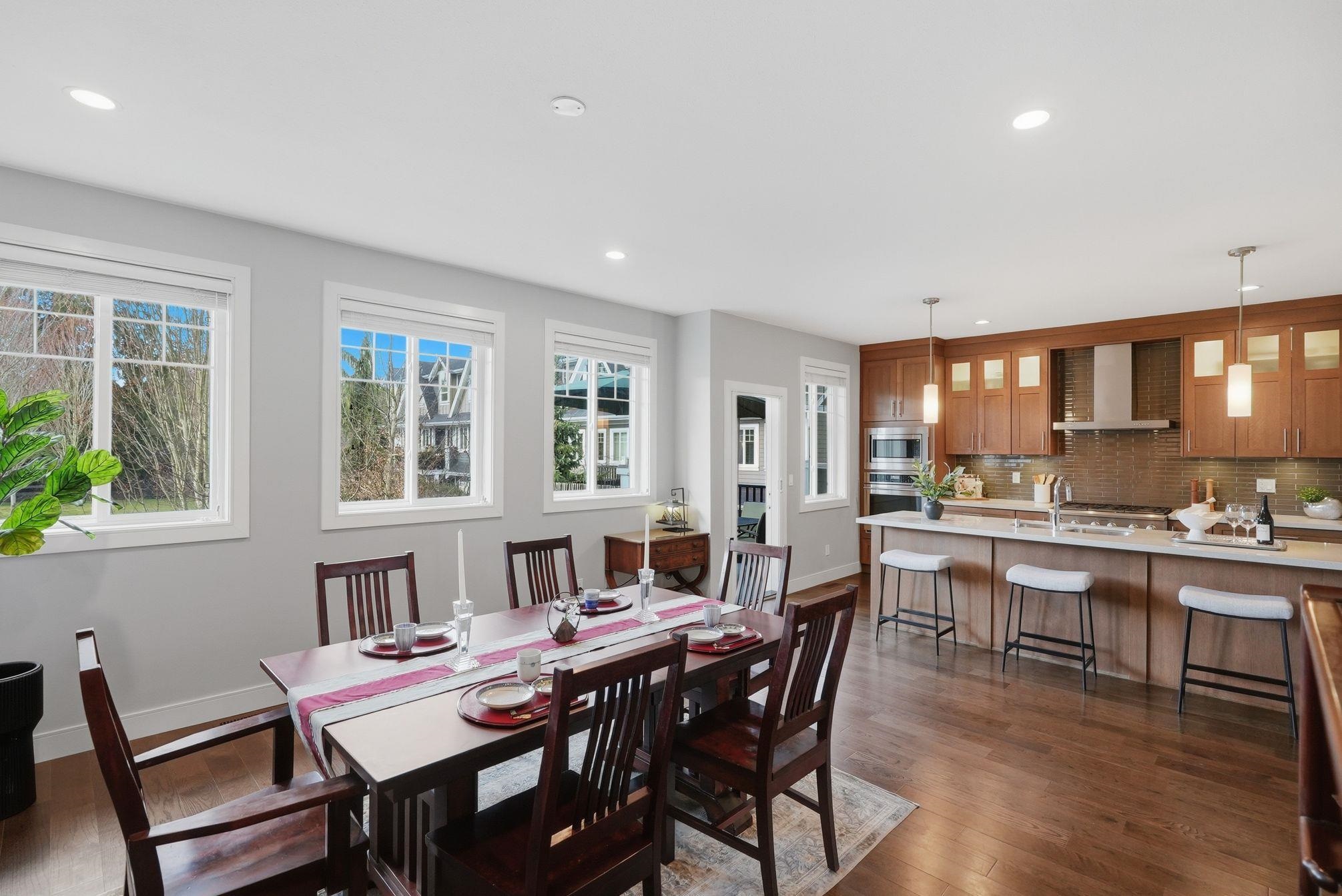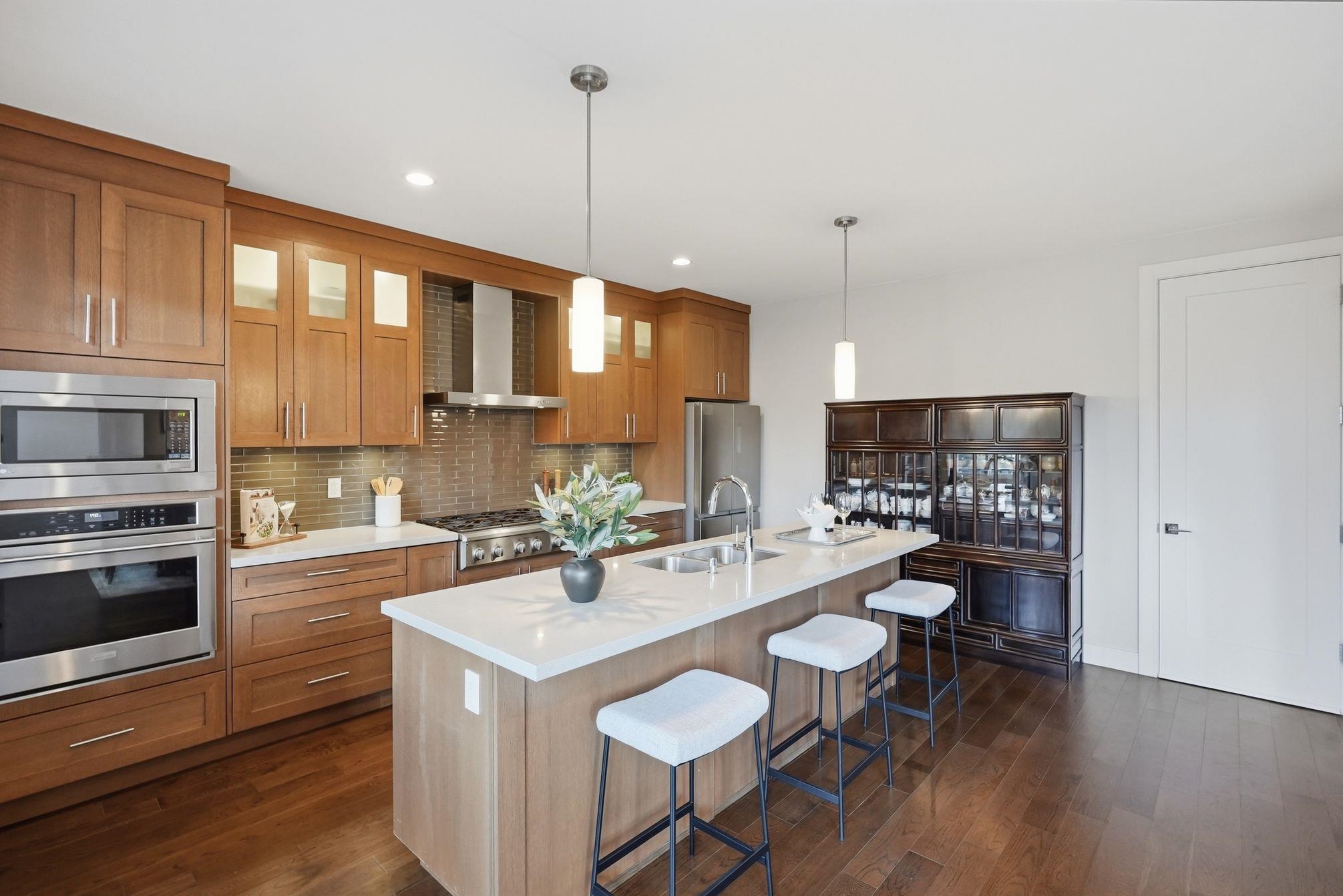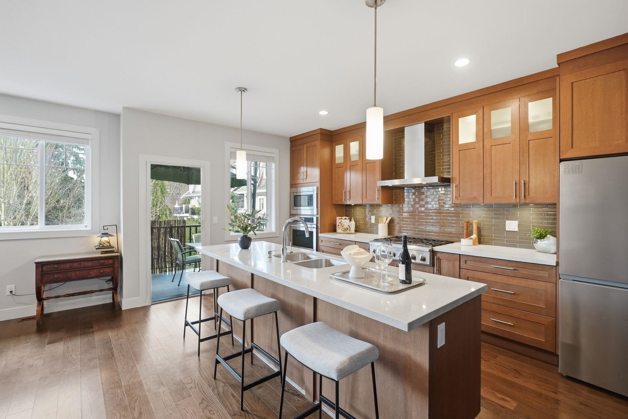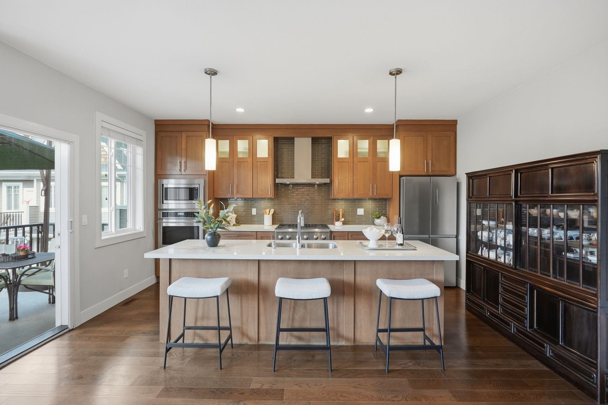 Luxurious 3,000 sq ft 5 bdrm, 3.5 bath corner townhome at Blu Living! Privately situated w/ fully fenced yard backing onto greenspace. Spacious 3-level layout w/ 9’ ceilings, wood plank flrs & quality finishings throughout. Gourmet kitchen feat S/S appls, commercial grade 6 burner gas cooktop, quartz counters, large island & walk-in pantry. Custom shelving, detailed moldings & upscale touches throughout. Upper level offers 4 generous bdrms incl primary retreat w/ relaxation-inspired ensuite & jetted soaker...