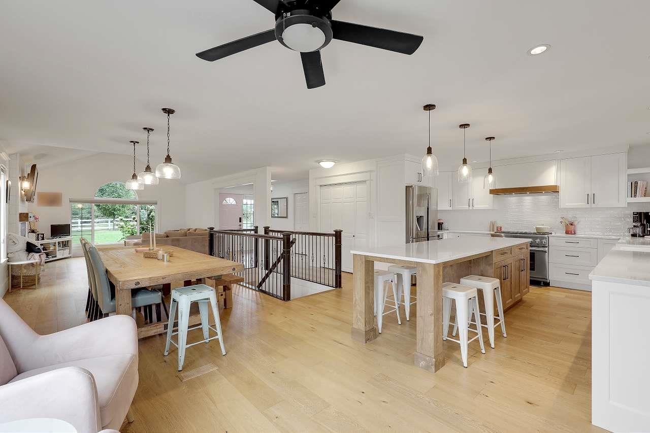 RARE!!! Rancher W/O Bsmt HUGE 70'x45' SHOP on private, flat 5.27 acres plus coach house & mobile home. This level entry home has been completely remodeled on main floor, all new hardwood, bright open kitchen, new cabinets, counters, appliances, updated baths, huge covered deck overlooking pool with auto safety cover, large concrete patio and pool house. Bsmt does have kitchen. Massive 70’x45’ insulated detached shop, includes 1148 sq ft 2 bedroom coach house, plus loads of storage, side bay, shop can easily...