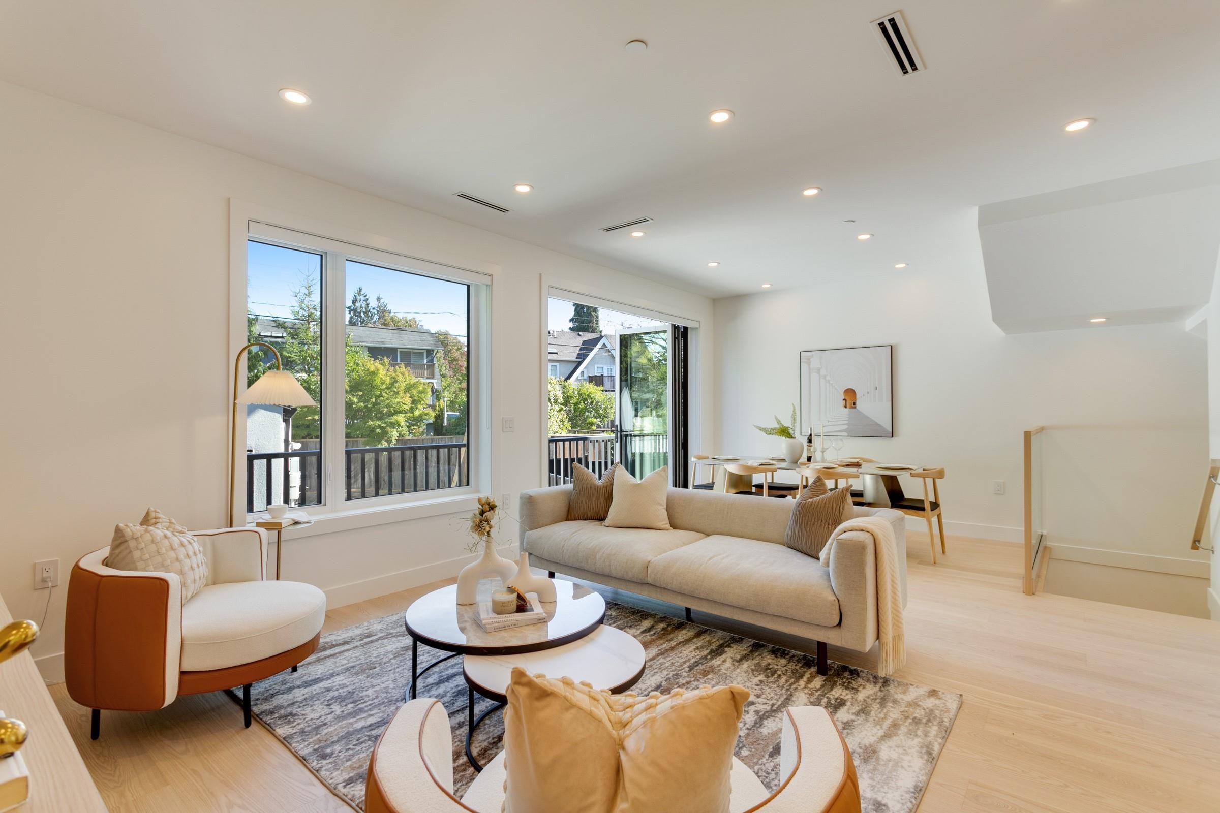 Quiet and modern brand new 1/2 duplex in central location facing Arbutus Greenway. 'ACM' metal facing and metal wood looking soffit. 9' ceiling on each floor including basement. Bright and spacious layout. High quality finishing throughout. Elegantly designed for 75" TV wall wood cabinet in Living Room. Fisher & Paykel kitchen appl on Main. Wok kitchen. Wine cooler. Foldable sliding door to the deck. Flex/Bdm w/ ensuite and a Den on Main. 2/F 3 bedrooms all ensuited. Basement has 2 bdms legal suite for mort...
