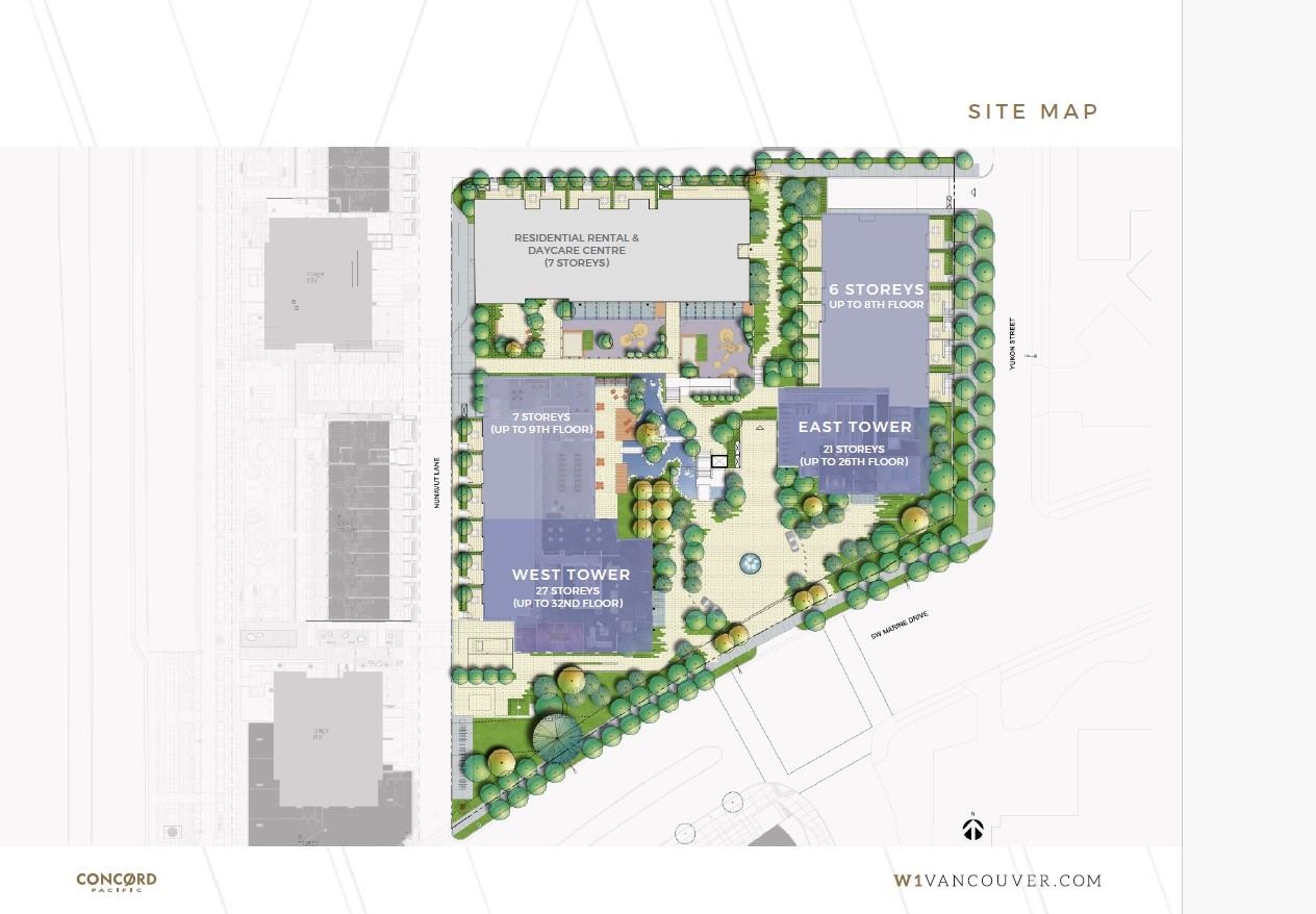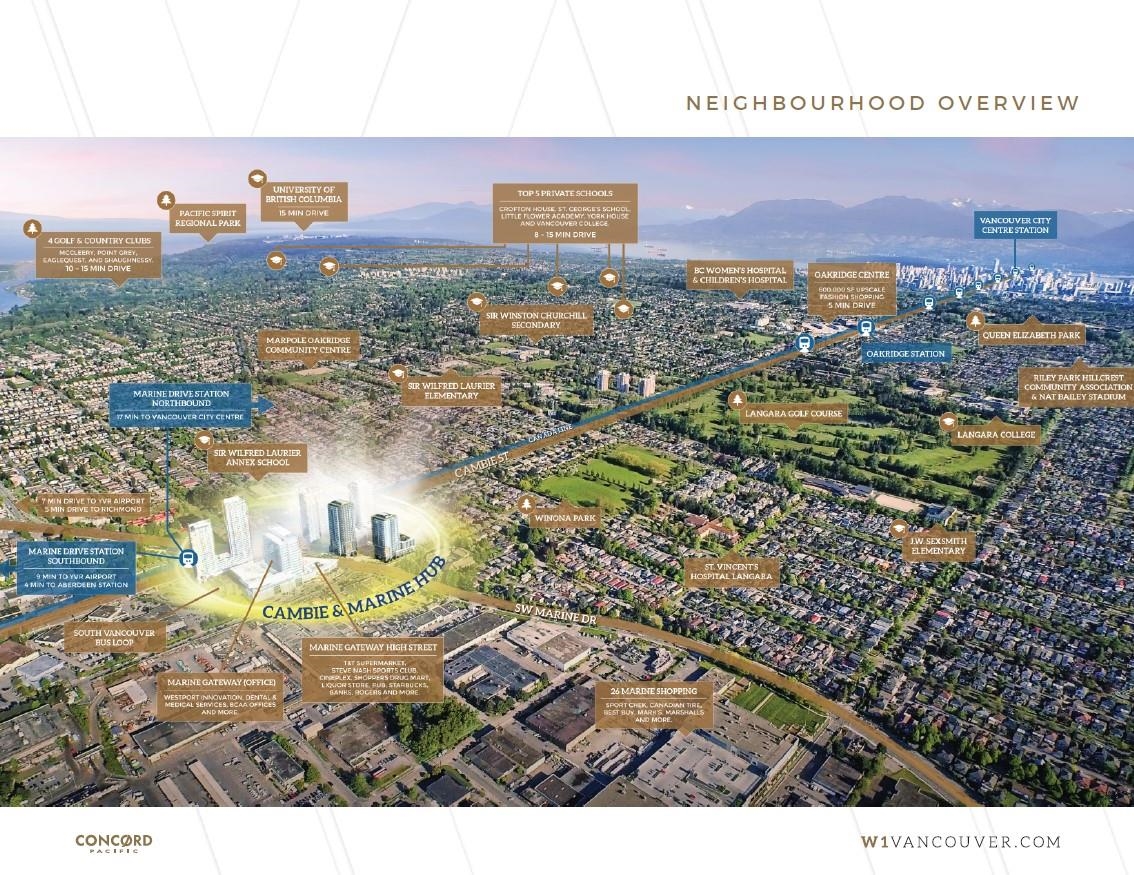 Best deal $/sqft Cambie & Marine! W1 by Concord Pacific! Large 2 level 2 bedroom and den. Sleek design, functional, A/C, wide plank hardwood flooring, gourmet kitchen with Miele appliances, deluxe bathrooms with marble tiles. Flex room den/office on main! Street entry & in building access. Fast access to parking. Amenities: 24/7 concierge, gym, yoga/ping pong room, theatre room, meeting room, banquet hall & more! Daycare next door. Walk across the street to Marine Gateway: T&T, Winners, Shoppers, Starbucks,...