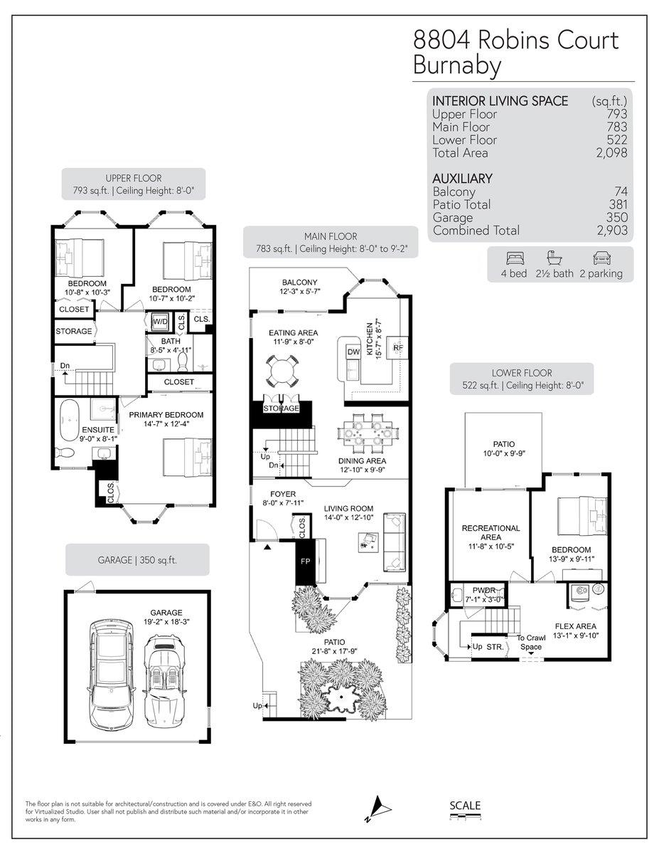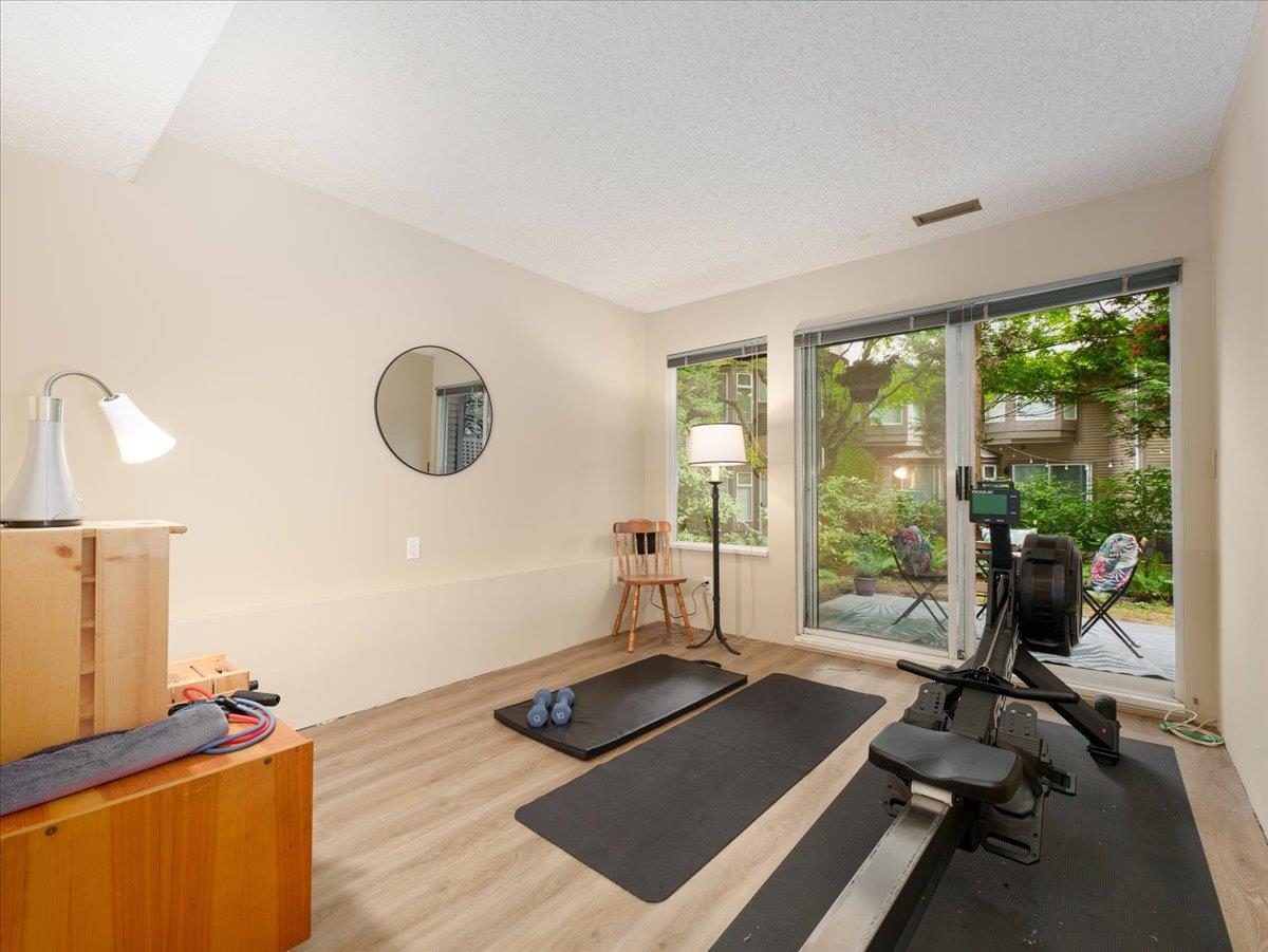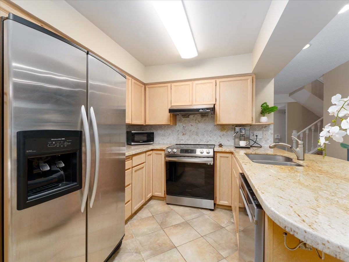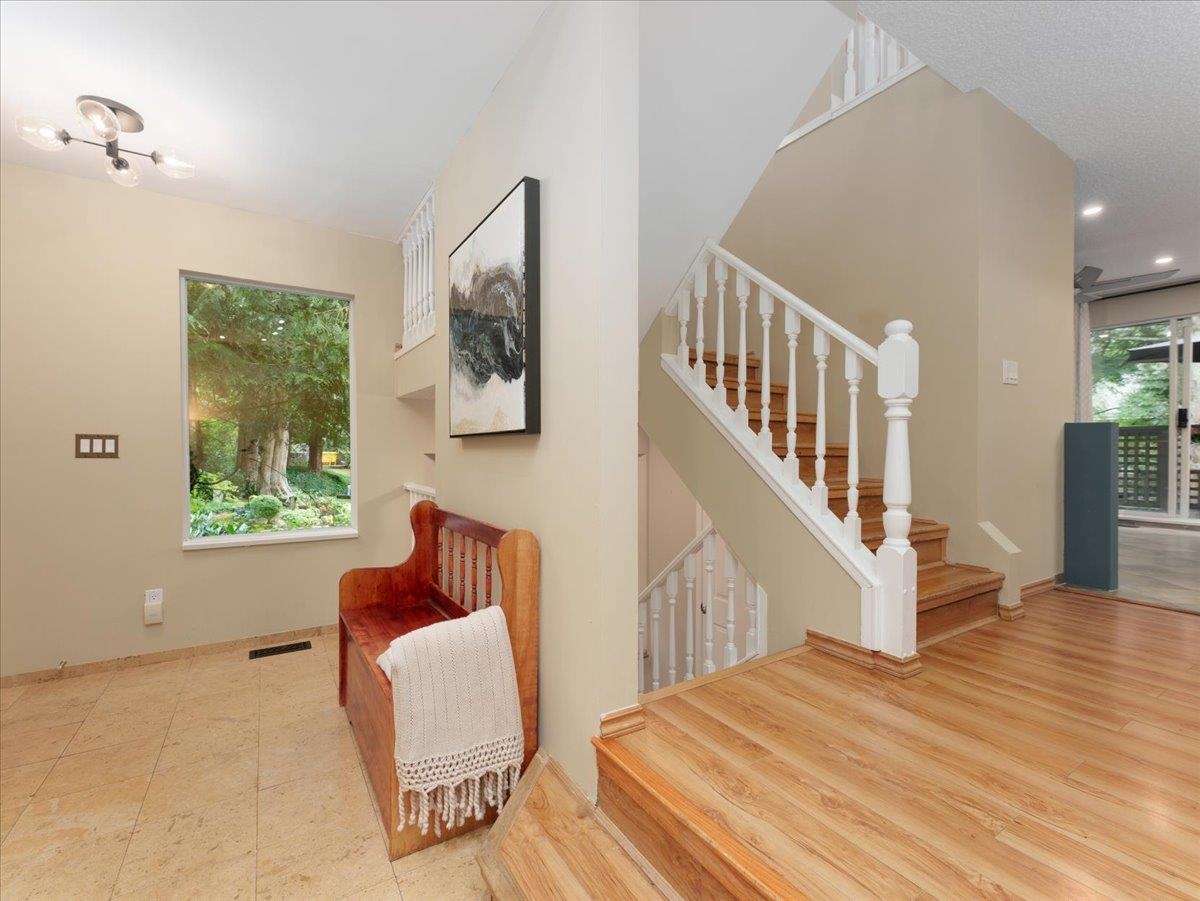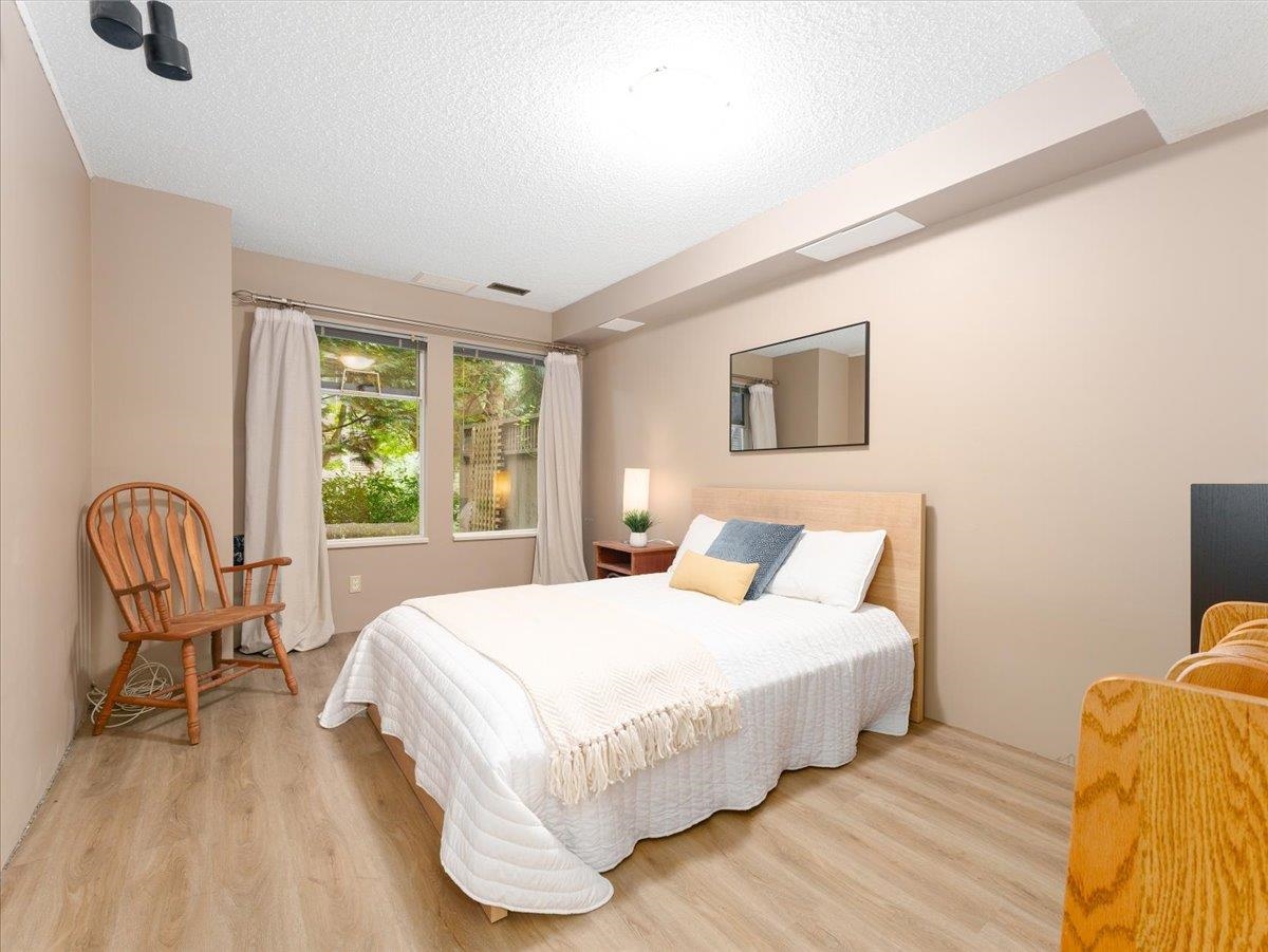 House sized 2098 sft corner townhome w/ 4 beds & 3 baths in a tranquil natural setting. Rare 350 sft detached double garage + 2 car pad, front/side/back gardens, 380 sft total patio space & 74 sft balcony off kitchen for BBQ's & morning coffee. Large principle rooms, bay windows, family-size kitchen w/new DW & stove, wood fire place, updated primary bath w/ waterfall shower & free-standing tub. 4th bed below for in-laws, SFU students or combine for larger rec. room. Plenty of storage w/ large crawl space. P...