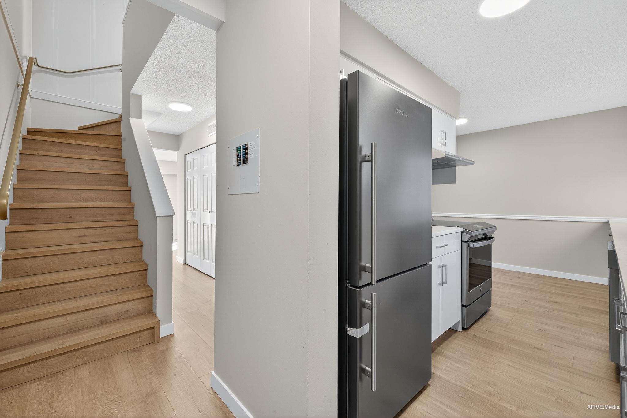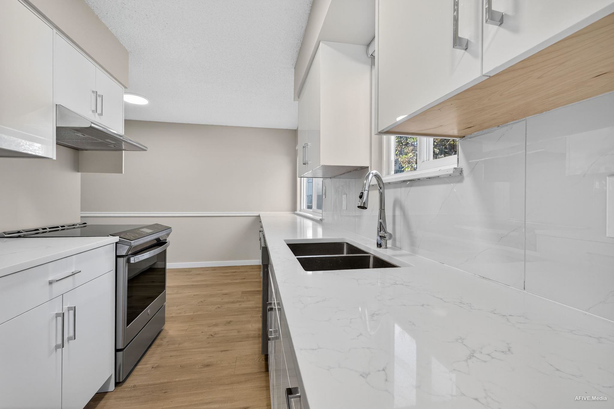 Fully renovated 3-bedroom + den, two-storey END UNIT in a prime location—perfect as a family home or investment property! This home features a brand new kitchen, new flooring, modern appliances, zebra blinds, and a stylish, fully updated interior. Enjoy the convenience of being within walking distance to restaurants, schools, the rec center, hospital, and Townsend Park. Low strata fees and rentals allowed make this an ideal opportunity. Easy to show.