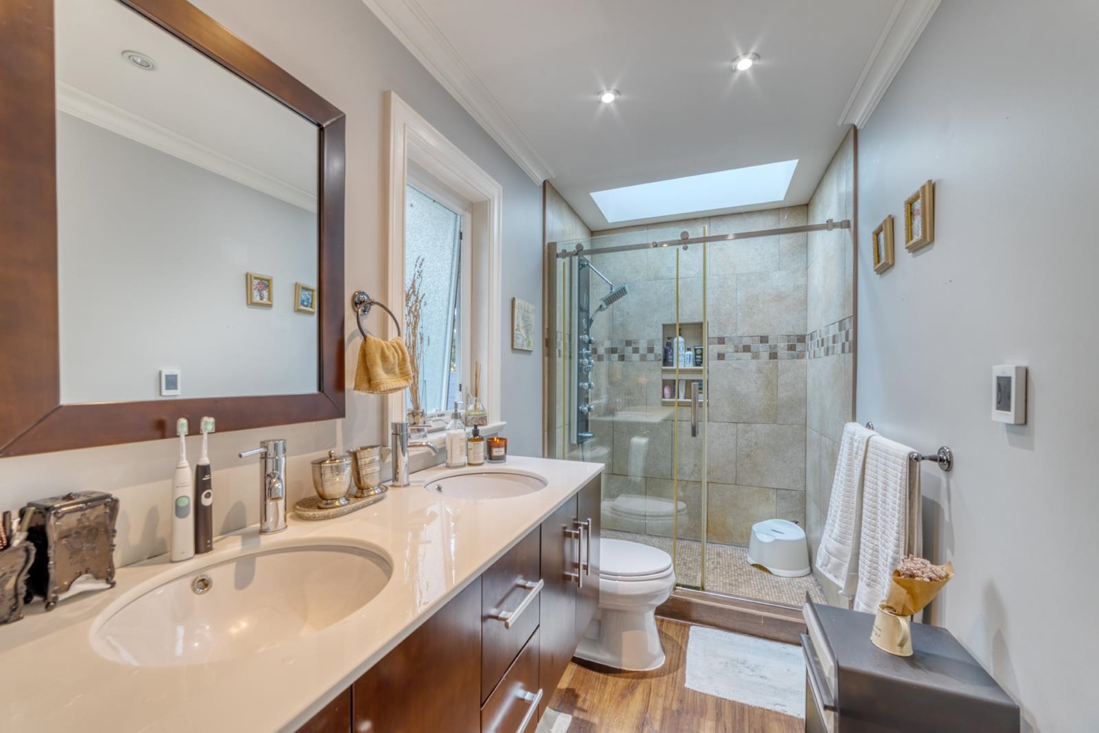 Discover this 3,530 sqft gem in Coquitlam West, a serene sanctuary designed for elegance and entertainment. With 3 levels, 5 bedrooms, and 4 bathrooms, it features vaulted ceilings, expansive windows offering views of a lush backyard, and luxurious dark hardwood floors. The chef's kitchen boasts Antique White cabinets, granite counters, and stainless steel appliances, including a double oven and wine fridge. Highlights include two master suites, one with private office access, extensive crown molding, and c...