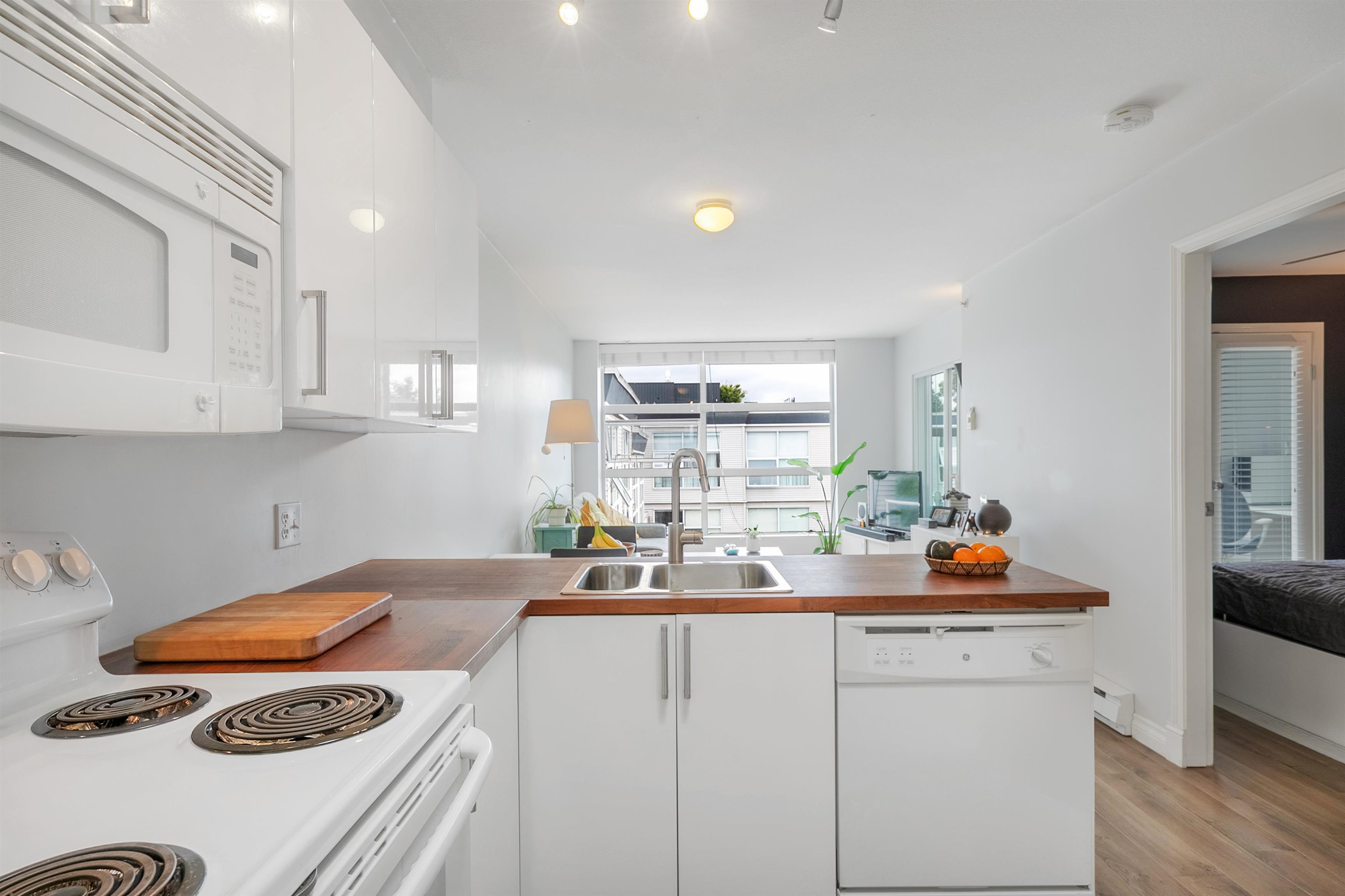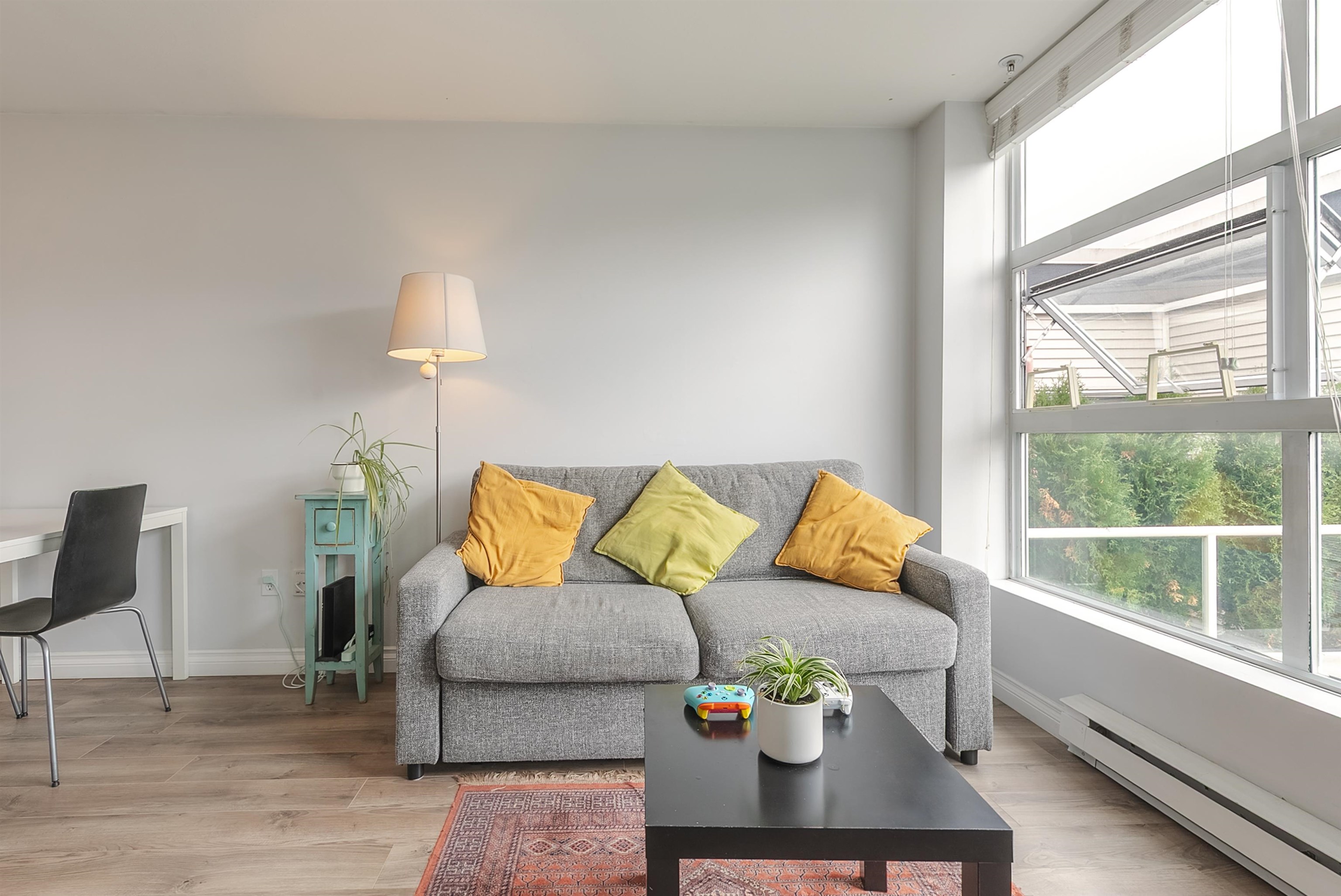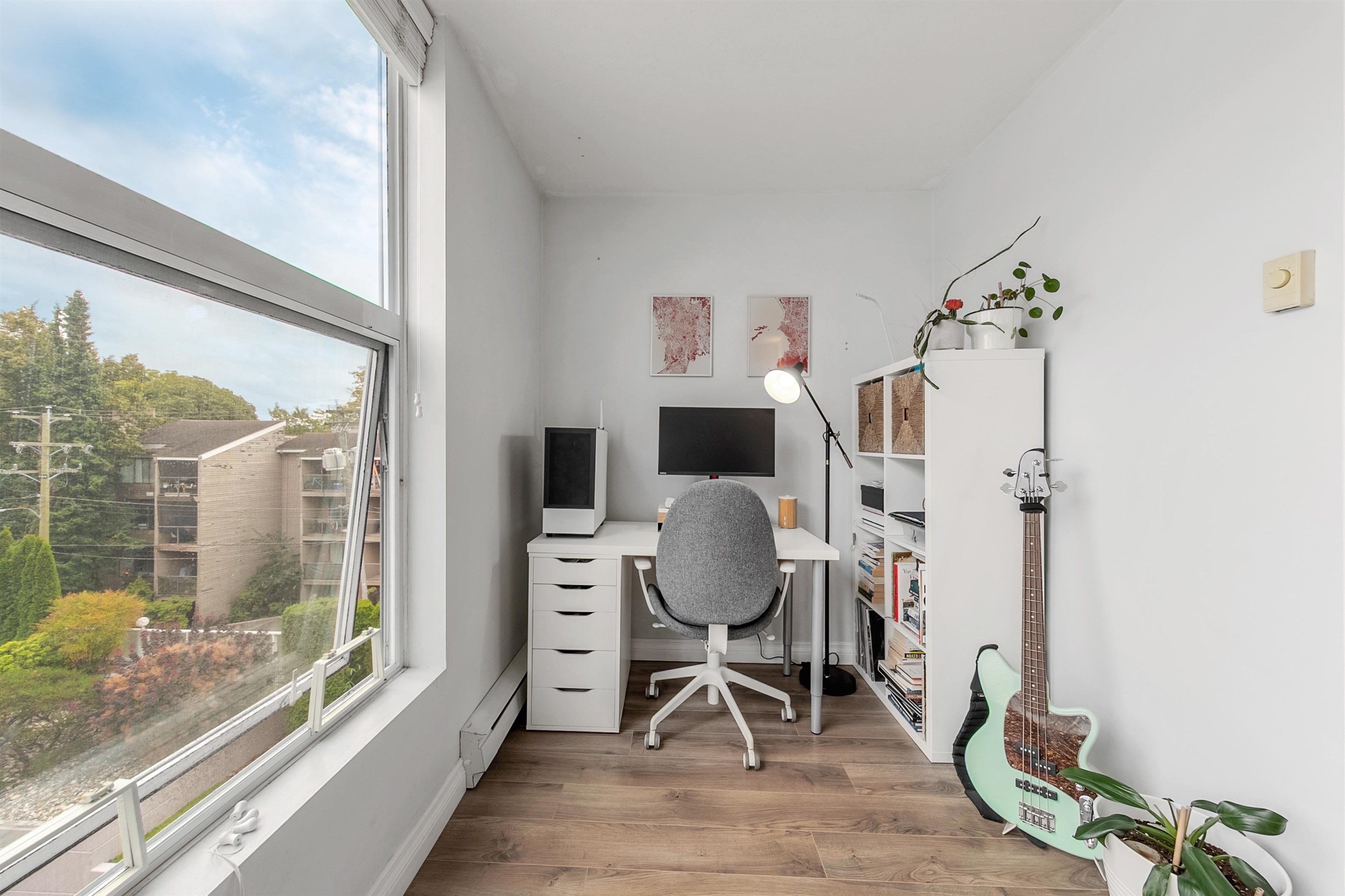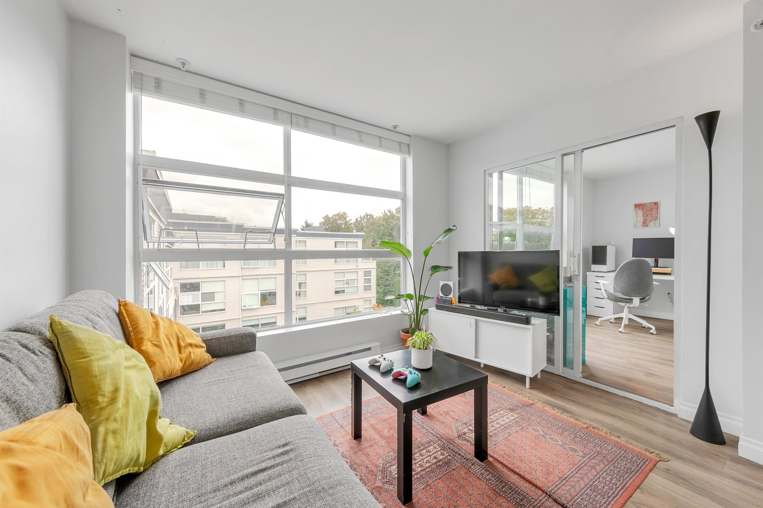 TOP FLOOR, QUIET COURTYARD EXPOSURE, 1 BEDROOM + DEN in this well maintained building and suite that shows pride in ownership. Starting with location you are less than a block from everything! Transit outside the front door, grocery stores, boutiques and restaurants. Soon to be a block from the newest skytrain station servicing Broadway. East facing, bright top floor overlooking the lush courtyard below from your open plan living area and large window-filled den space, perfect home office or flex (11 x 7)...