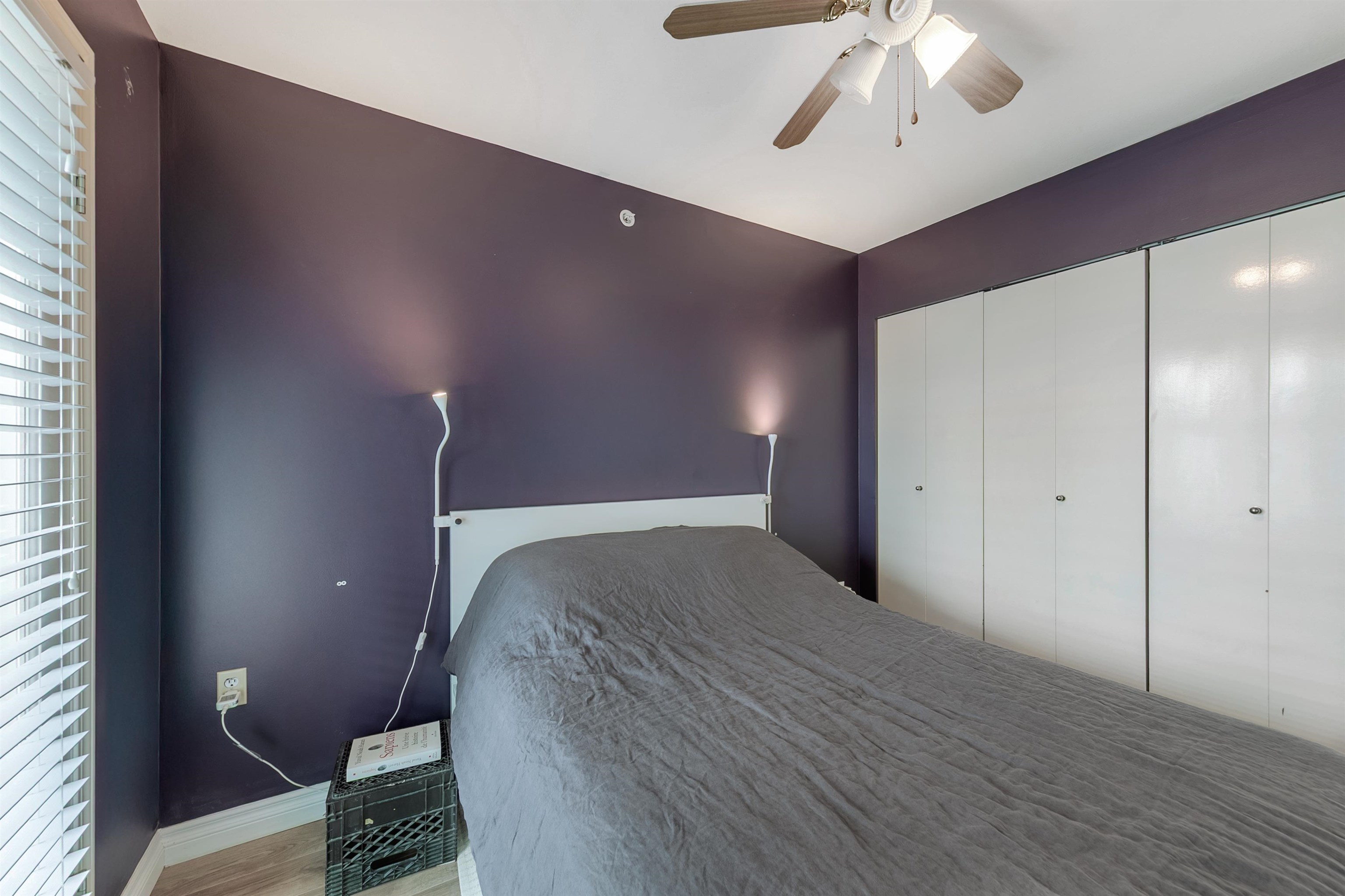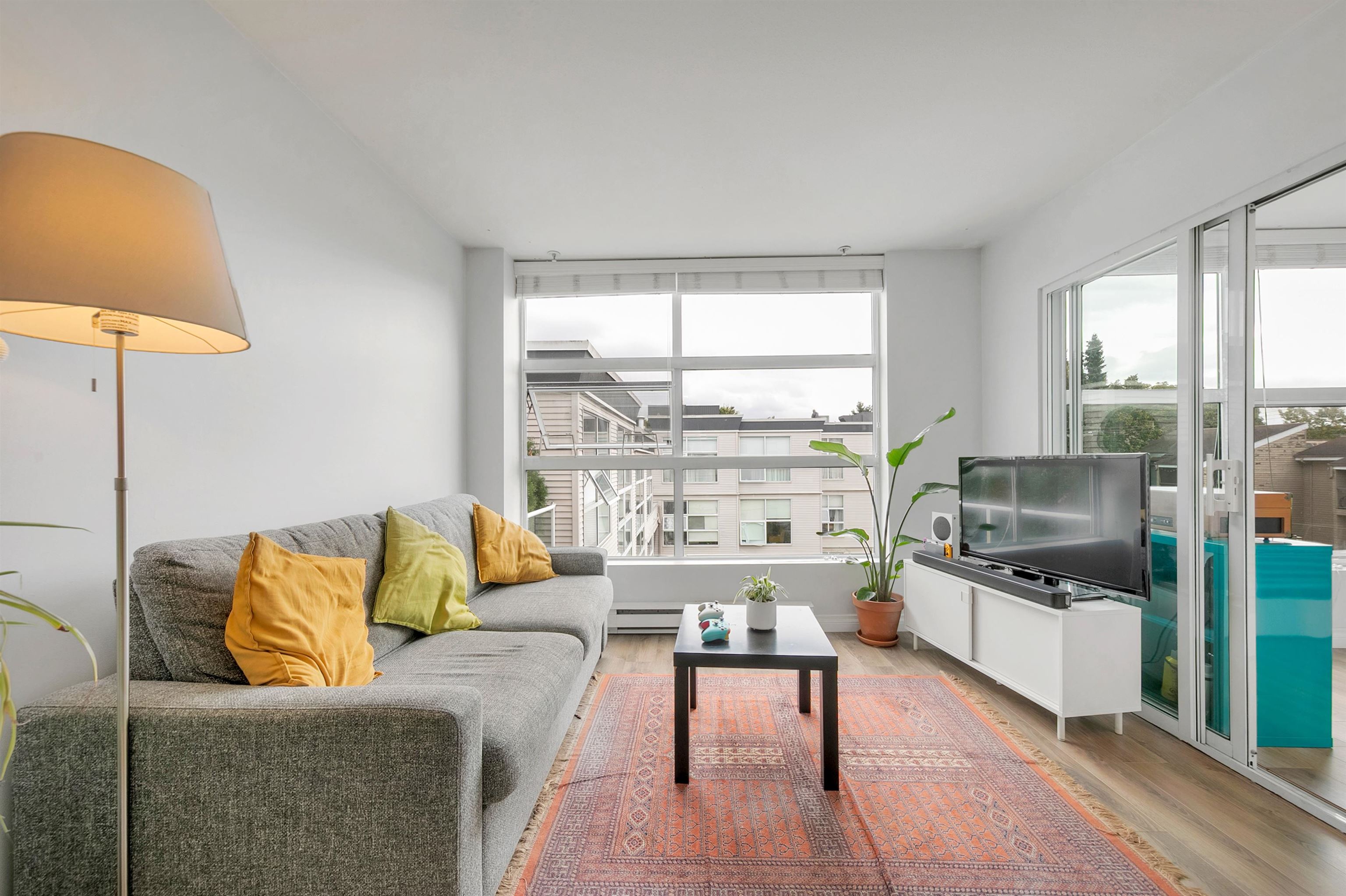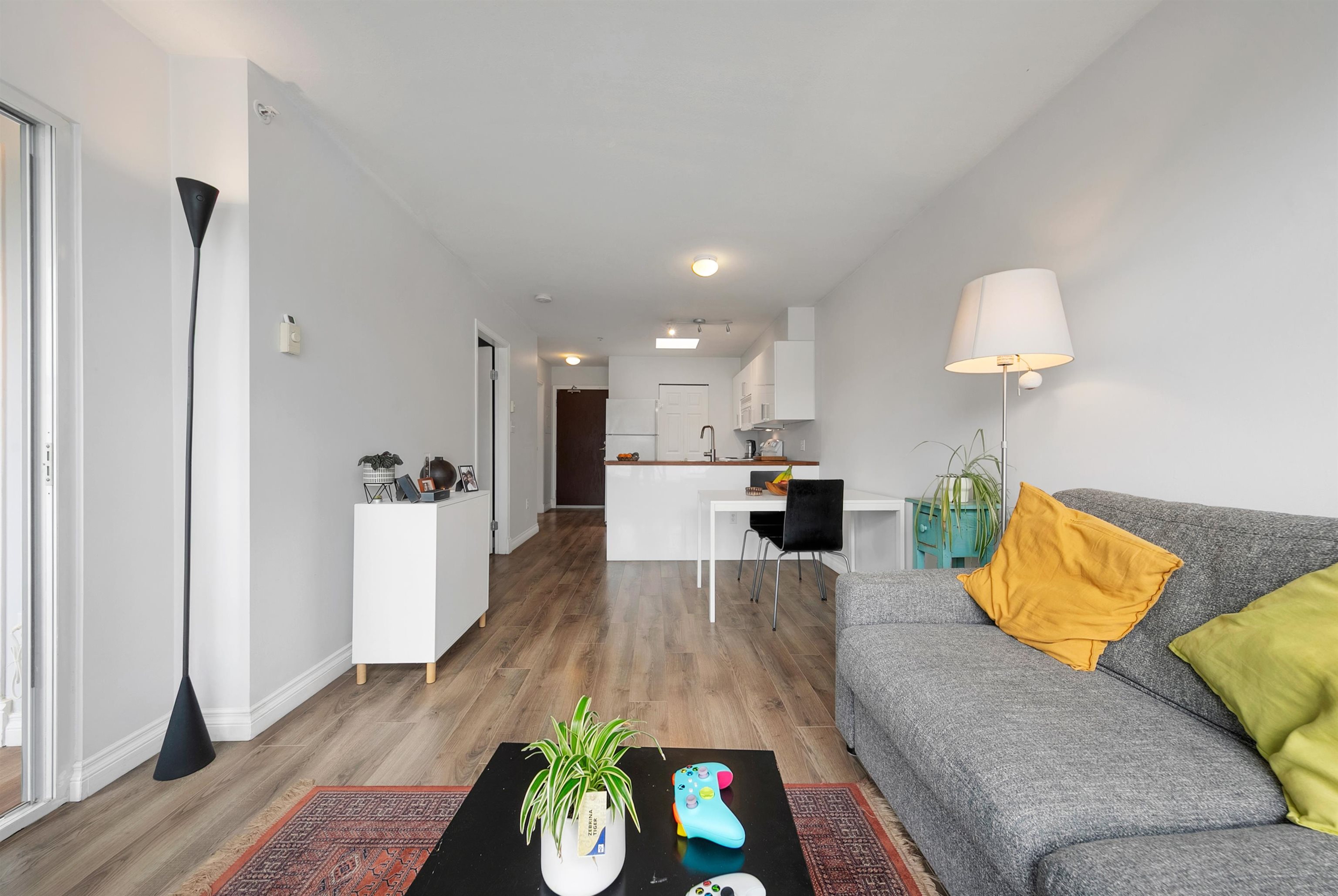 TOP FLOOR, QUIET COURTYARD EXPOSURE, 1 BEDROOM + DEN in this well maintained building and suite that shows pride in ownership. Starting with location you are less than a block from everything! Transit outside the front door, grocery stores, boutiques and restaurants. Soon to be a block from the newest skytrain station servicing Broadway. East facing, bright top floor overlooking the lush courtyard below from your open plan living area and large window-filled den space, perfect home office or flex (11 x 7)...