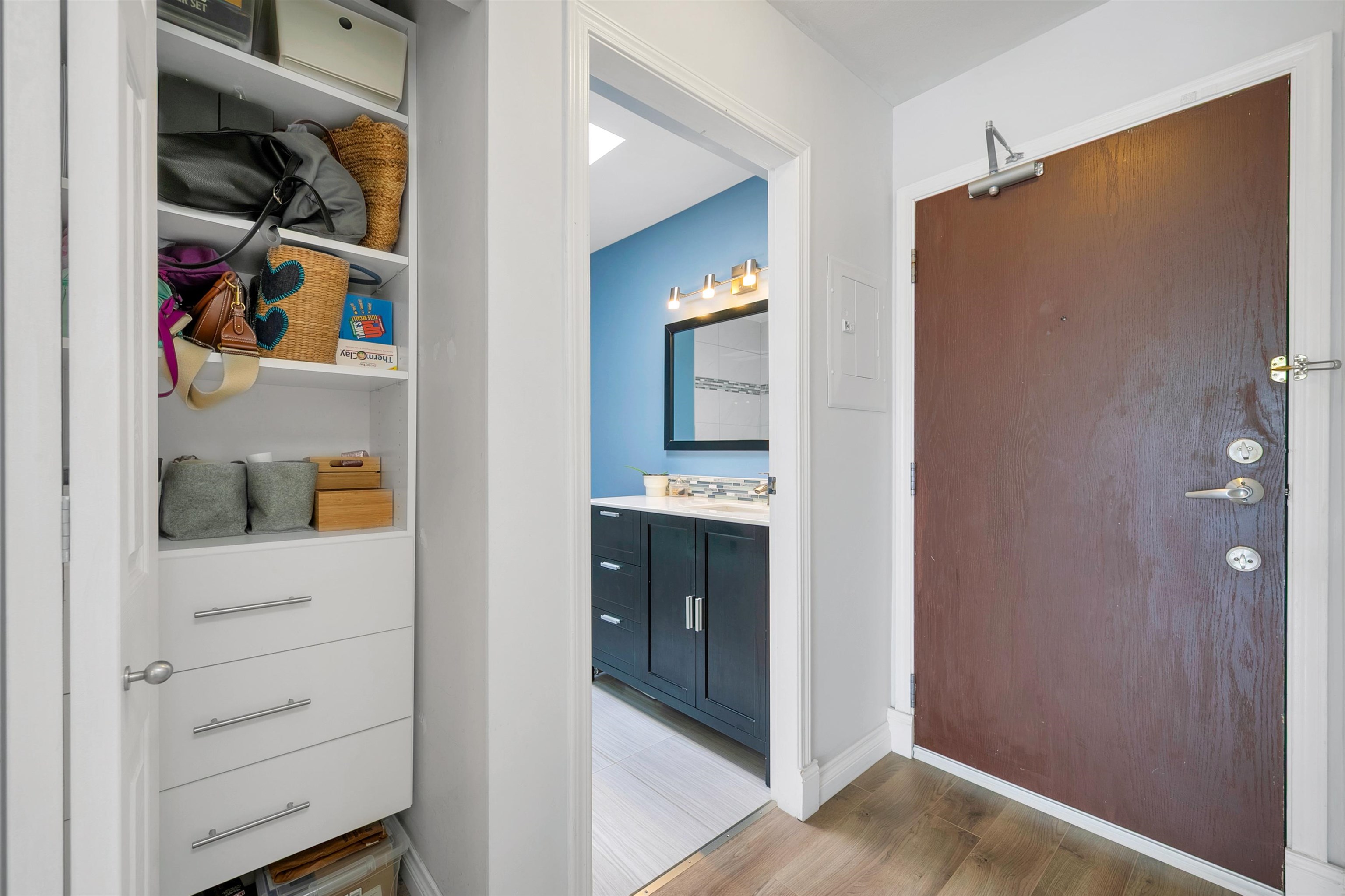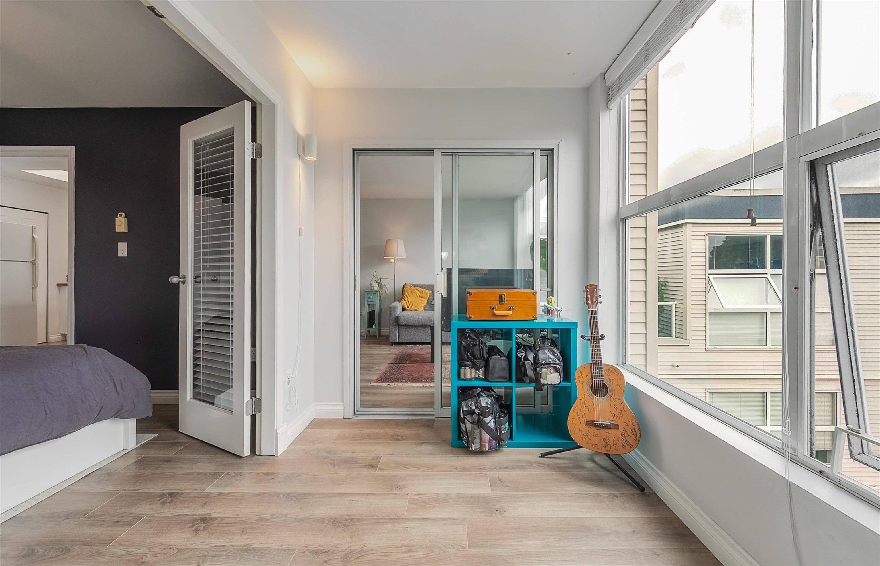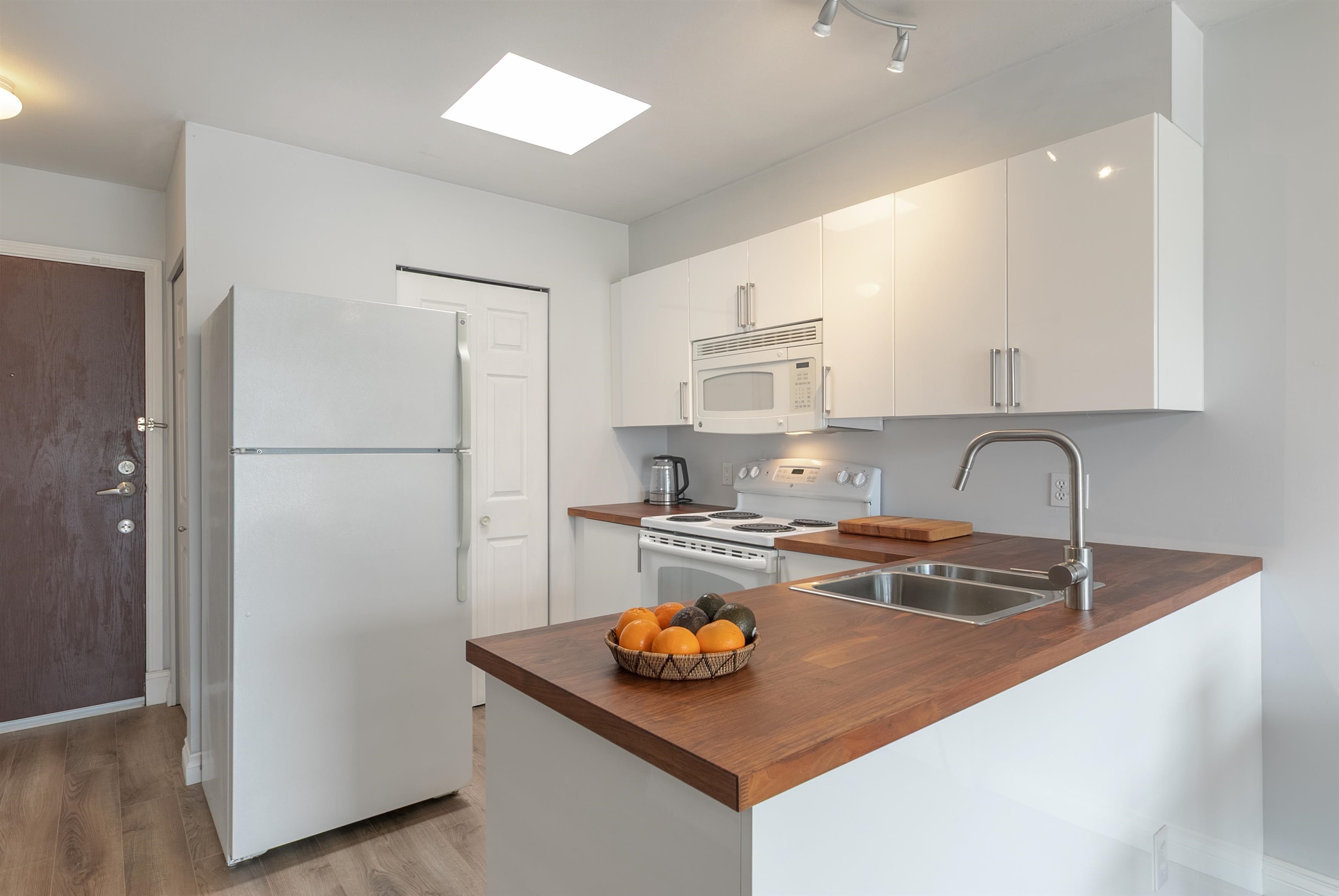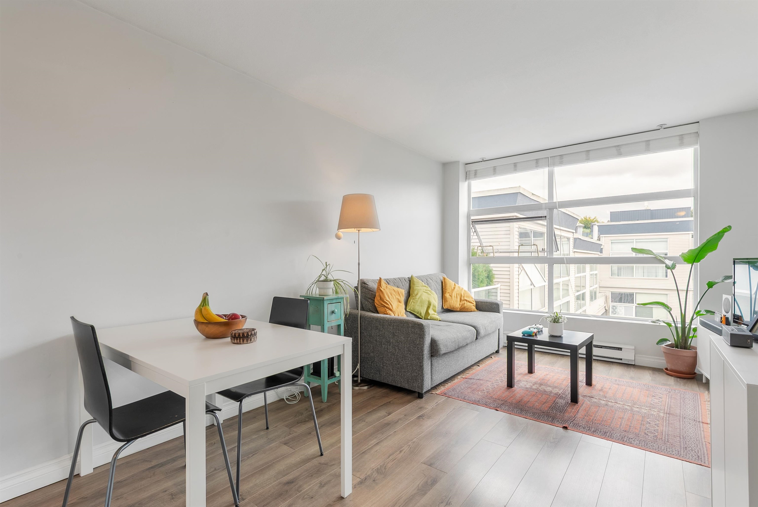 TOP FLOOR, QUIET COURTYARD EXPOSURE, 1 BEDROOM + DEN in this well maintained building and suite that shows pride in ownership. Starting with location you are less than a block from everything! Transit outside the front door, grocery stores, boutiques and restaurants. Soon to be a block from the newest skytrain station servicing Broadway. East facing, bright top floor overlooking the lush courtyard below from your open plan living area and large window-filled den space, perfect home office or flex (11 x 7)...