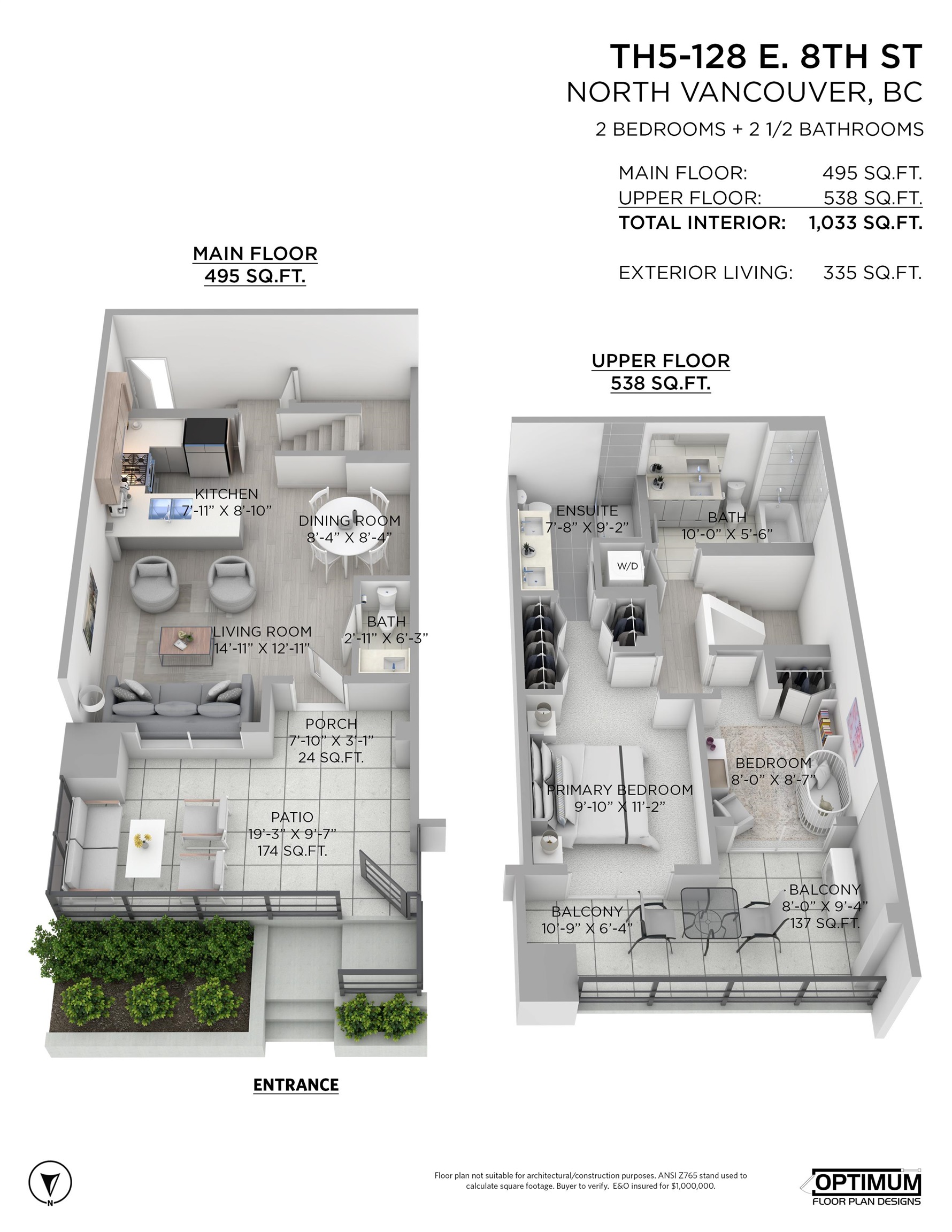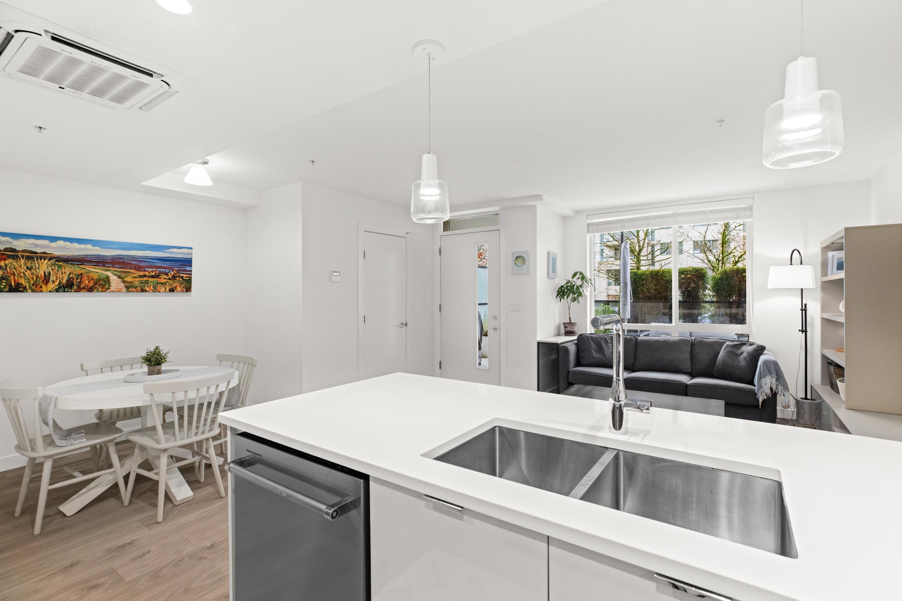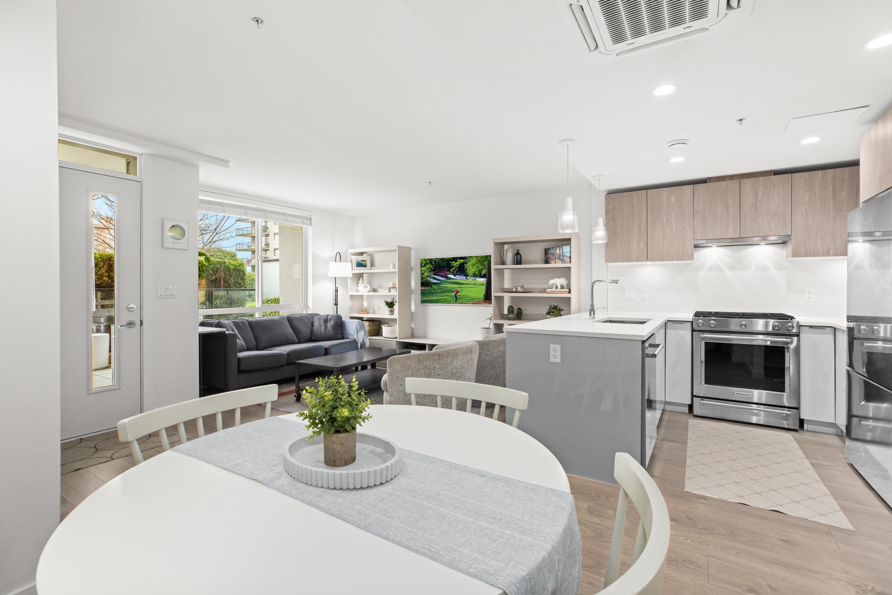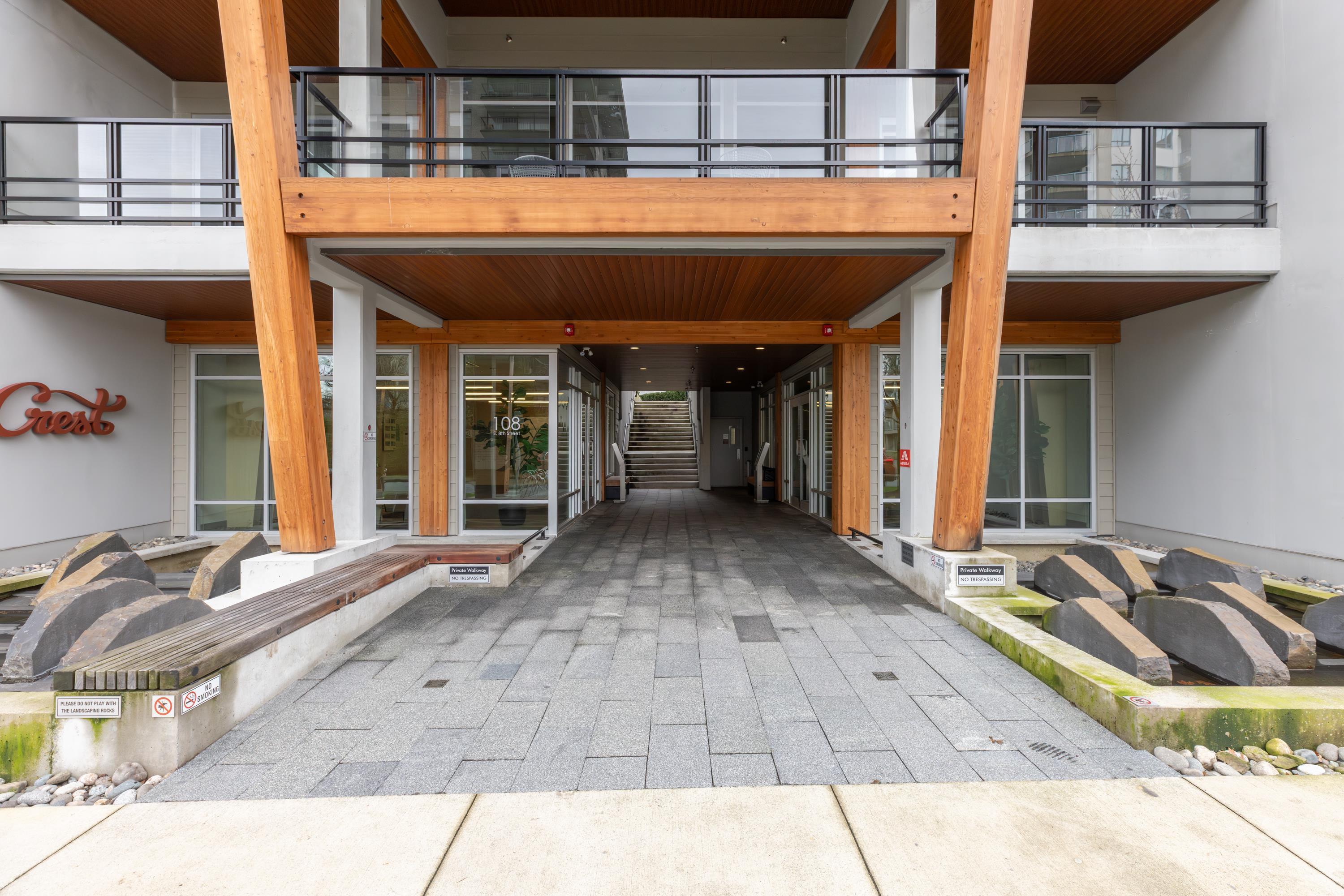 Garden level townhome at 'The Crest' by Adera. This well-laid-out, two-level concrete home features a great layout and design, offering over 1,000 sq. ft. of interior space, 2 bedrooms, 3 bathrooms, two generously sized, south-facing patios, and air conditioning throughout. Located on a dead-end street on the 'Crest' of Lonsdale - a short stroll to Lower Lonsdale and steps from plenty of shops and restaurants. This 5 year old complex is well built and well managed; it also includes a beautiful social lounge...